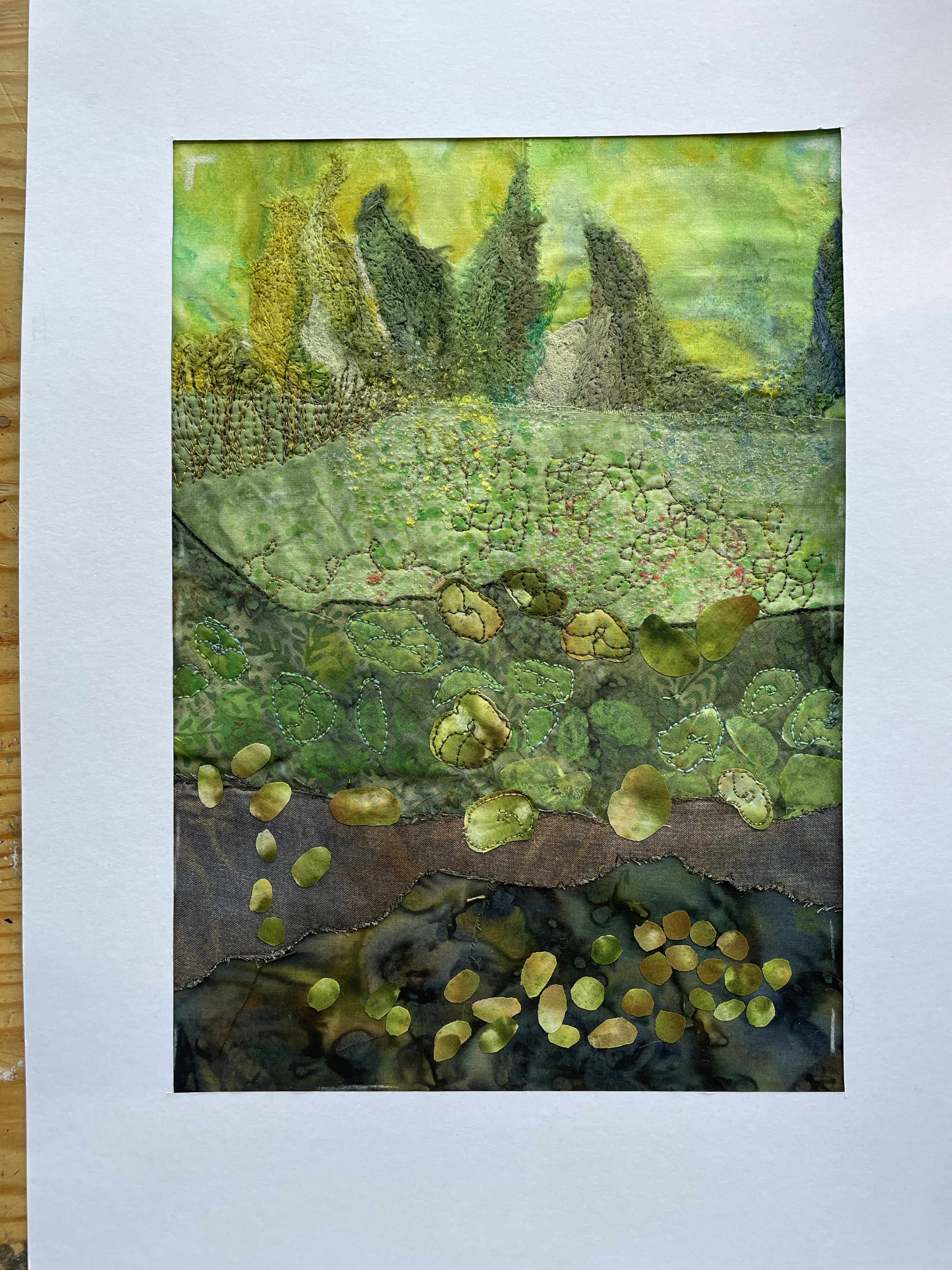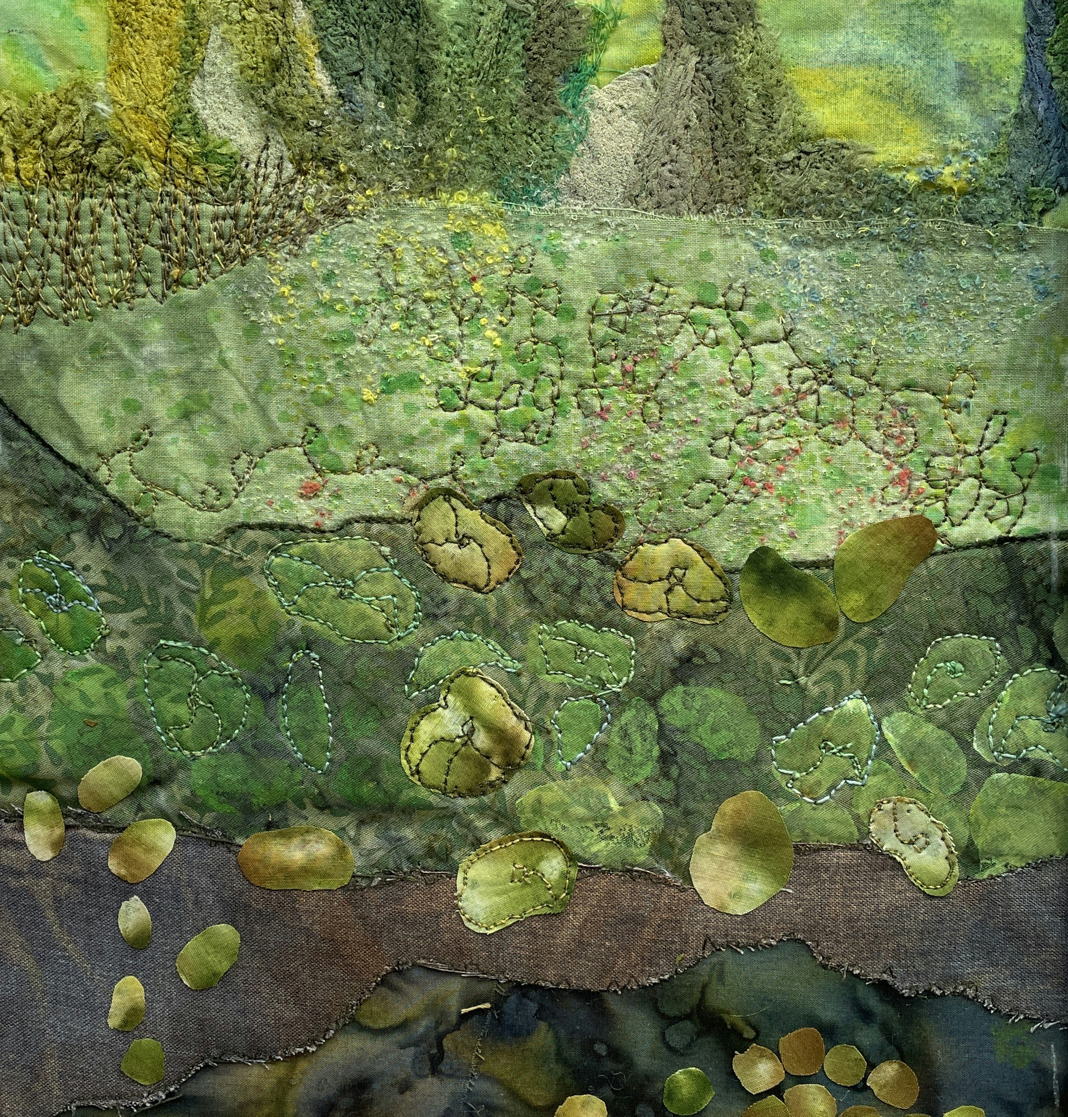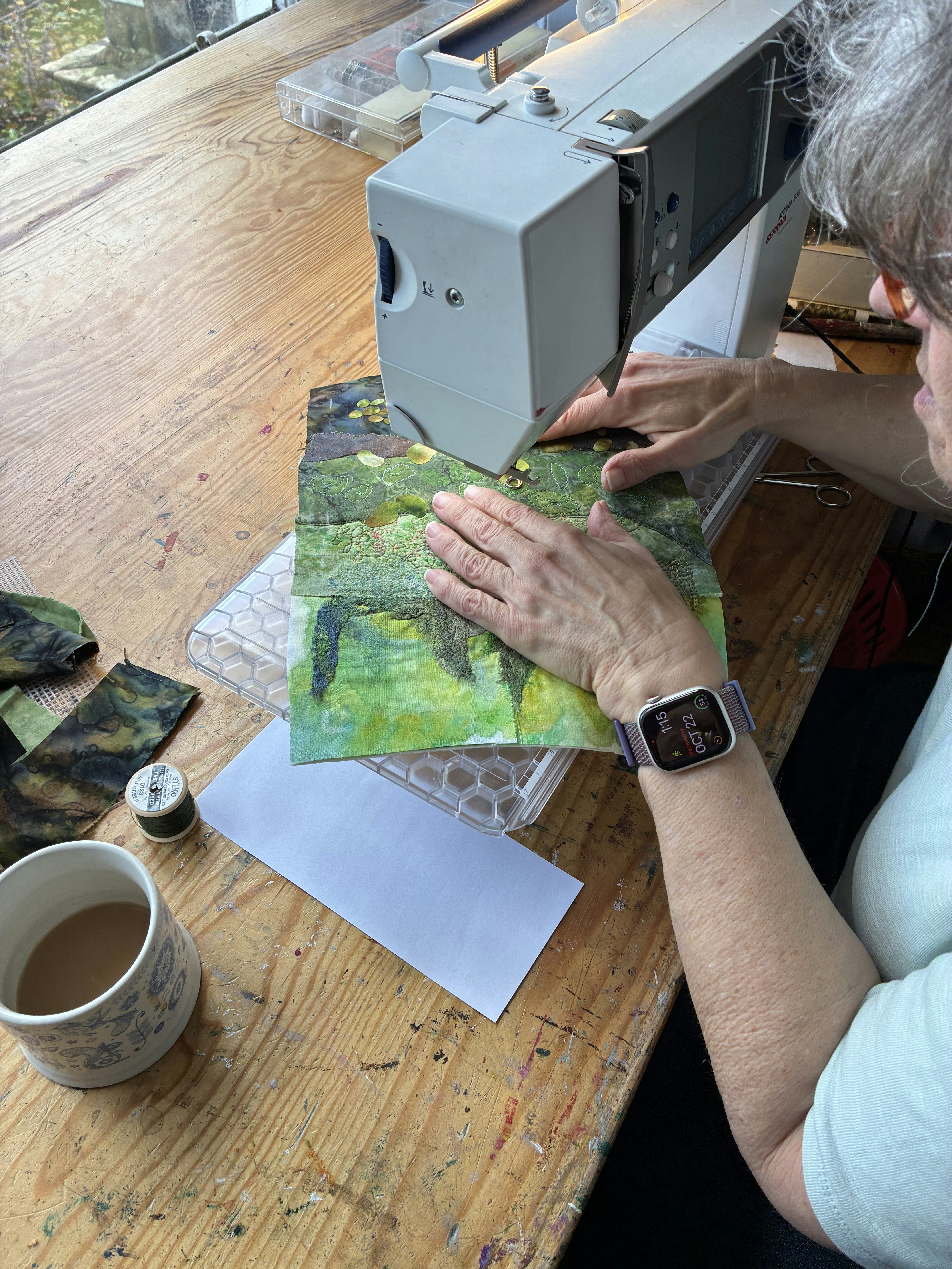 Sketchbooks play an important role in her practice to gather inspiration from the beauty of the Scottish landscape that surrounds her. Her work is often highly colored and figurative but combines abstract elements from nature. She uses many techniques in her practice, including collage with hand dyed fabrics, where she uses printed paper to build up complex surfaces and then embellishes them further with machine and hand stitch. Machine embroidery is her favorite technique and Alison always feels more confident with a sewing machine. She believes that encouragement is the key to creativity and people learn through experimentation in a relaxed atmosphere.