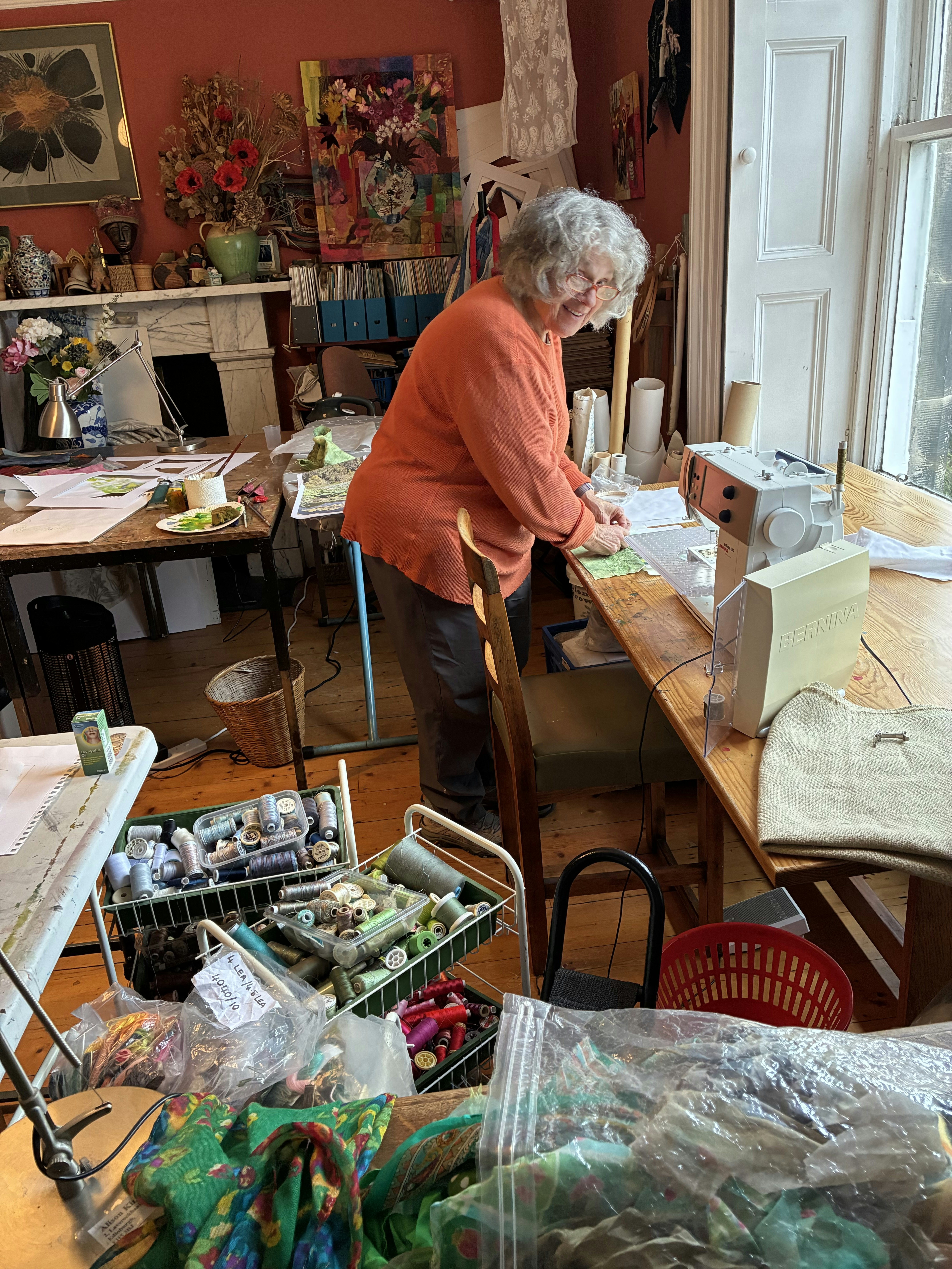 Alison and her husband were so fun! Every morning I made my way to their house and chatted with them over coffee. We then went up to work in Alison's colorful studio. I absolutely adored Alison's mixed media approach to her art, and was really excited to make something together. As we worked she assessed how much I knew about sewing and we were able to start creating a piece of art. The process w Read more