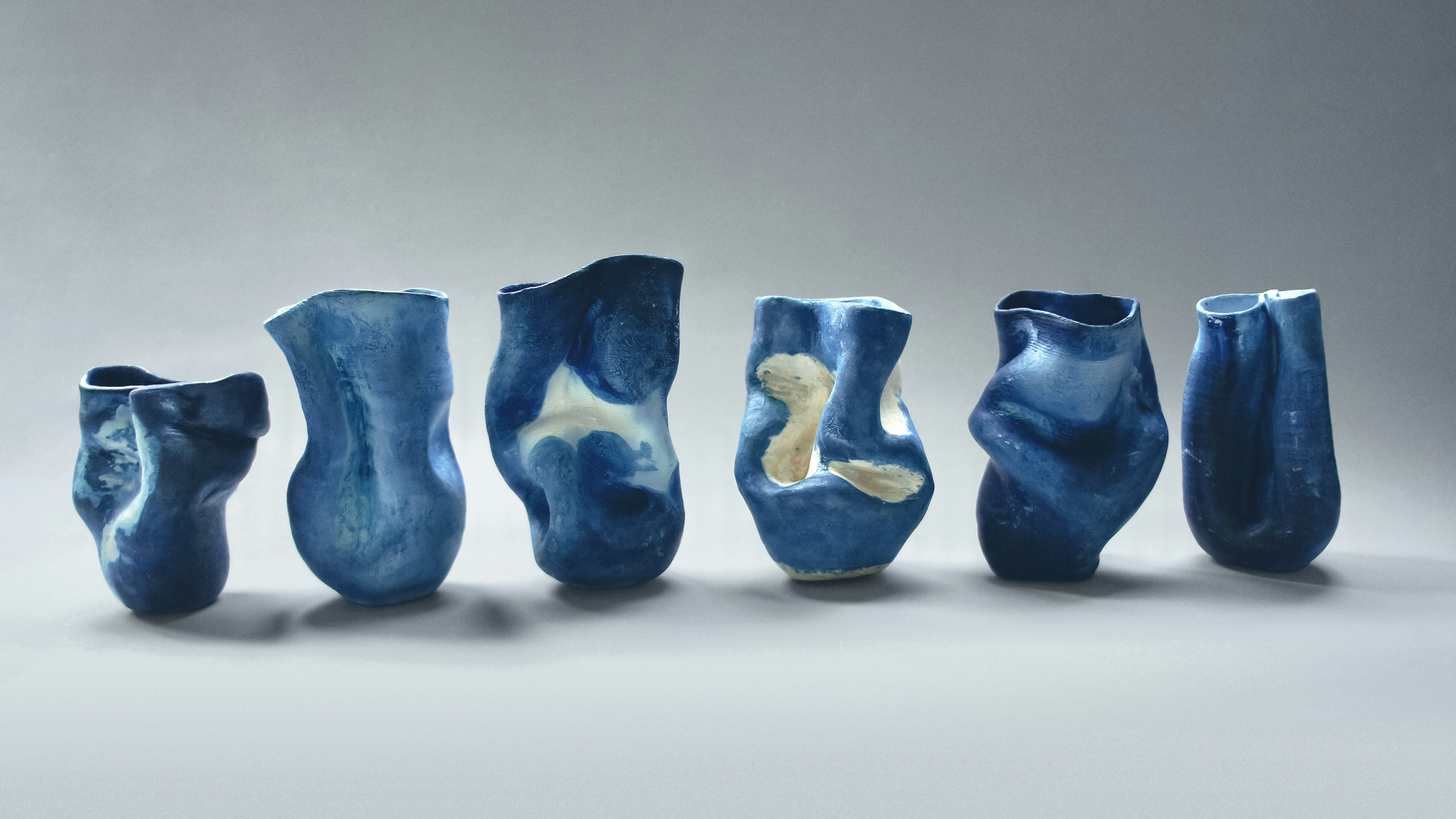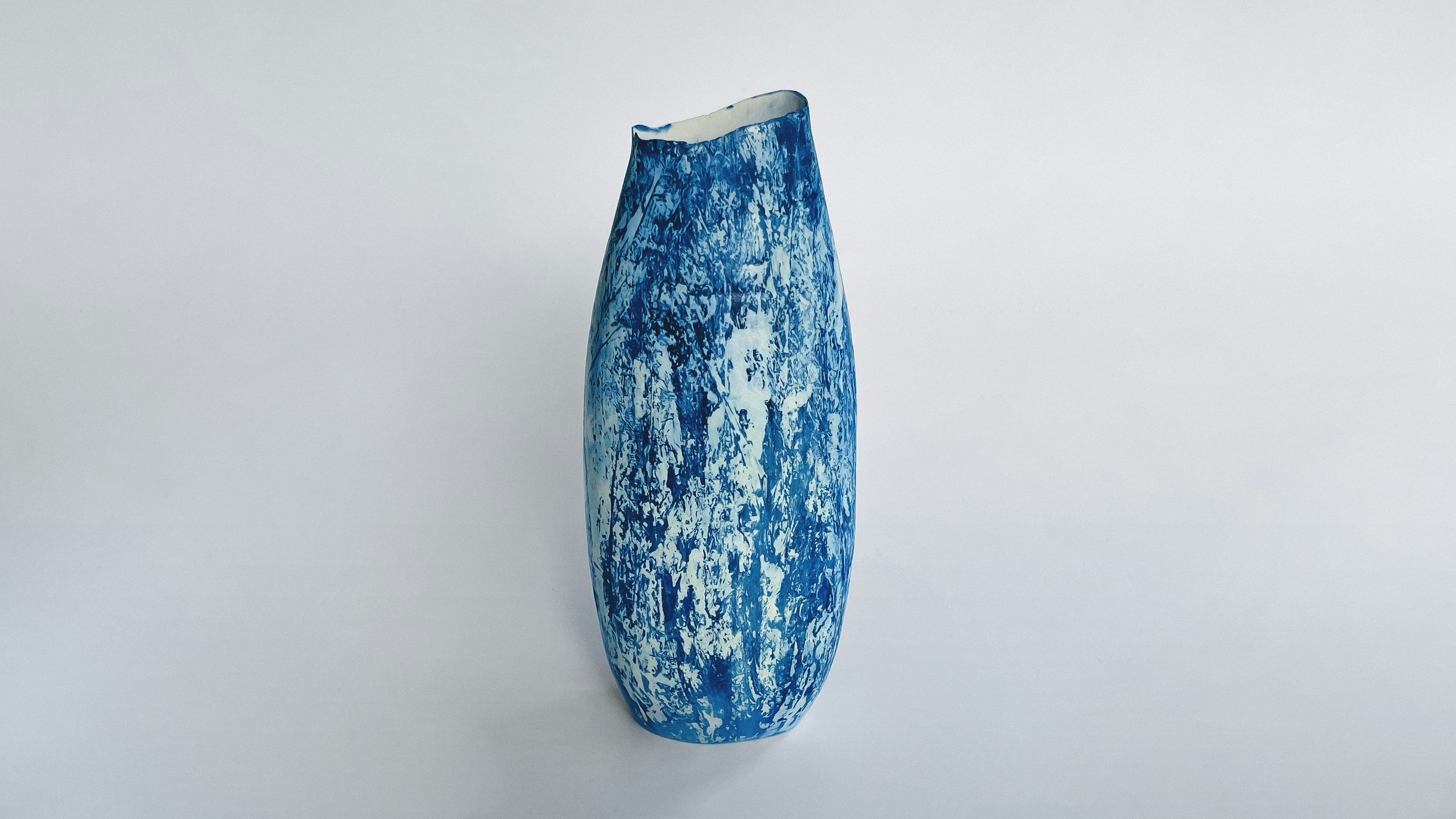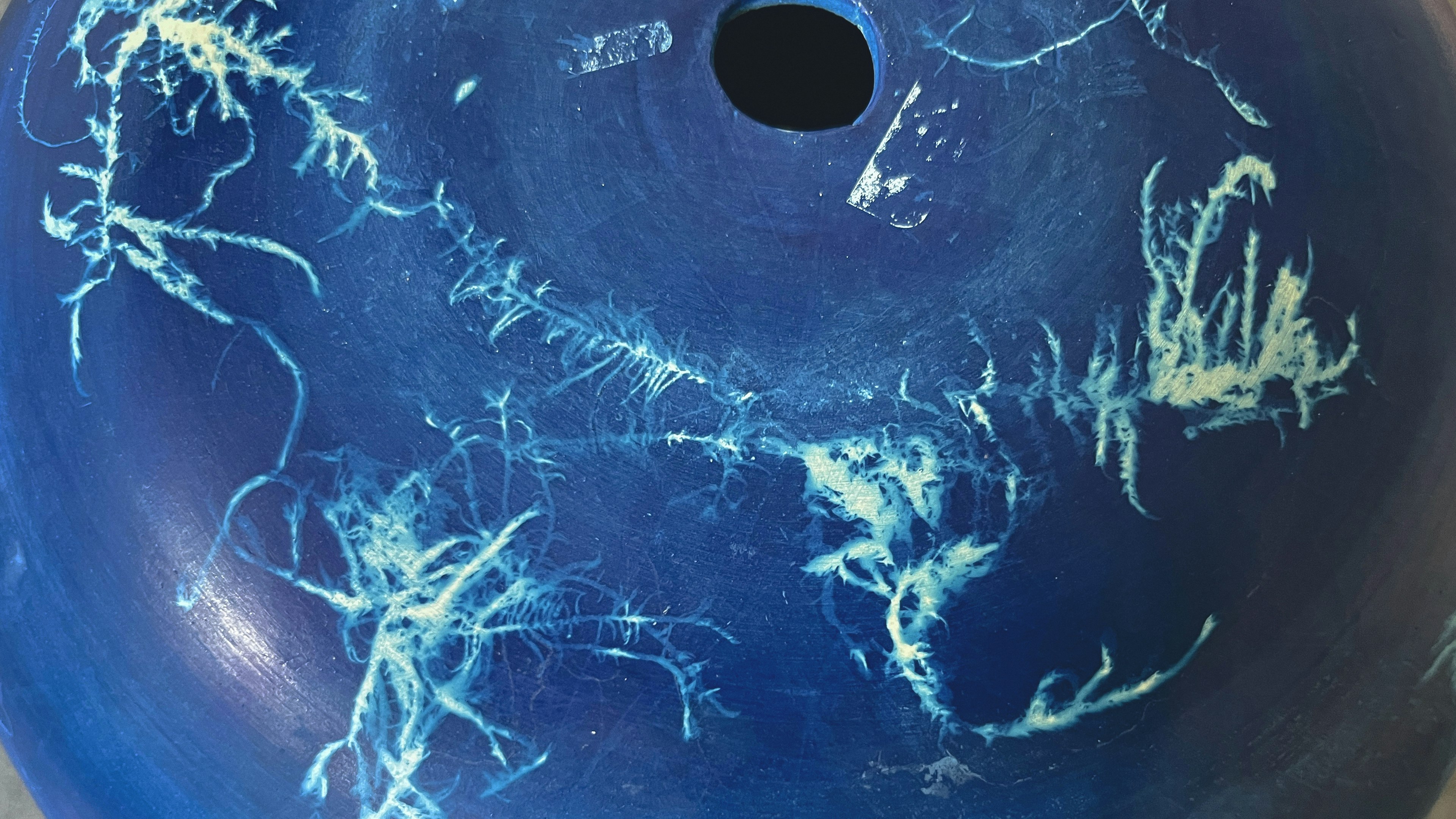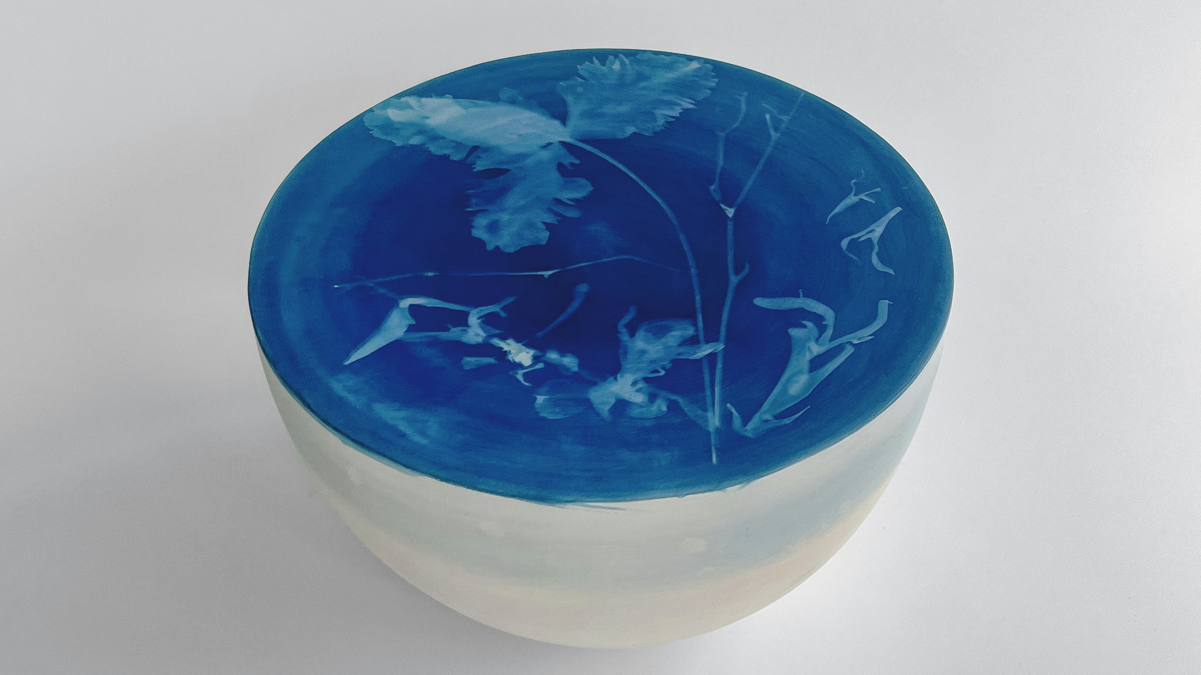 Her porcelain pieces reveal the alchemy of porcelain, fire, smoke, and sunlight. Each piece begins with a simple thrown form, never duplicated, and undergoes its transformation through smoke-firing. She developed a cyanotype technique, where she applies a photosensitive solution to a piece and lets the Dutch sun, pressed flowers, or sand etched into its surface. The result is a deep, living blue that highlights the tension of delicate, unglazed vessels, breathing light. Her work reimagines traditional methods and demands attention, precision, and a little faith.