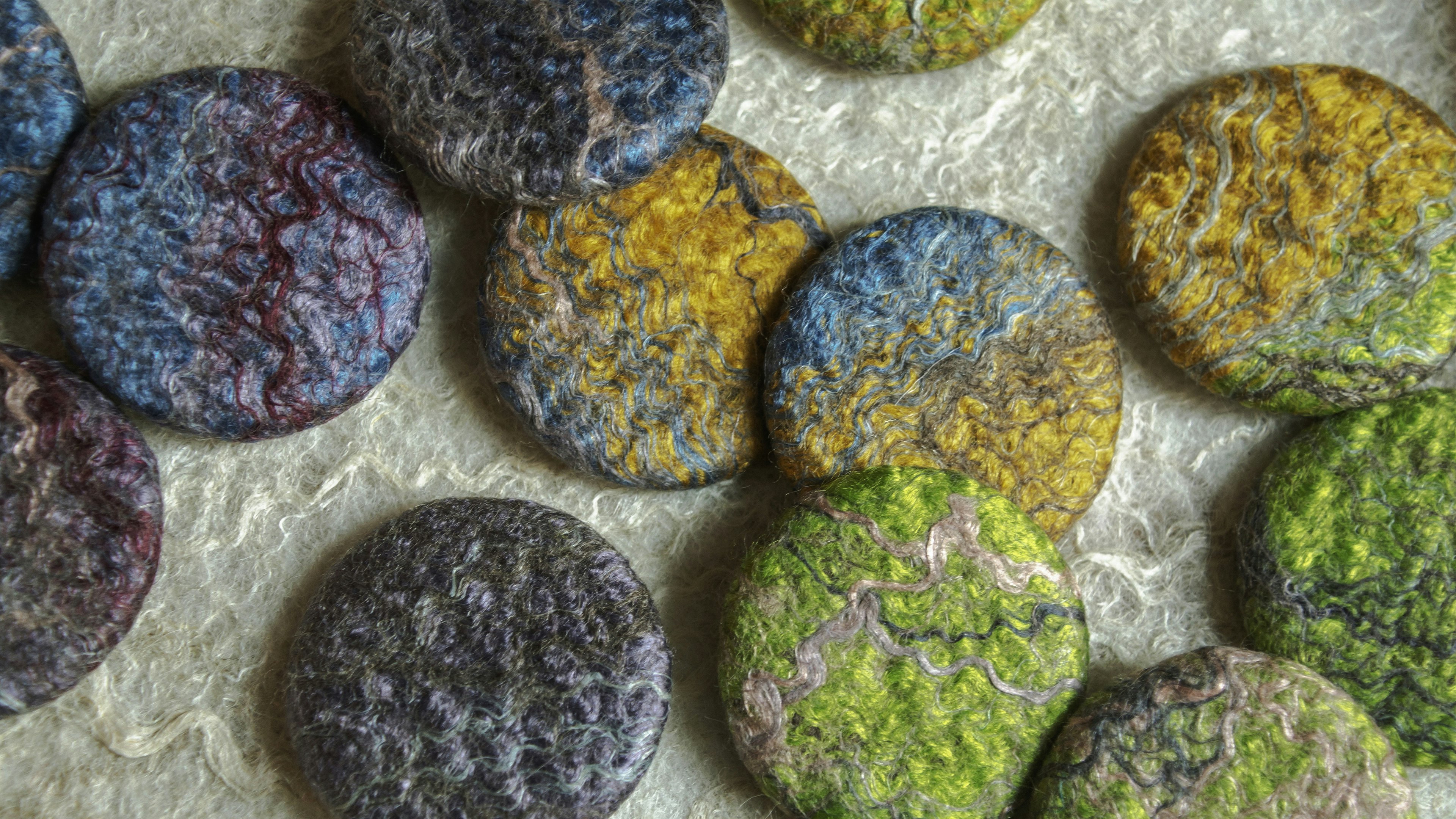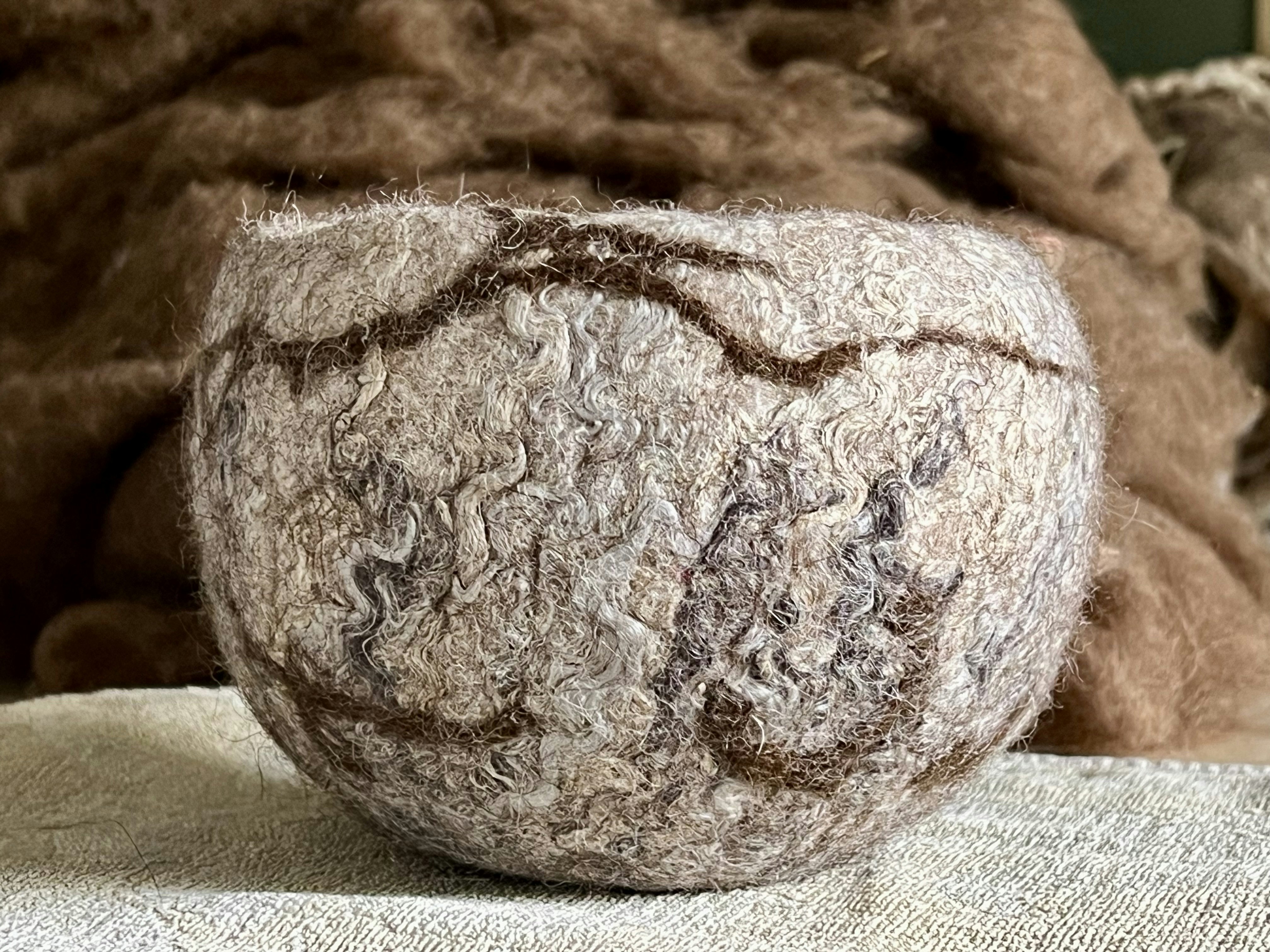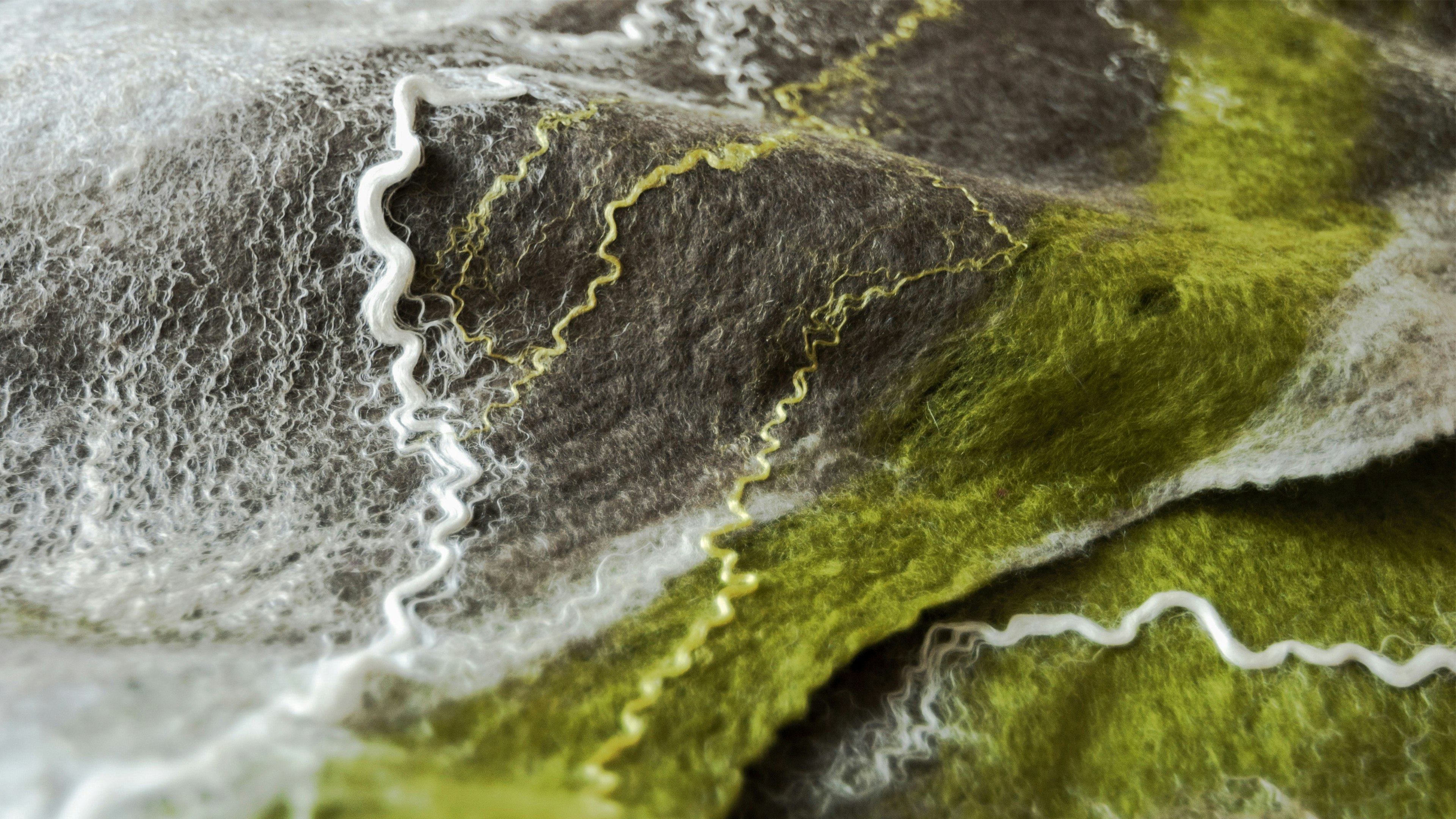 - Creating felt patterns using various wet-felting techniques: basic (at least 4-layer) felt made from European wool, 3-dimensional seamless felt item (e.g. small vessel), nuno felt (merino wool felted over e.g. silk fabric), cobweb felt and needle felting.