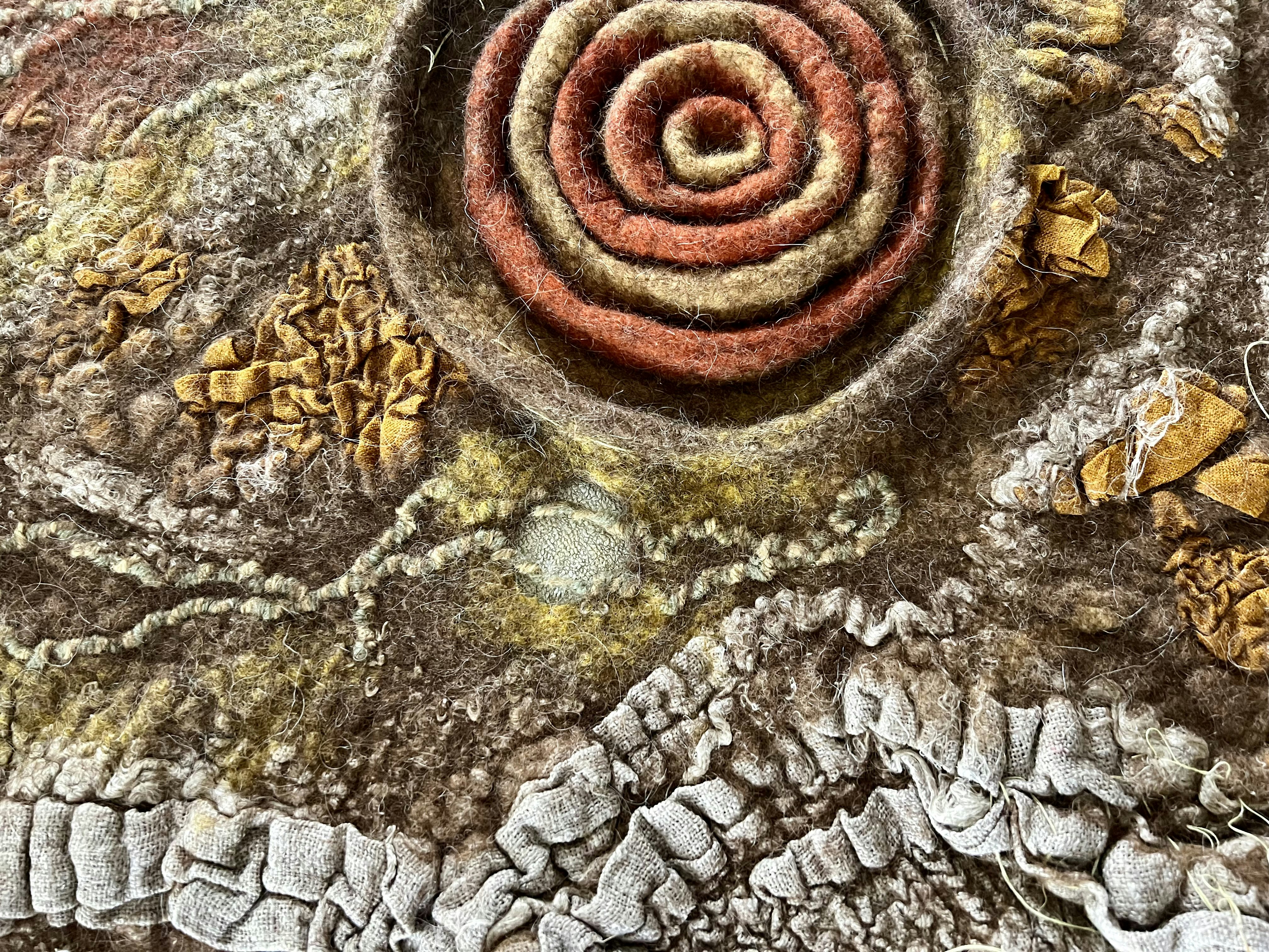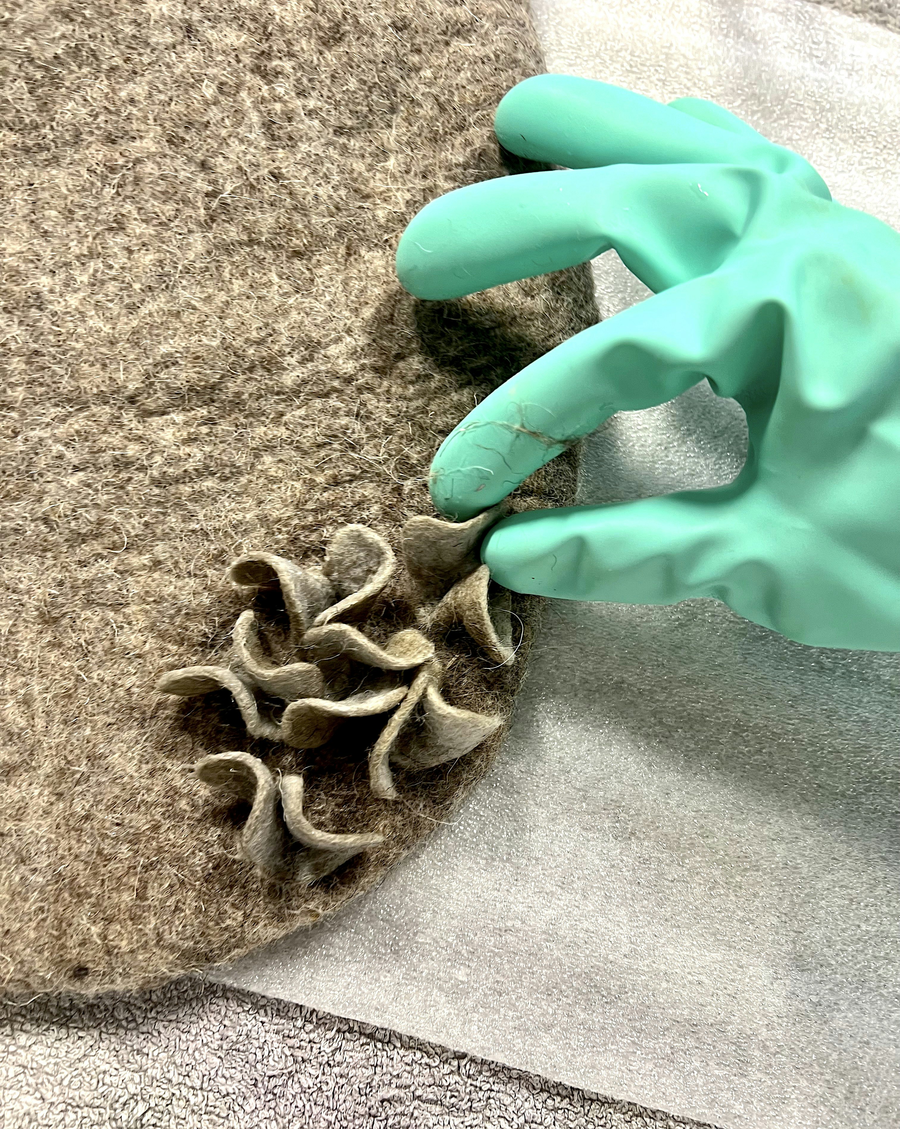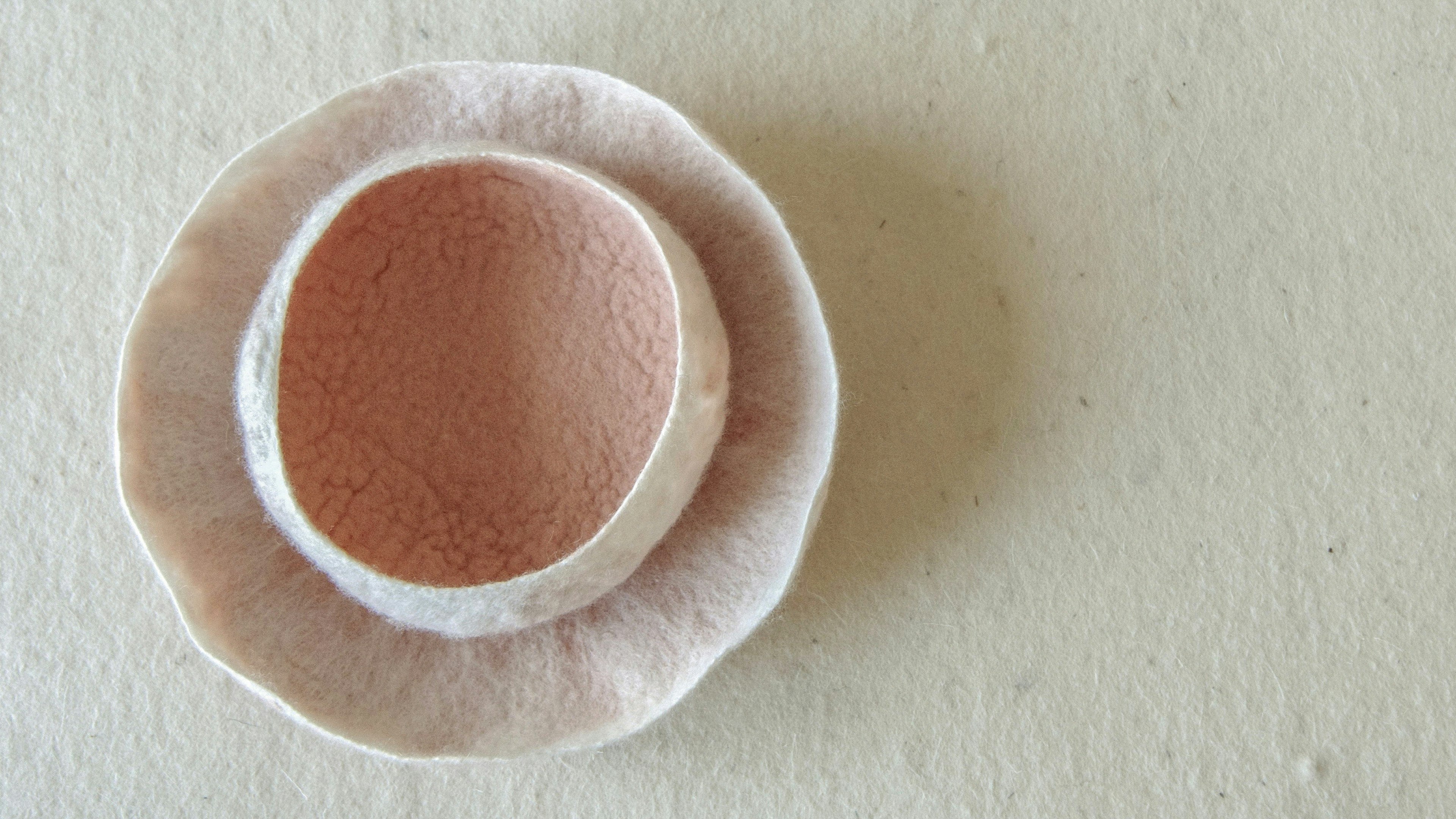 - Creating felt patterns using various wet-felting techniques: basic (at least 4-layer) felt made from European wool, 3-dimensional seamless felt item (e.g. small vessel), nuno felt (merino wool felted over e.g. silk fabric), cobweb felt and needle felting.