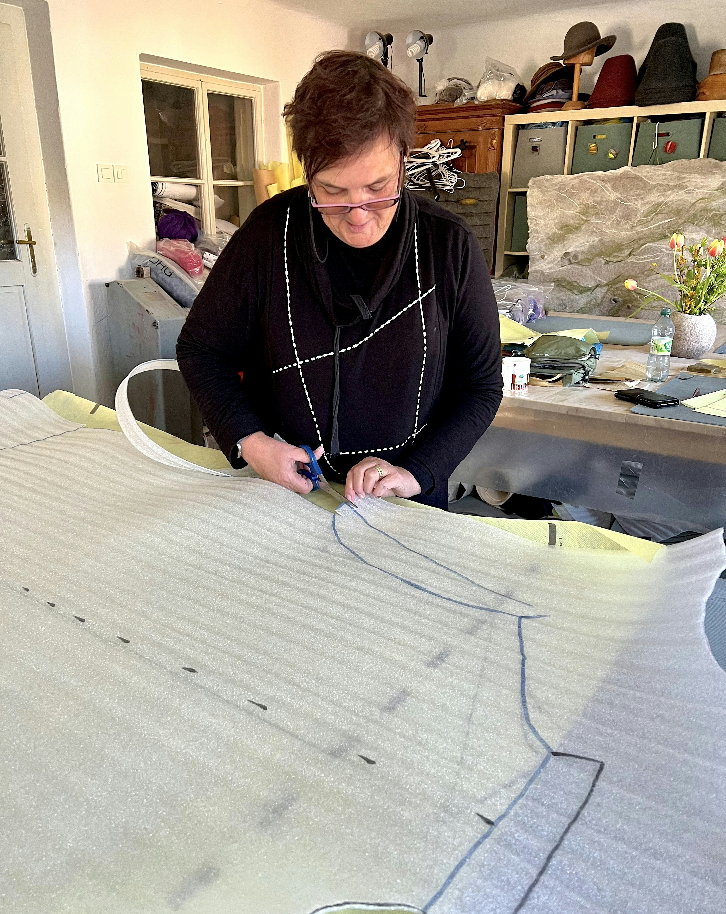 She says one of her obsessions has been creating and developing the thinnest of felt that she makes from the softest merino wool, and other fibers like nettle, silk and viscose. As a true master of wet-felting, she knows how to make everything seamless and with zero-waste. You can often hear enchanting melodies throughout the 17th century studio she shares with her master violin maker husband, Daniel.