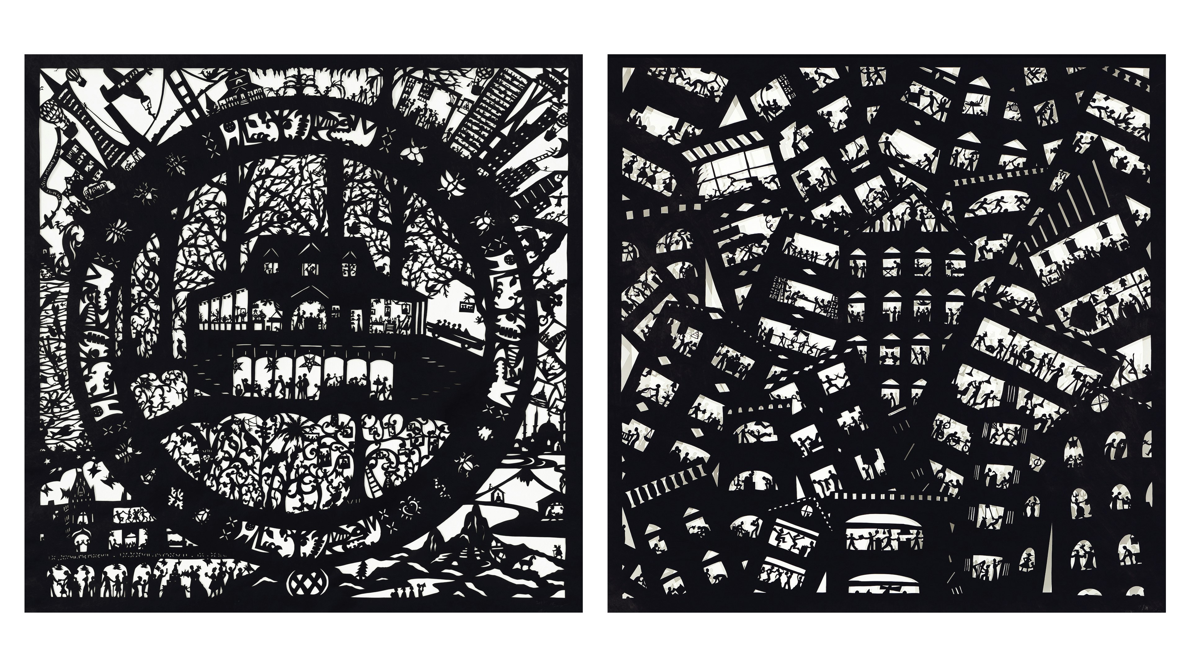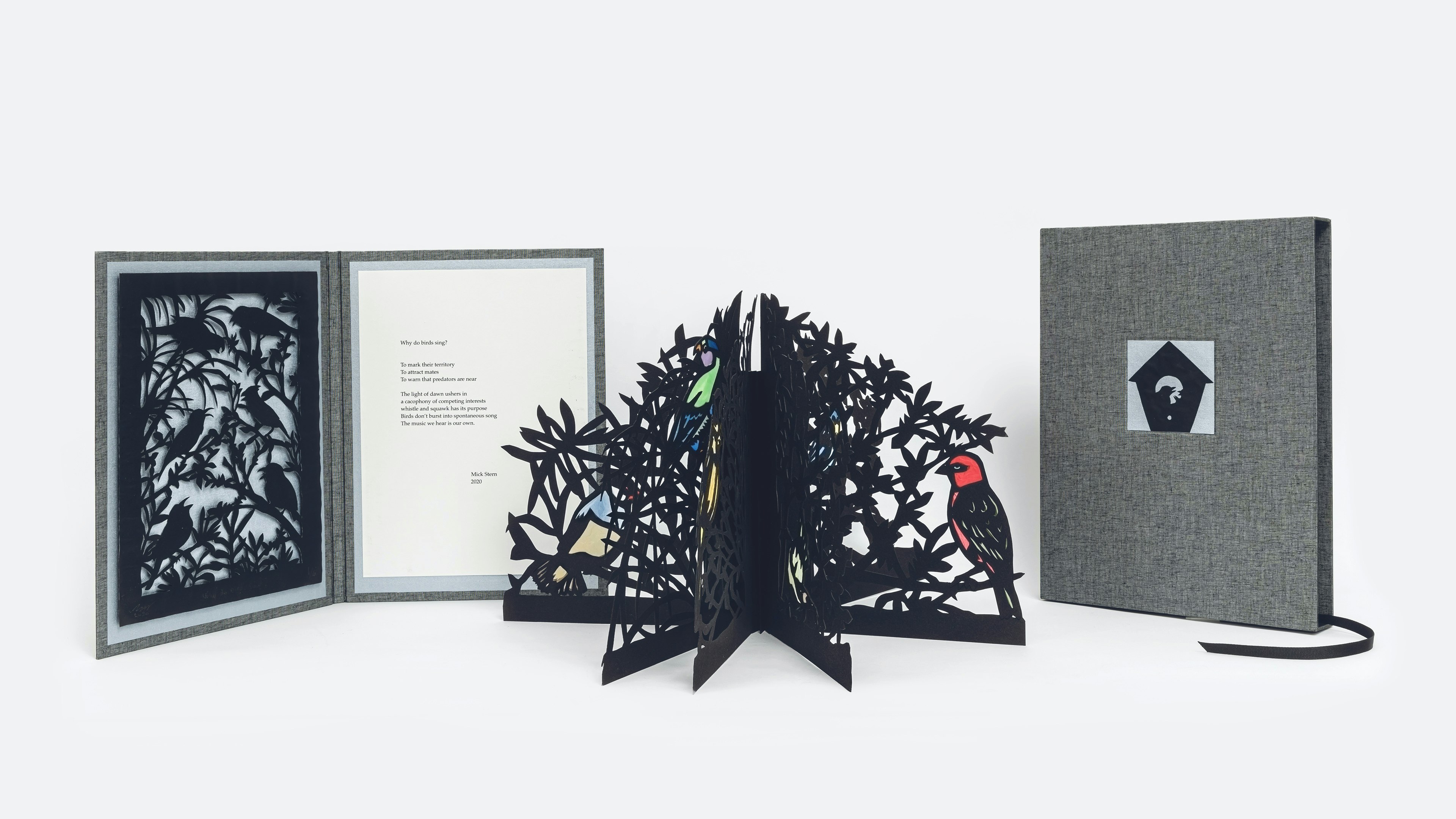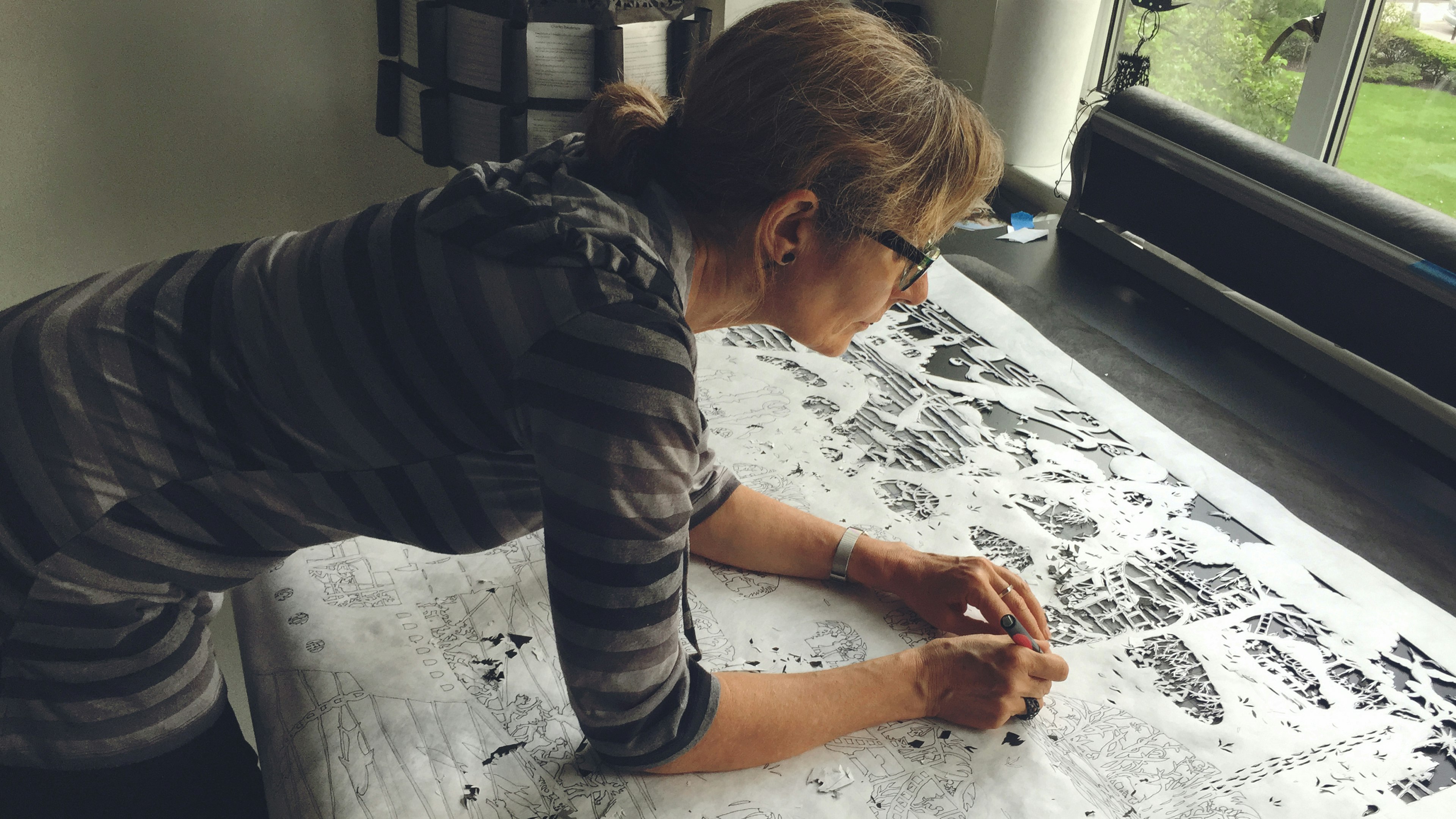- Beginning the process of cutting out the composition to create an artist book, wearable, or papercut hanging.
