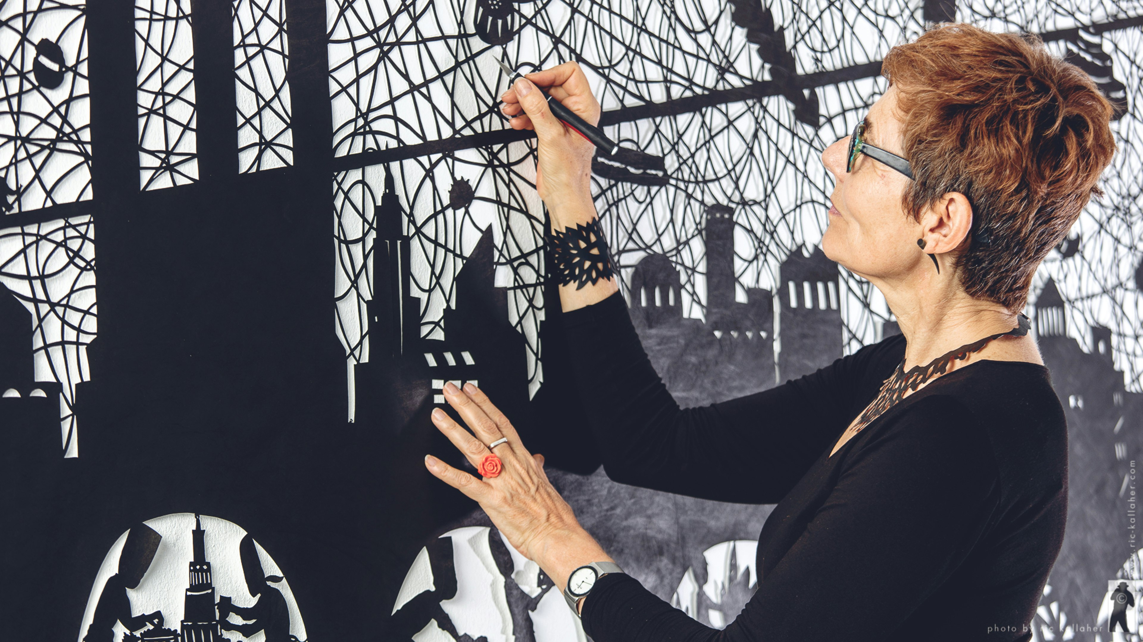 Beatrice’s life has been one of transformation – a series of curious adventures and experiences that have fueled and informed her approach to her art. She speaks many languages but is most captivated by the language of silhouette and “getting to the essential of things.” She loves to experiment with creating empty and full shapes that cast shadows, moving between two- and three-dimensional space to create immersive worlds. In addition to paper and Tyvek, she also creates works in stone, metal, rubber, stained glass, and digital media. A prolific artist, Beatrice is in constant pursuit of her creative instincts: “If you have an idea, don’t think twice – just do it.” Her fearlessness is her charm; it’s infectious.