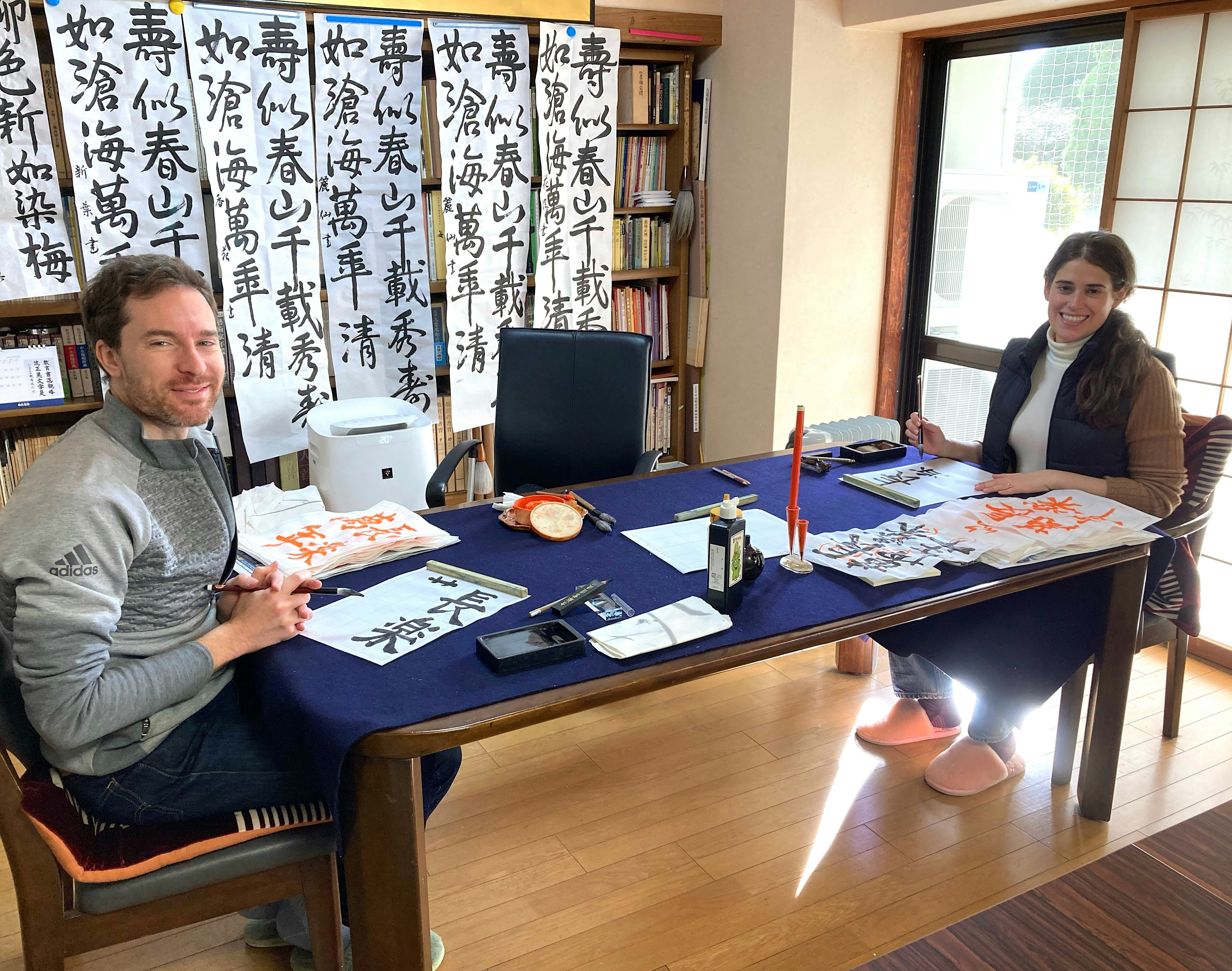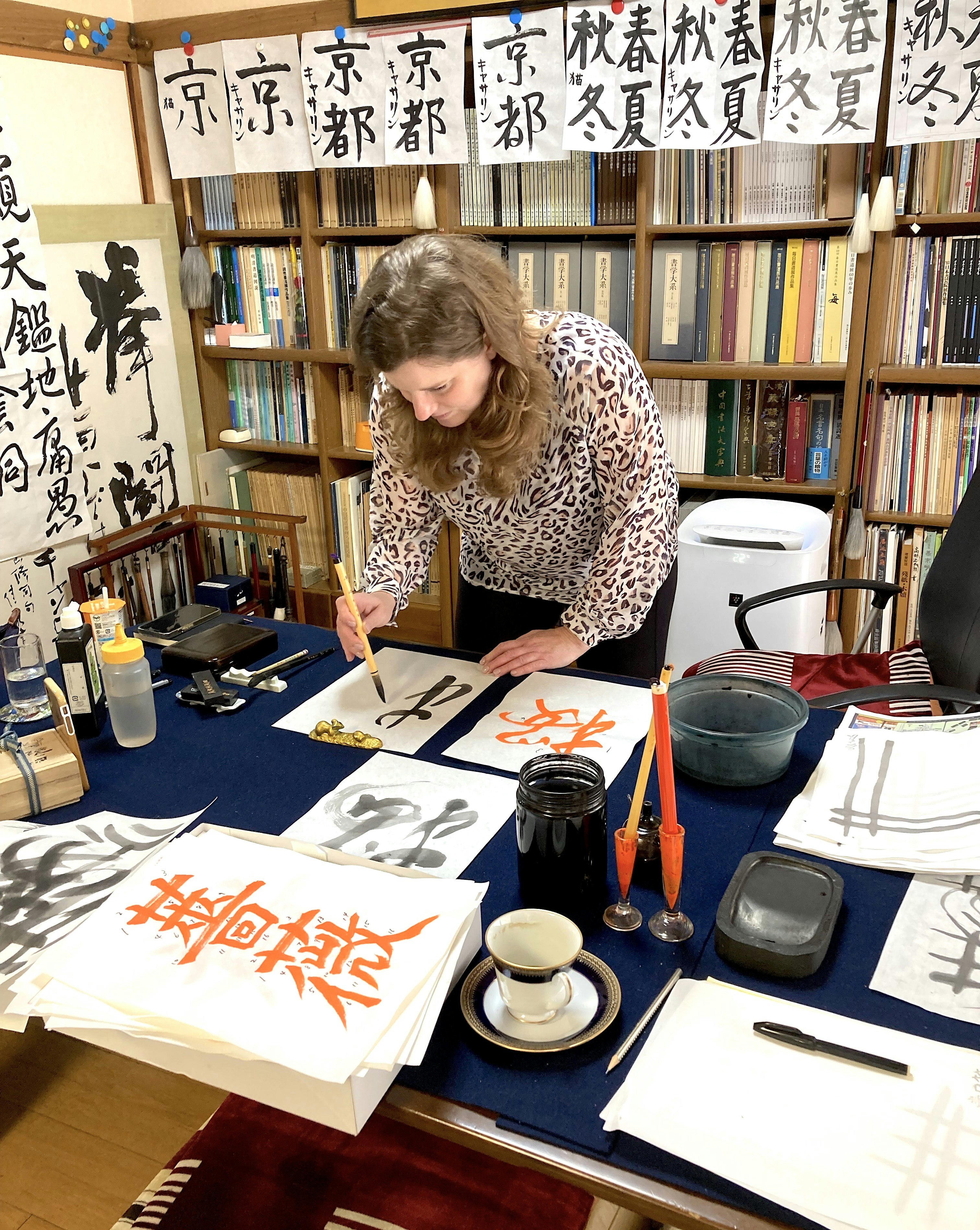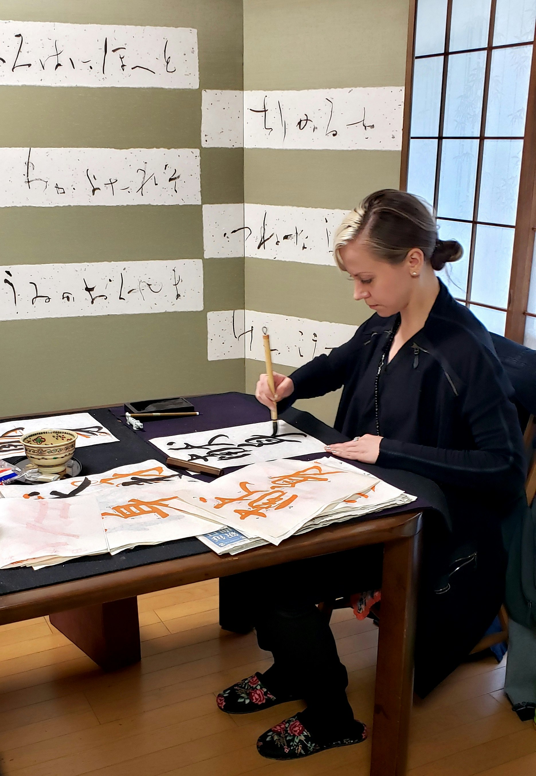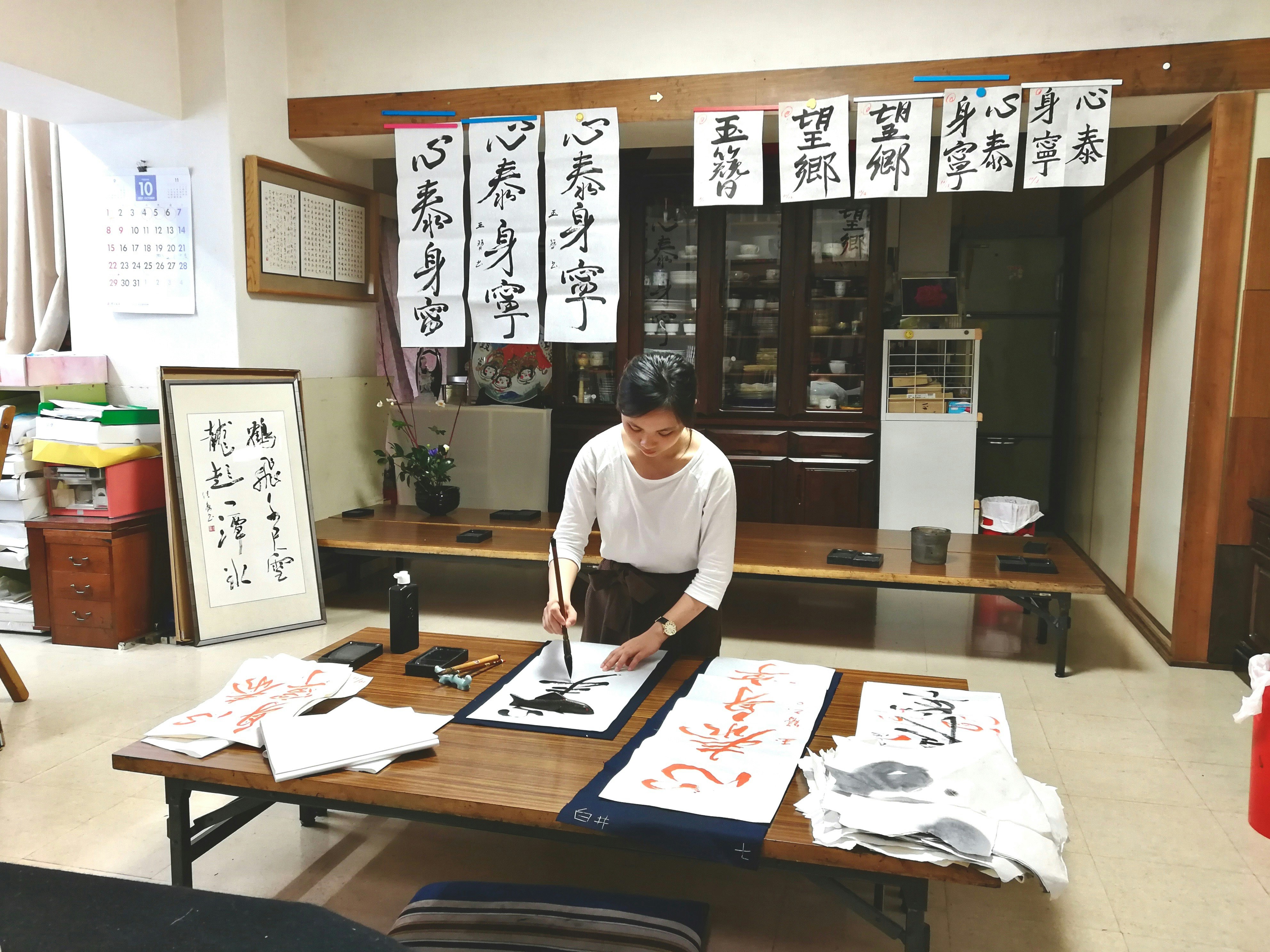 - Practicing calligraphy with Chikako’s students in different studios.