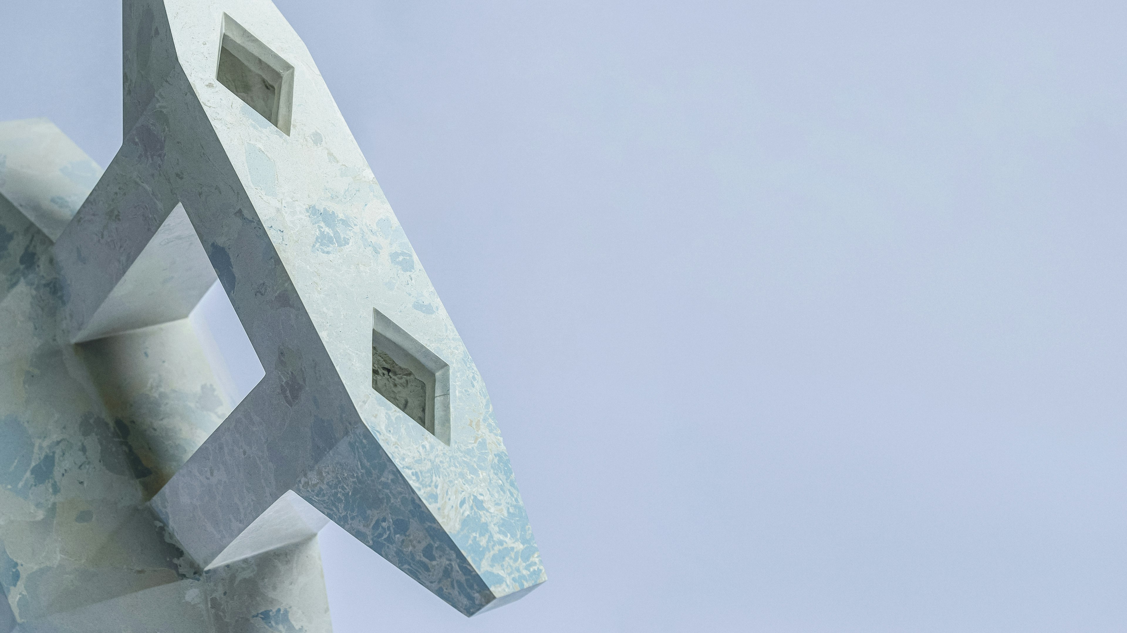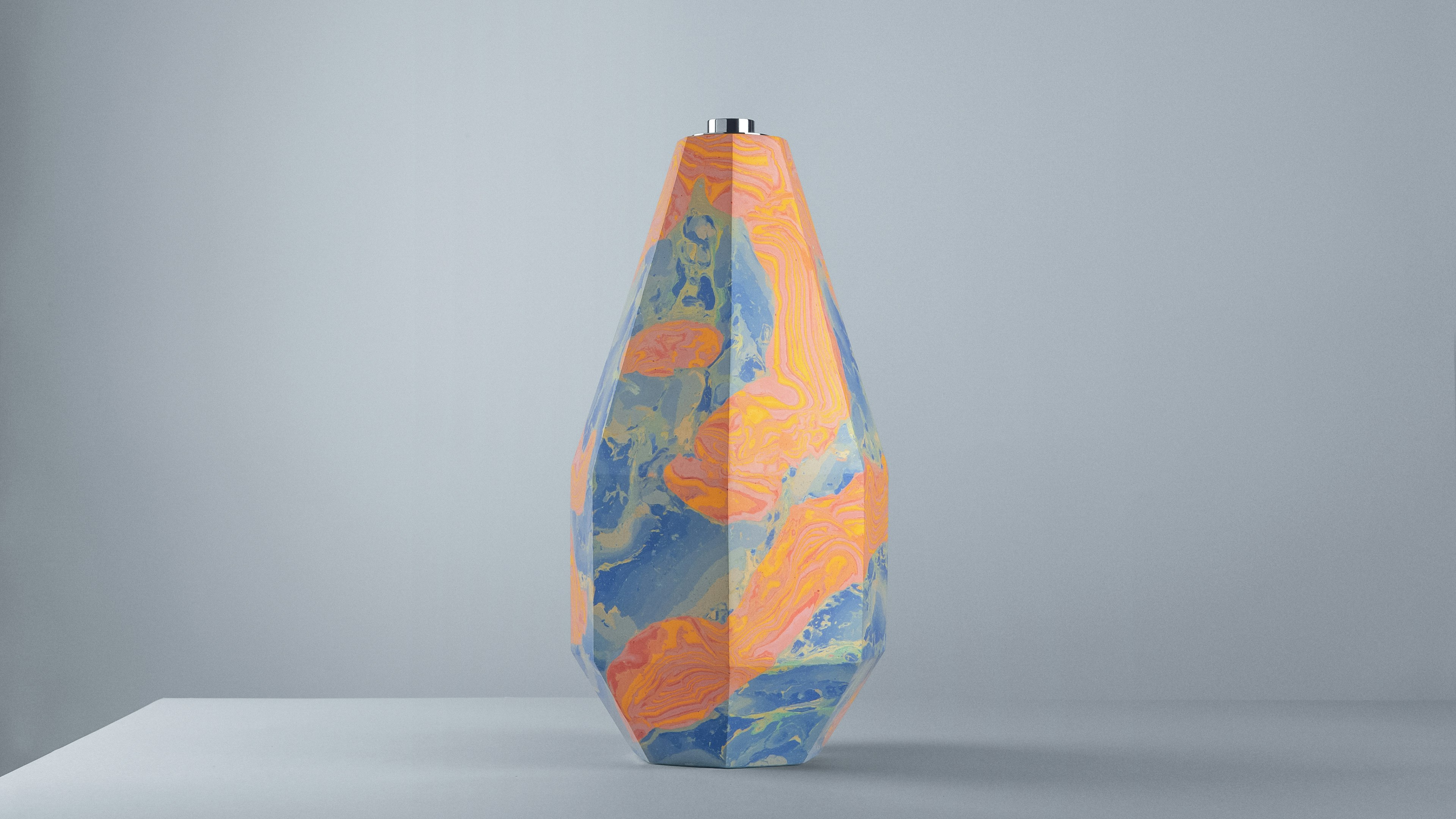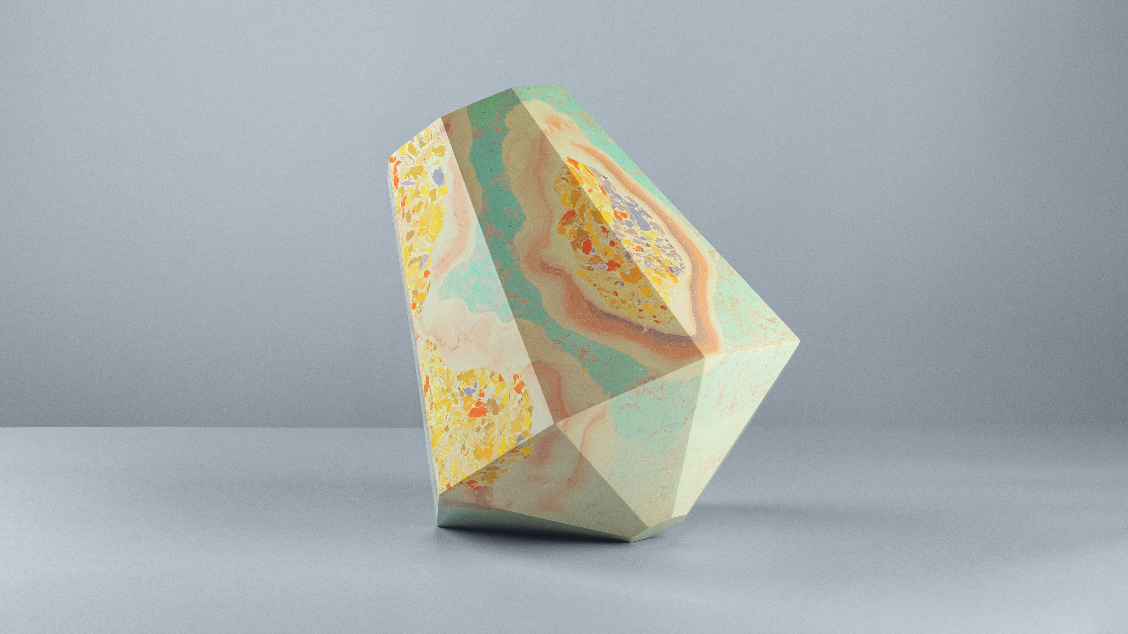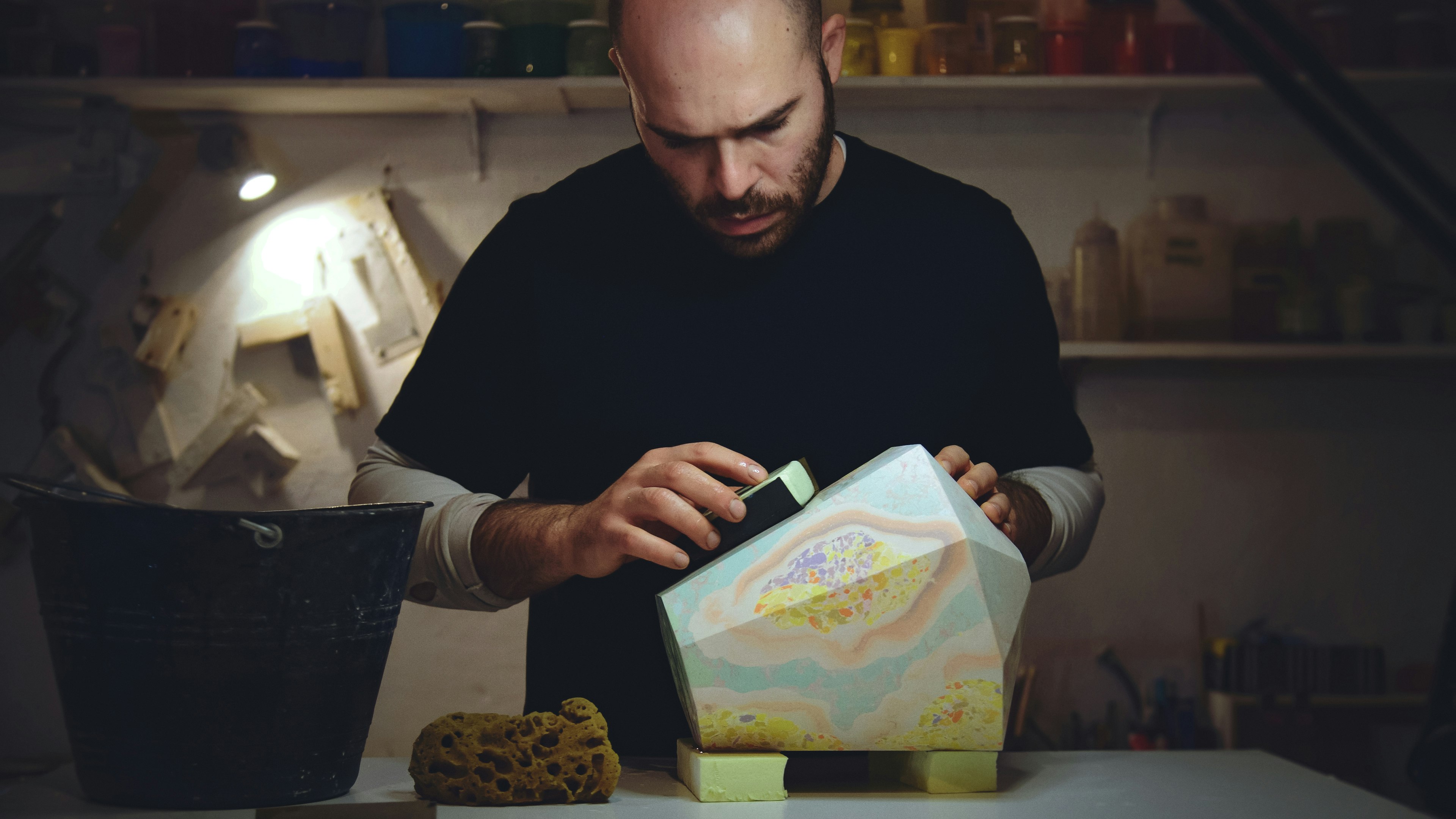 Claudio’s process begins with mold-making, shaping his forms before applying a mixture of plaster, gypsum, animal glue, and natural pigments to create marble-like surfaces. The results are vibrant, fluid, and richly textured, often contrasted with the clean lines of geometric structures—a distinctive interplay between tradition and modern design. In ceramics, Claudio specializes in mold-making and casting, producing refined furniture and tableware in porcelain.