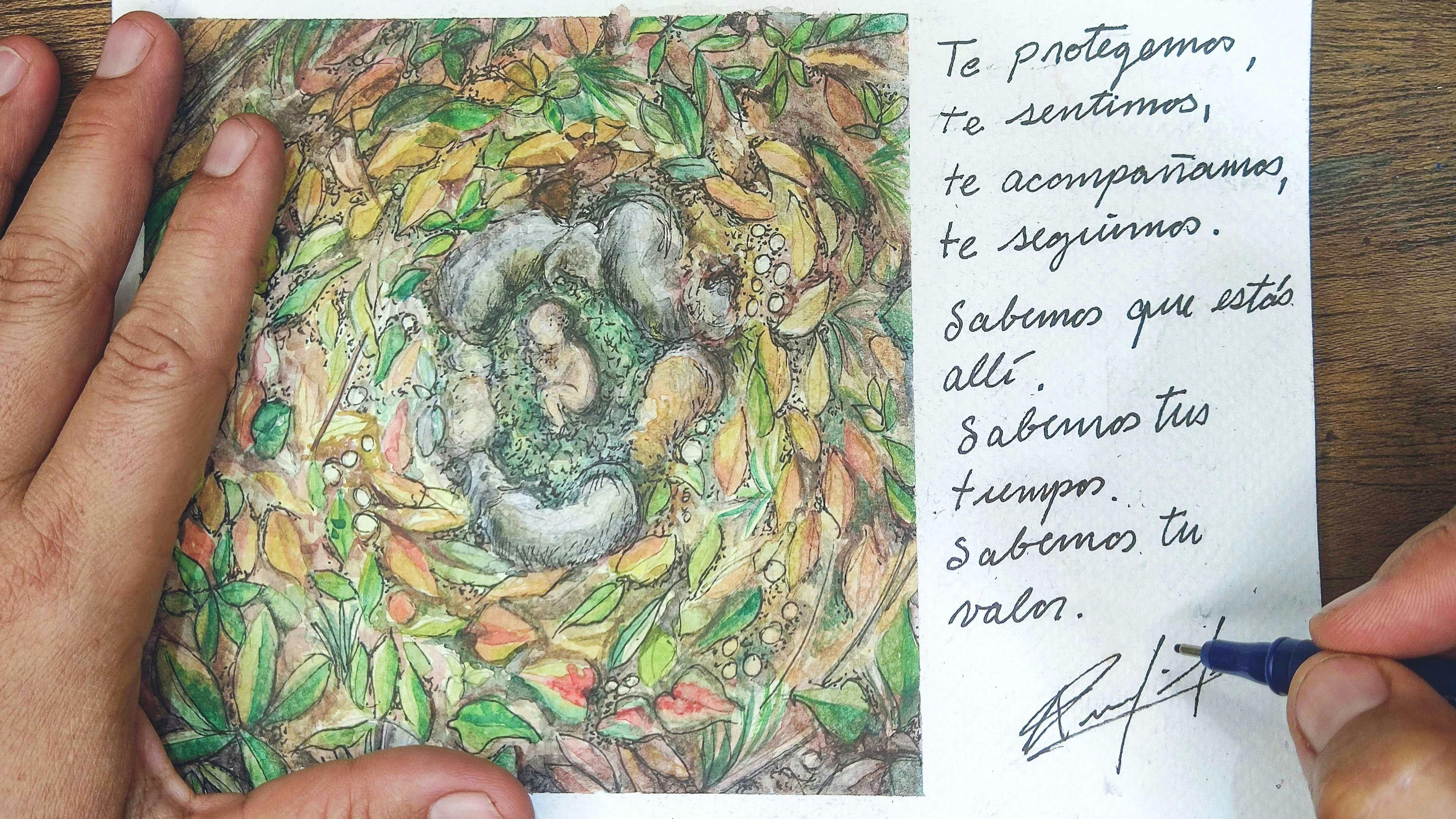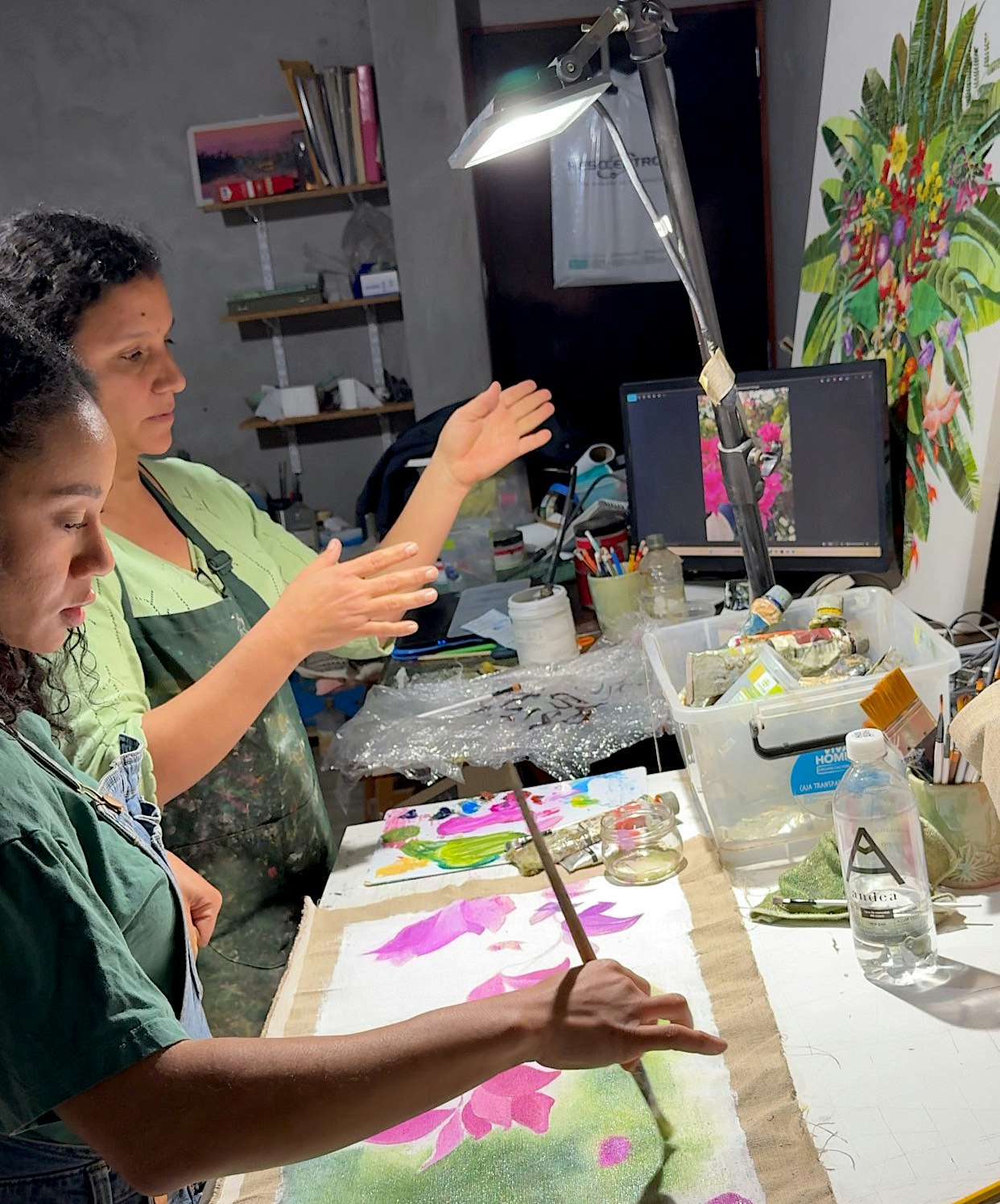 In Lima, she has created a nature sanctuary, bringing the essence of the Amazon to the city. With her Peruvian hairless dogs by her side, she is excited to inspire others to connect with nature and the land through art.