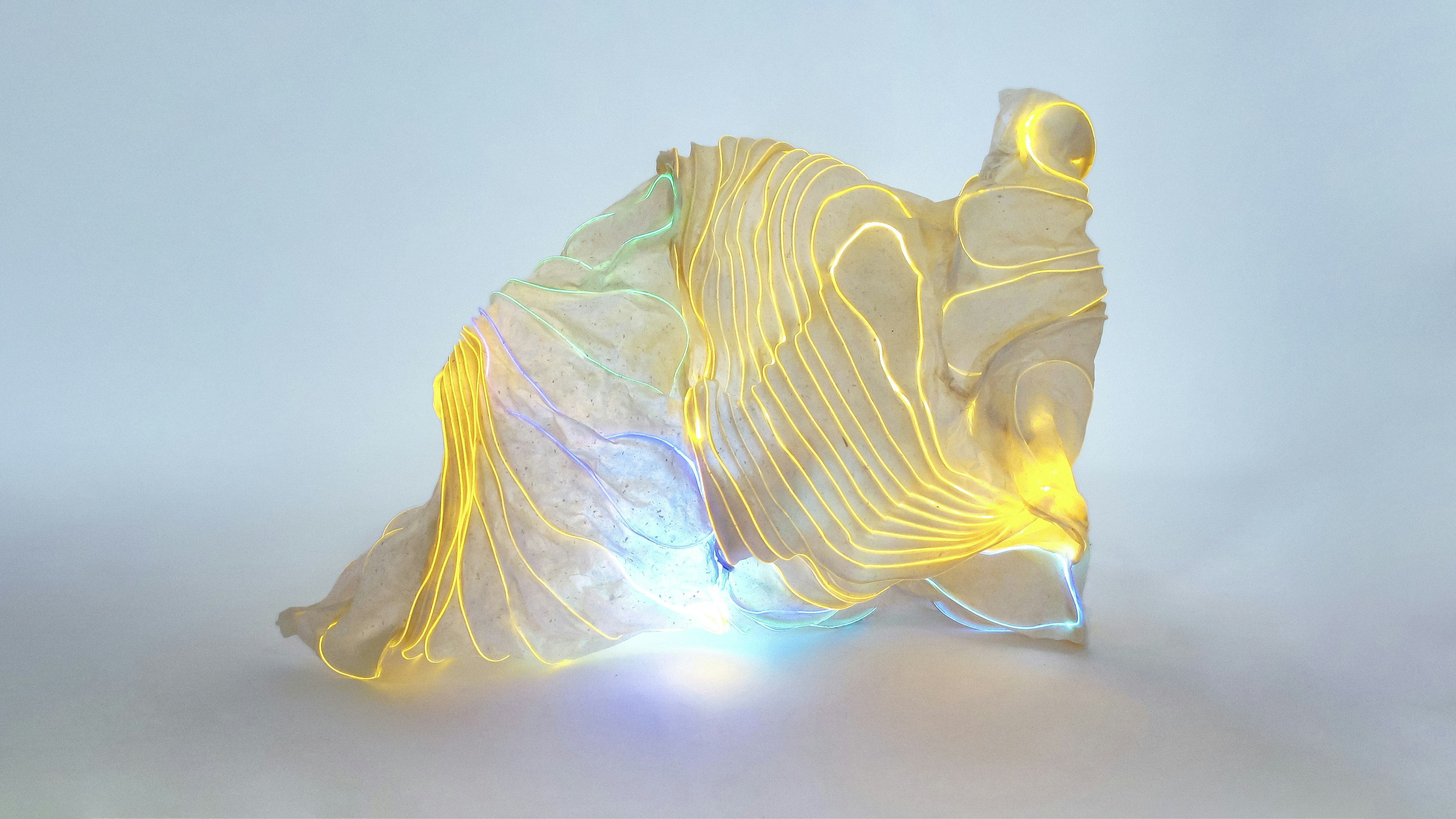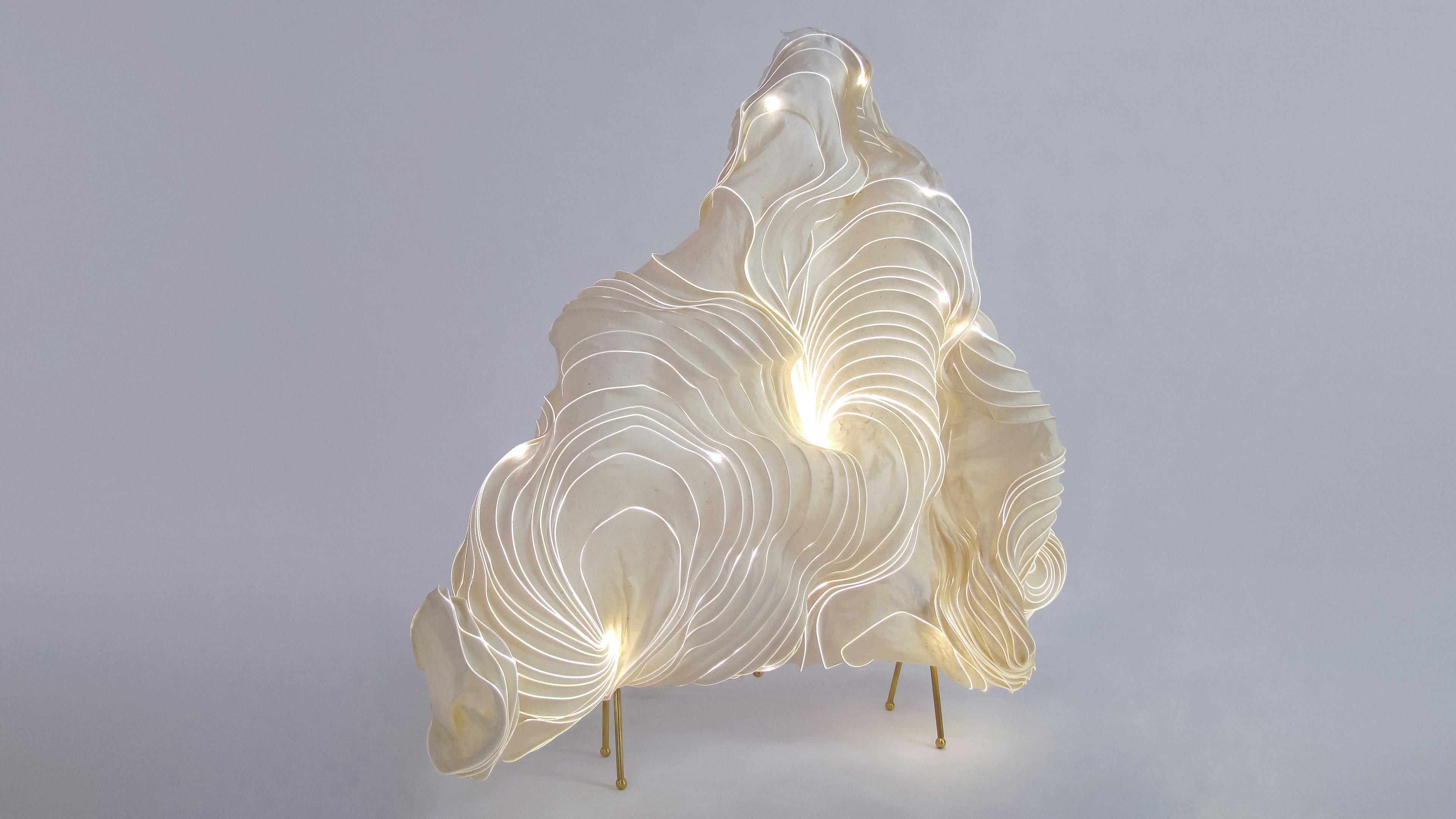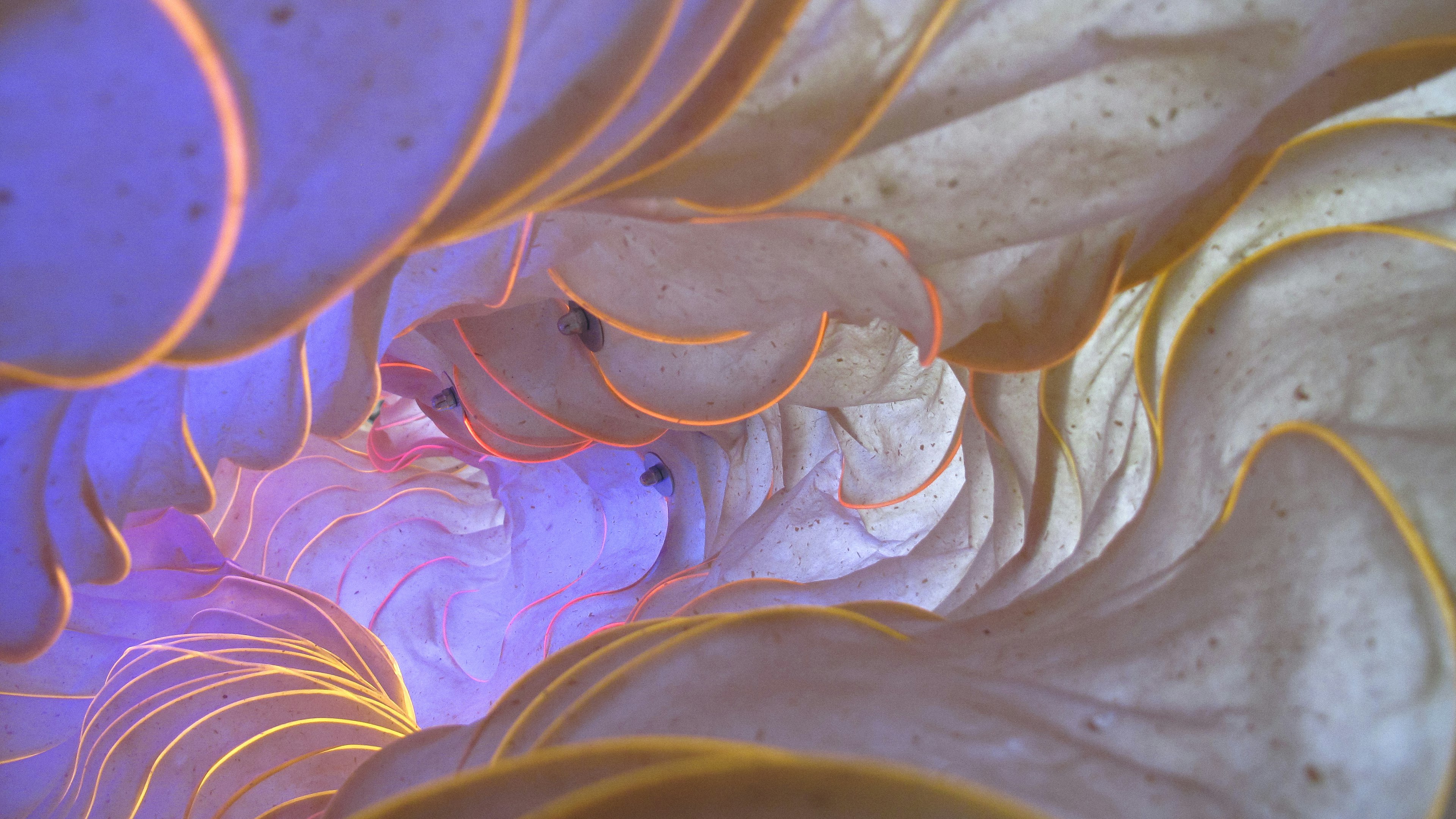 Drawing on Eastern and Western papermaking traditions, he crafts translucent sheets up to 2.5 meters wide using vacuum tables, pressure methods, and handcrafted tools. He integrates delicate structural frameworks into whisper-thin paper made from flax and hemp, shaping intricate organic cloud-like forms.