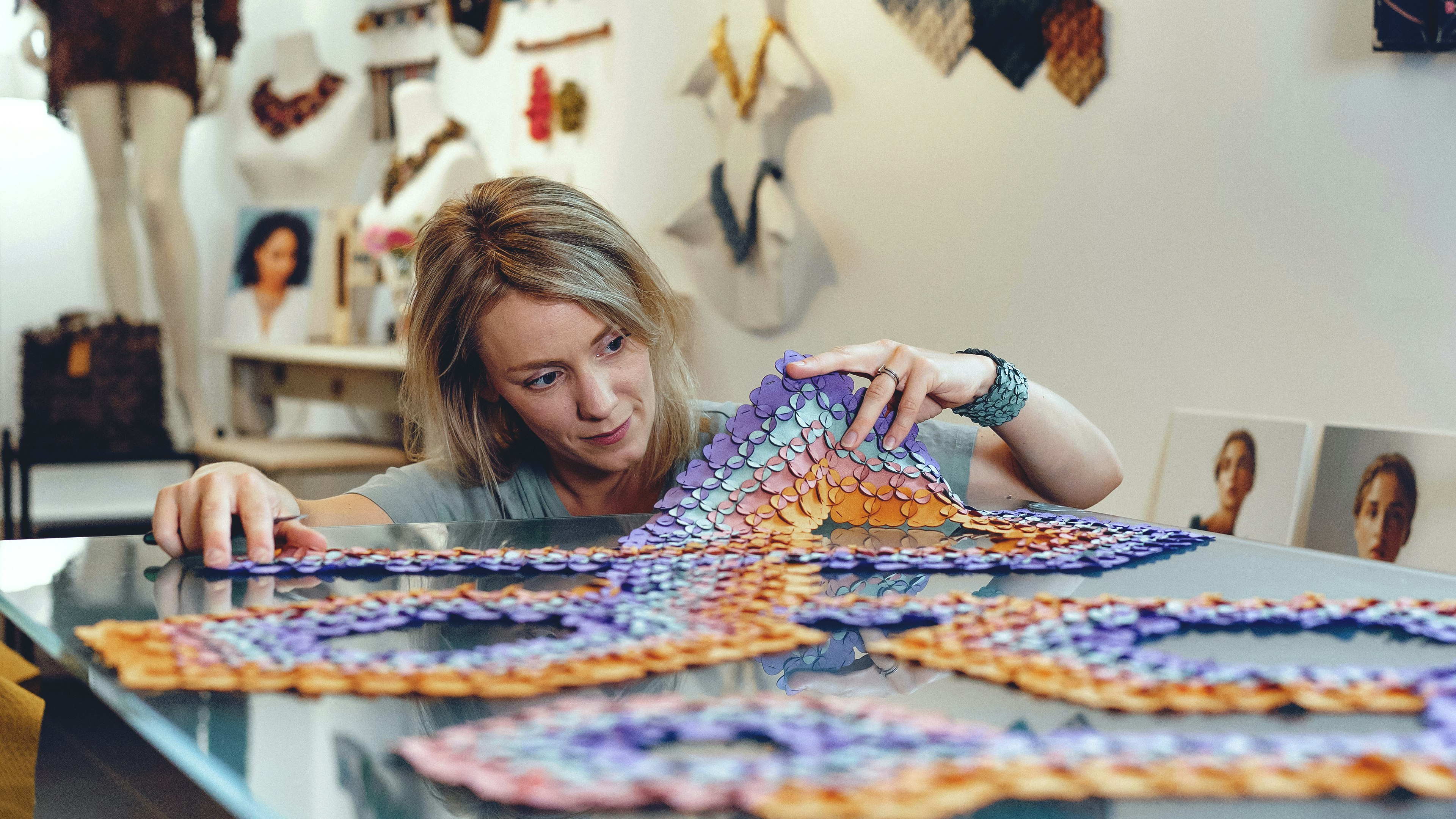 She uses laser-cutting technology to create puzzle-like modules from durable materials such as vegan leather, neoprene, and scuba fabric. These intricately cut pieces are meticulously hand-assembled into tactile, sculptural accessories—including necklaces, bracelets, earrings—and interior objects that encourage endless reconfiguration and personal expression. Iris calls this meditative and precise process “Craftsmanship 2.0,” which fosters deep focus and thoughtful variation while redefining traditional sewing methods.