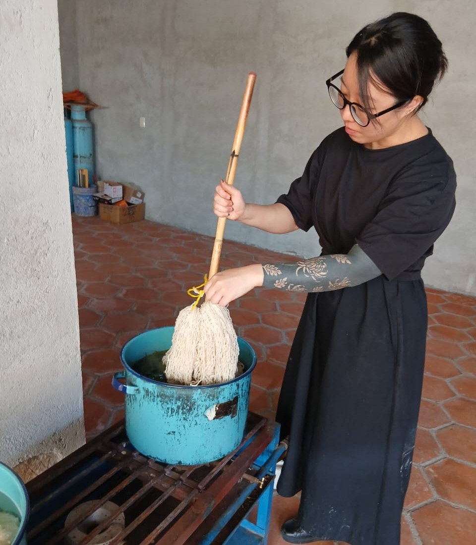 - Dyeing fibers with local dye plants like marigold flower, pericón, black sapote and walnut as well as the extract powder of indigo, fustic wood, and insect cochineal. Adjusting proportions to achieve different gradations of color.