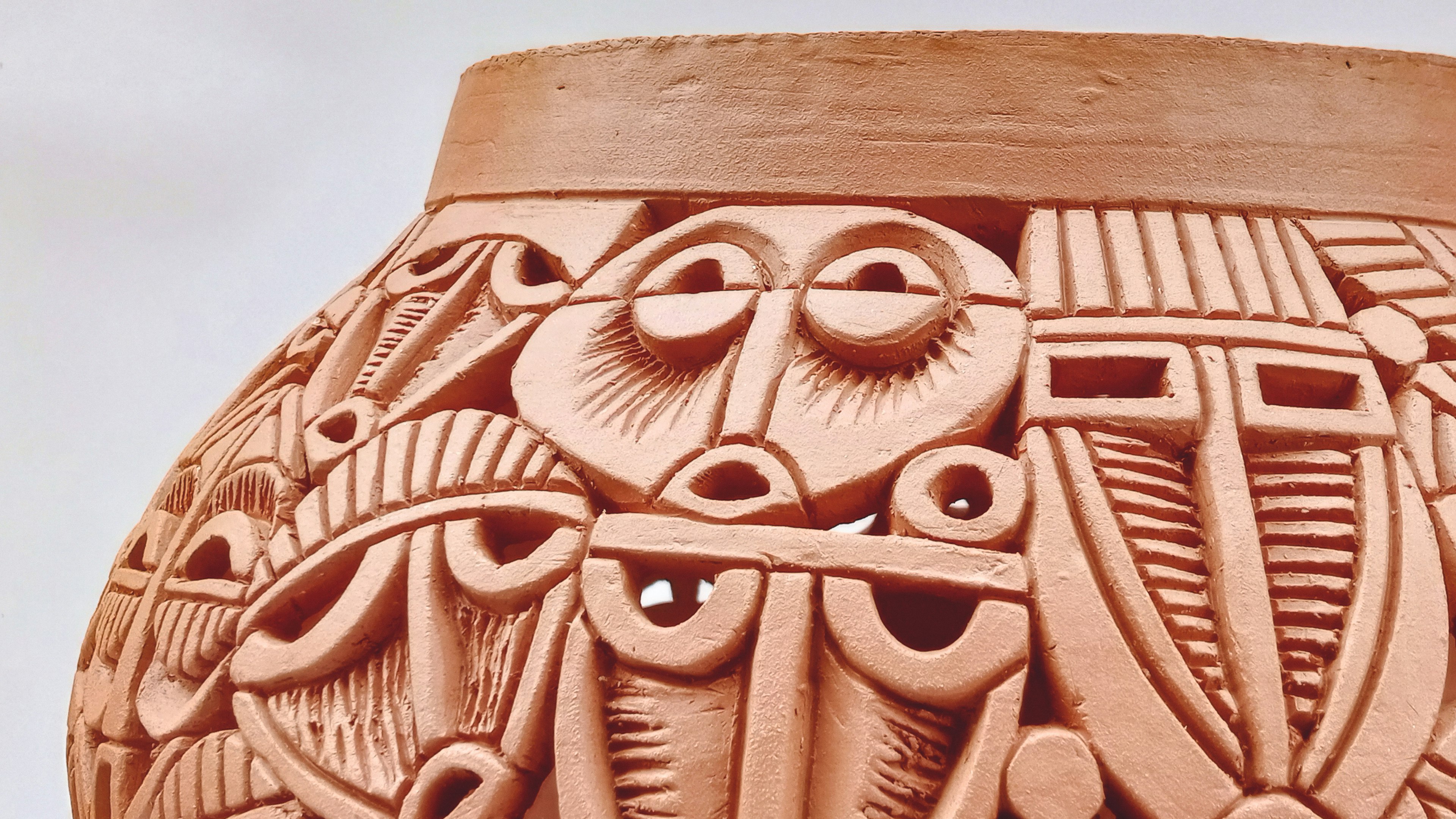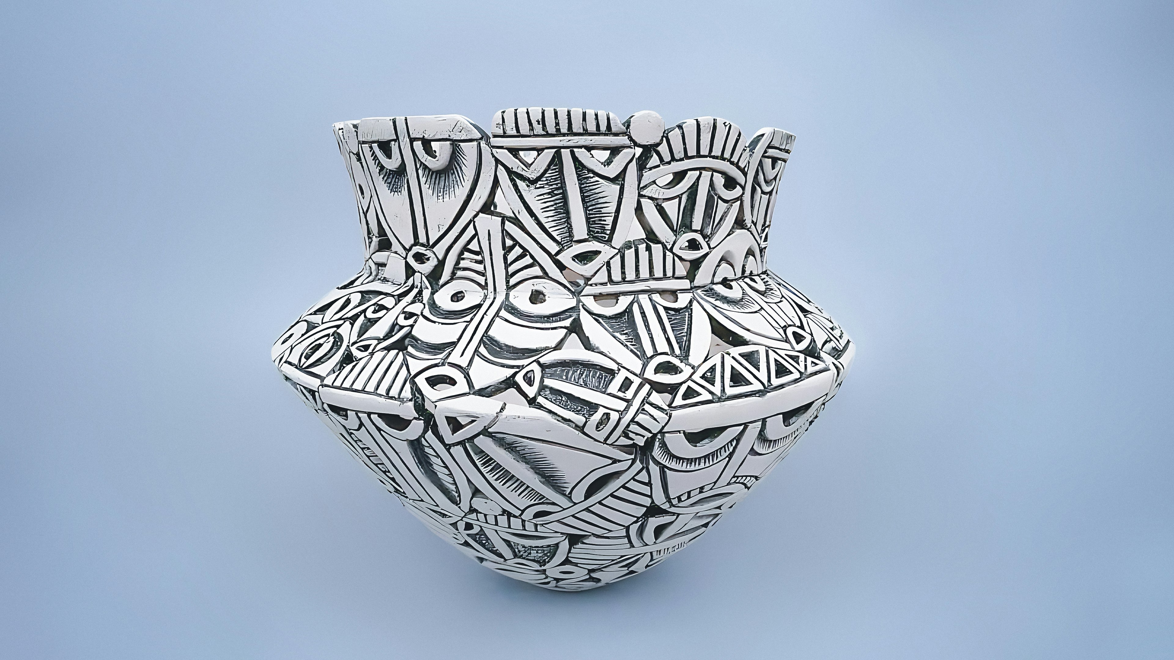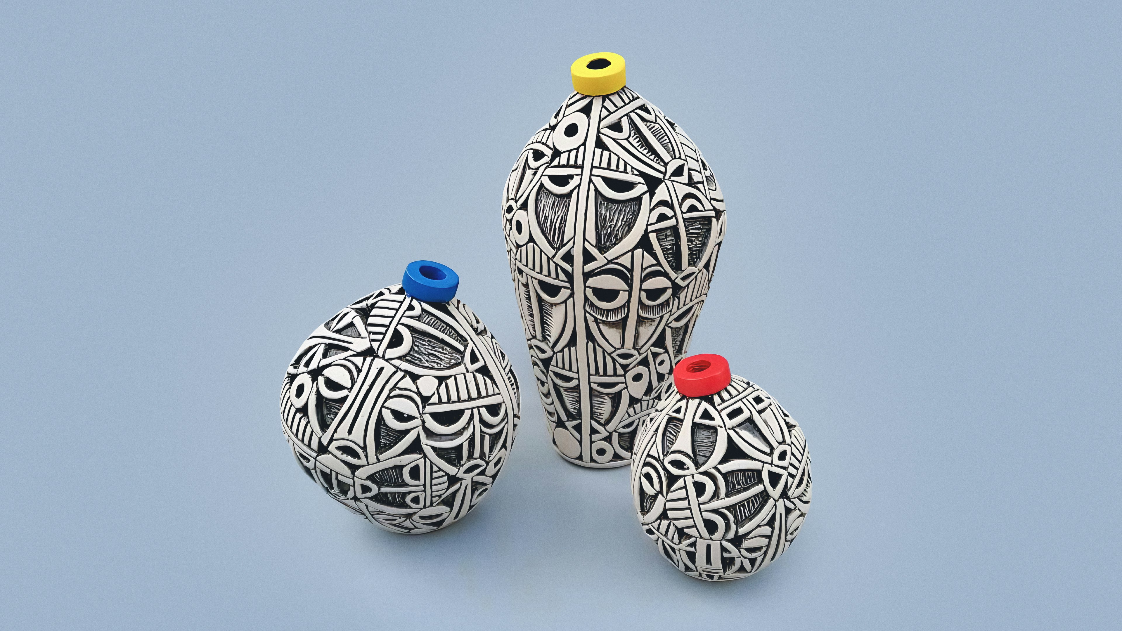Her signature style blends mosaic-like patterns inspired by African textiles, hand-carved masks, and symbolic motifs. Mastering diverse ceramic techniques—coil, mold casting, slab construction, and glazing—her work features intricately carved faces and ornate lines adorning large sculptural vases, vessels, cubes, plates, and stylized human figures. Each piece delves into themes such as womanhood, resistance to domestic violence, environmental volatility, and humanity's profound connection to nature.