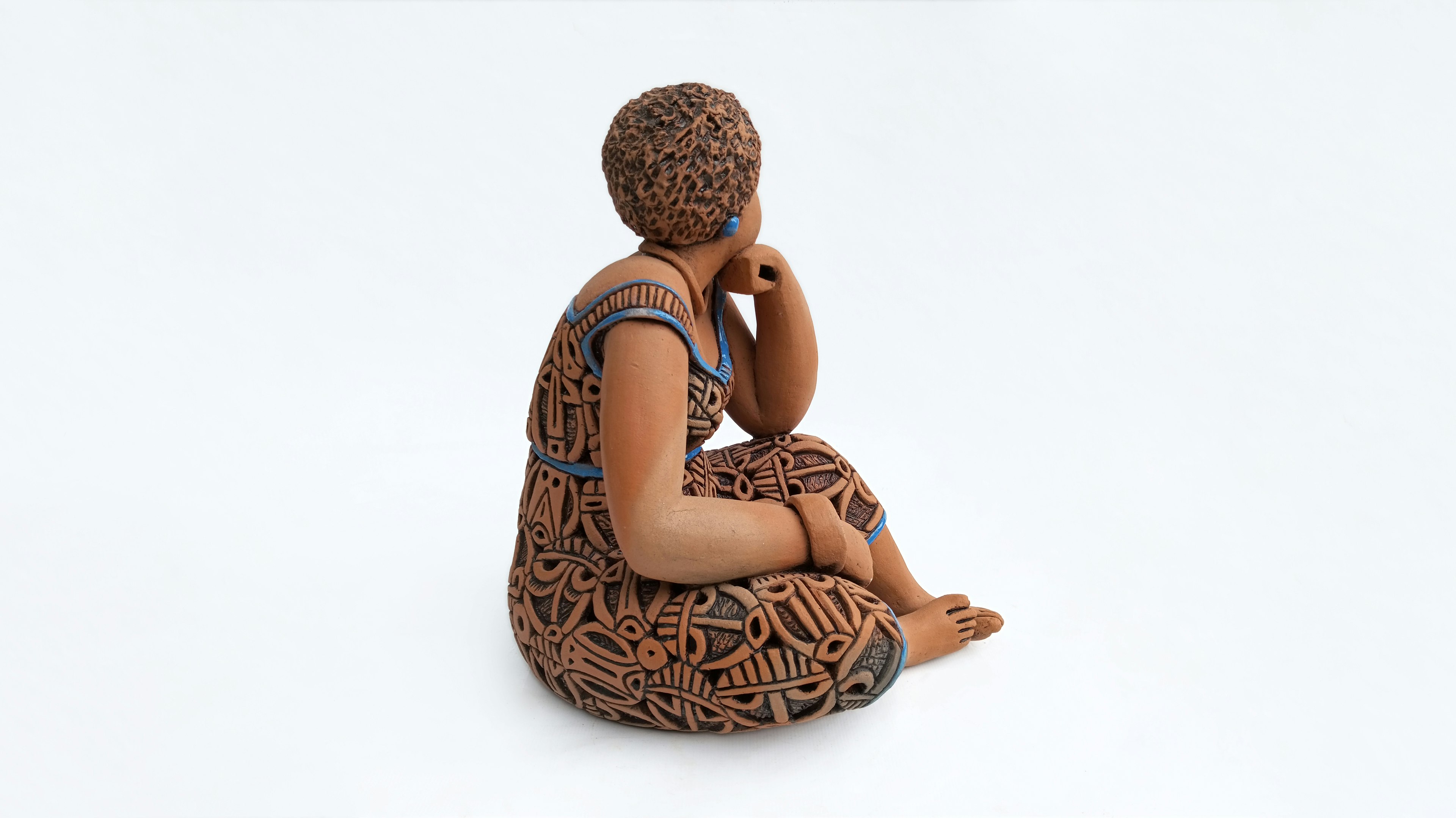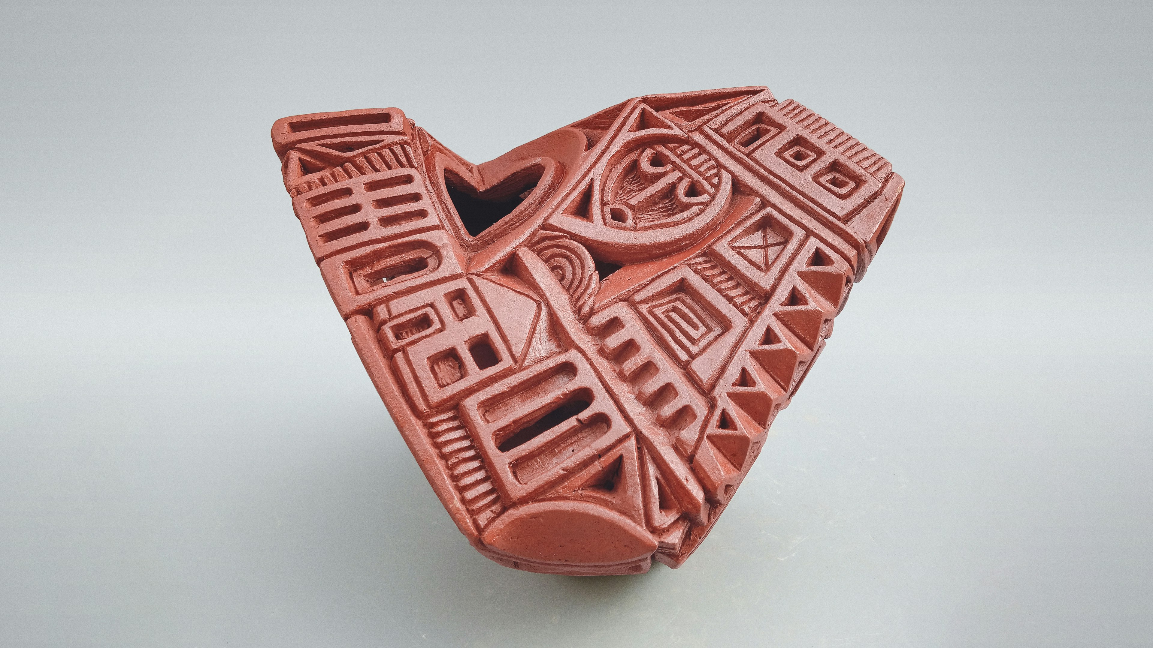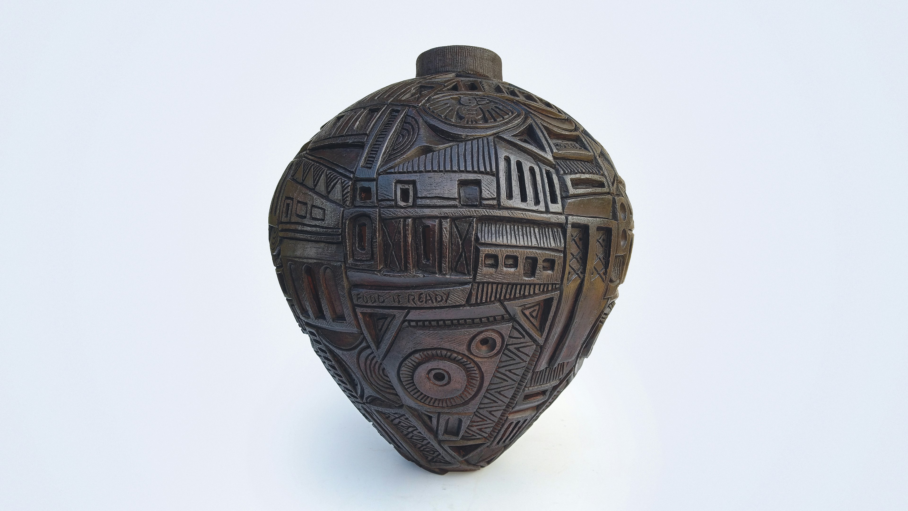 Her signature style blends mosaic-like patterns inspired by African textiles, hand-carved masks, and symbolic motifs. Mastering diverse ceramic techniques—coil, mold casting, slab construction, and glazing—her work features intricately carved faces and ornate lines adorning large sculptural vases, vessels, cubes, plates, and stylized human figures. Each piece delves into themes such as womanhood, resistance to domestic violence, environmental volatility, and humanity's profound connection to nature.