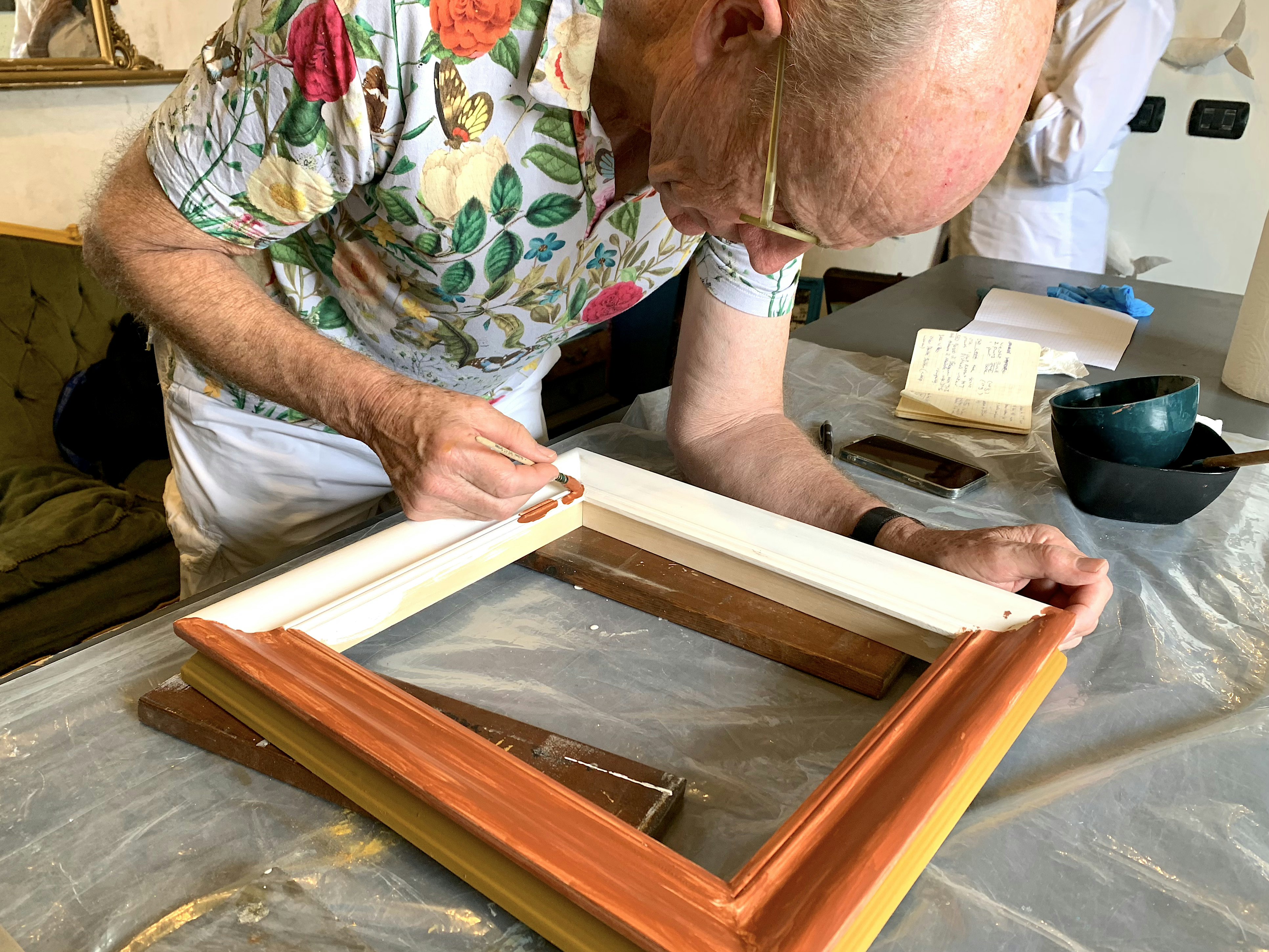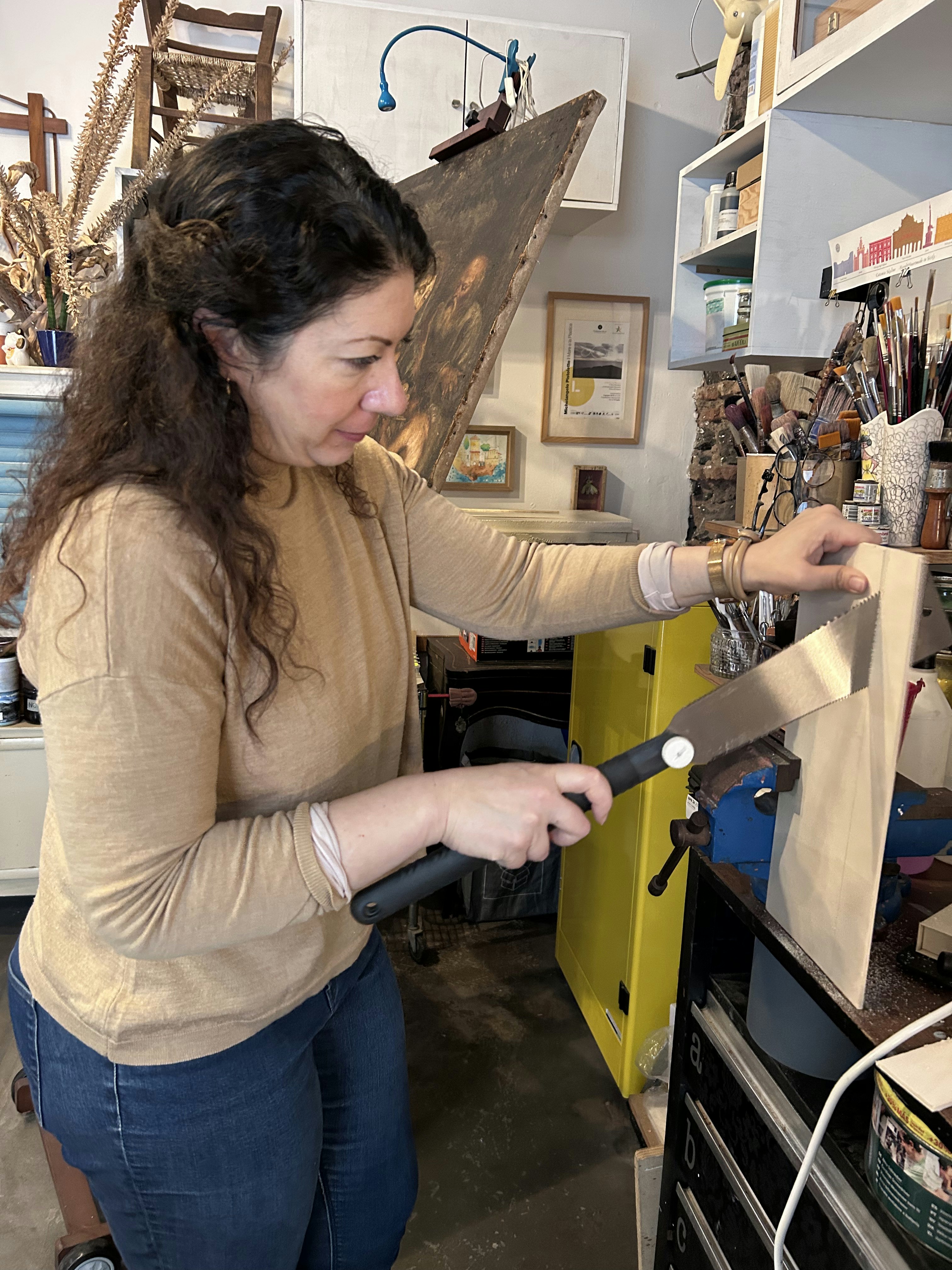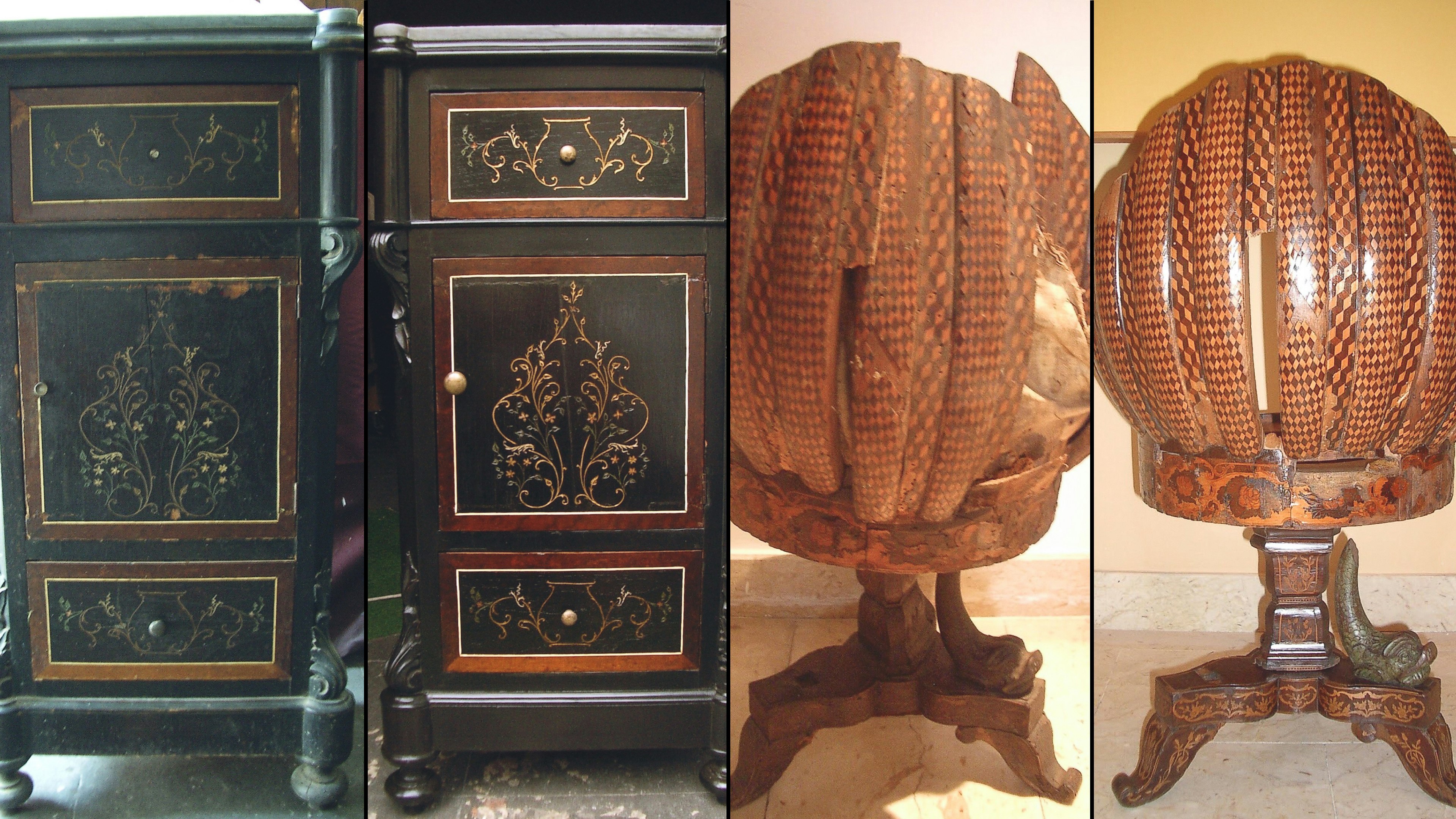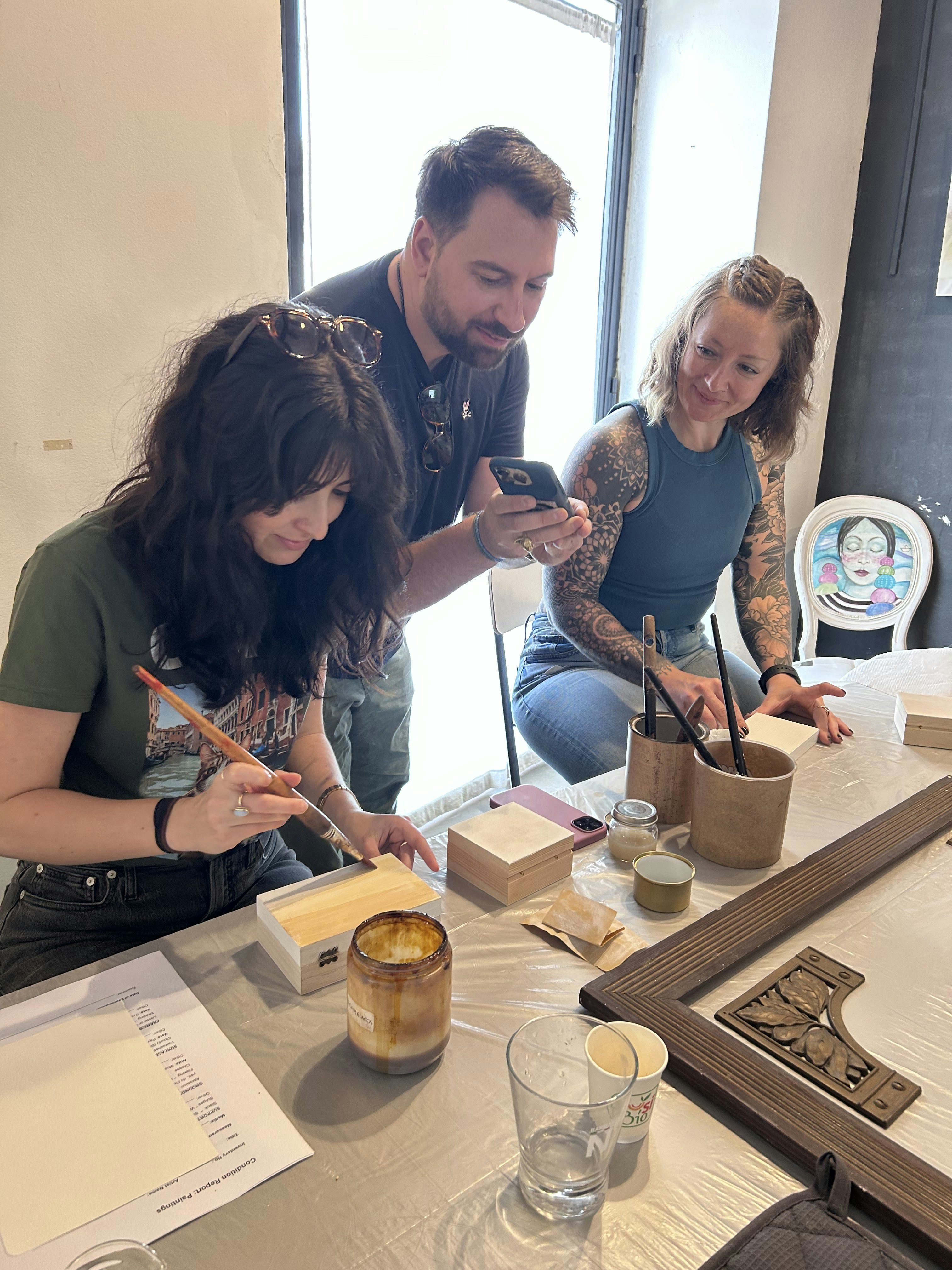 - Ancient natural wood decoration techniques like casein tempera, albumin tempera, and golden leaves.