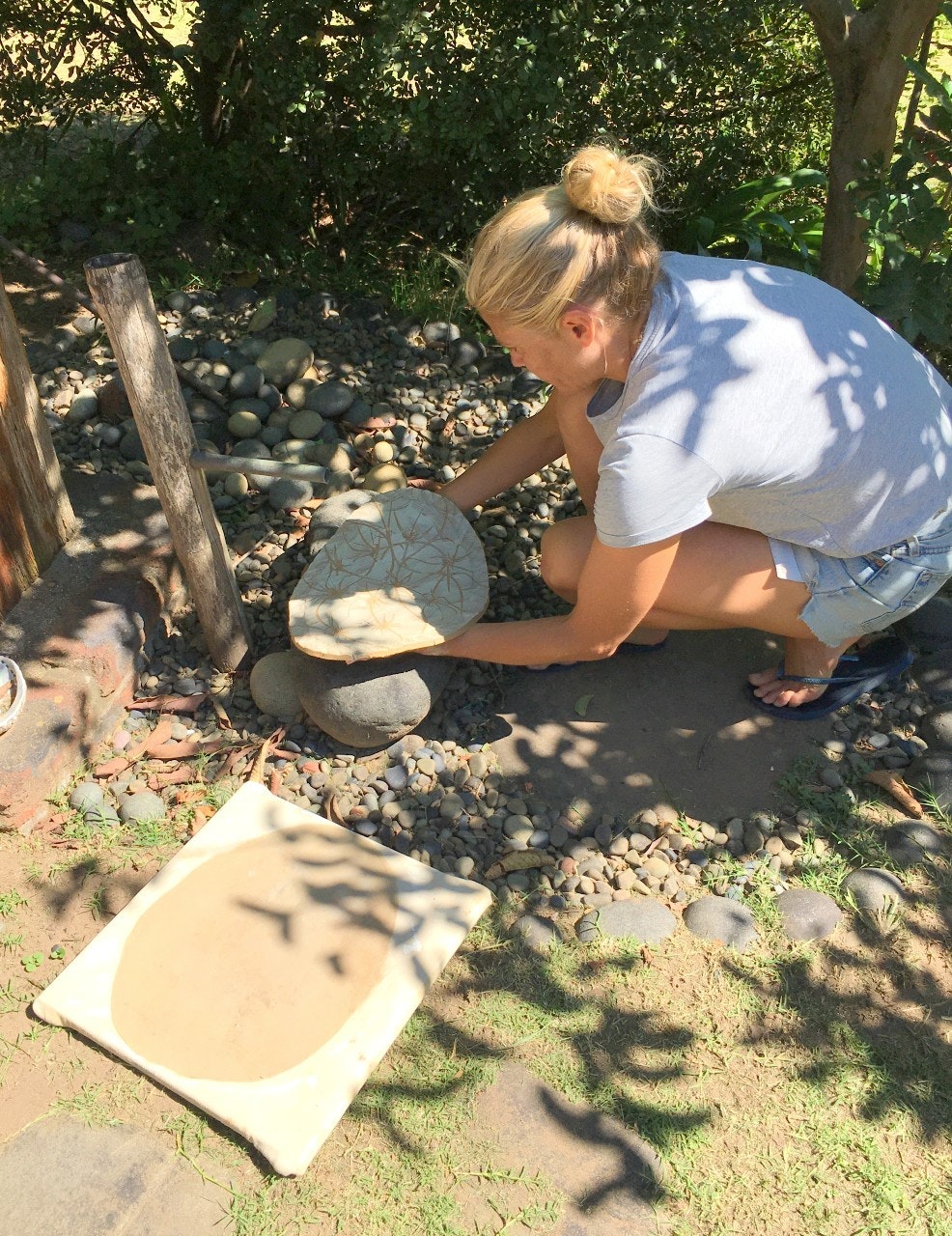 She is inspired by her environment, especially the seashore, rocks, sand, shells and driftwood. Locally sourced materials – black ilmenite sand from the beach, acacia thorn-wood ash and additions of the coarse local clay make her work unique.