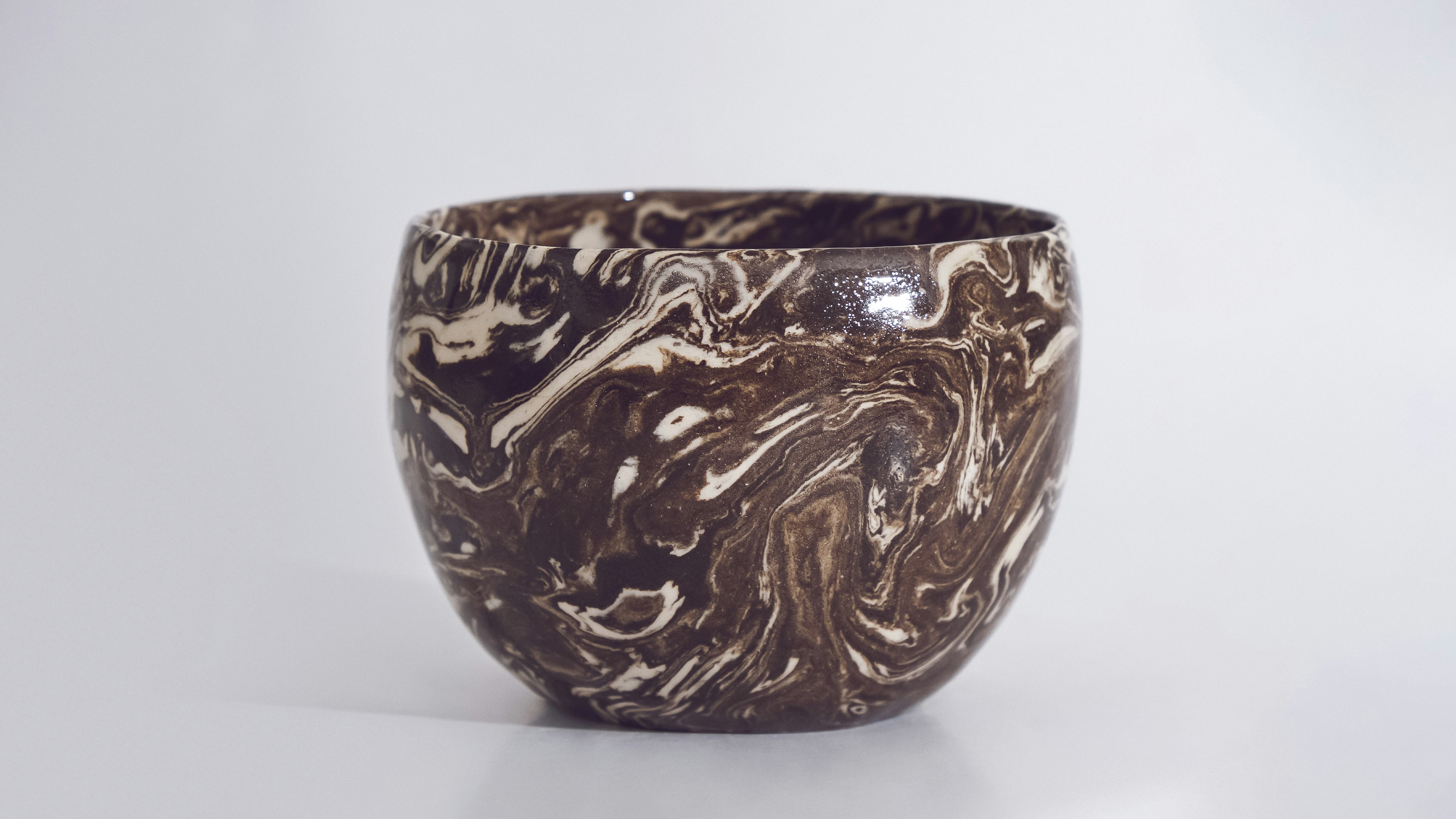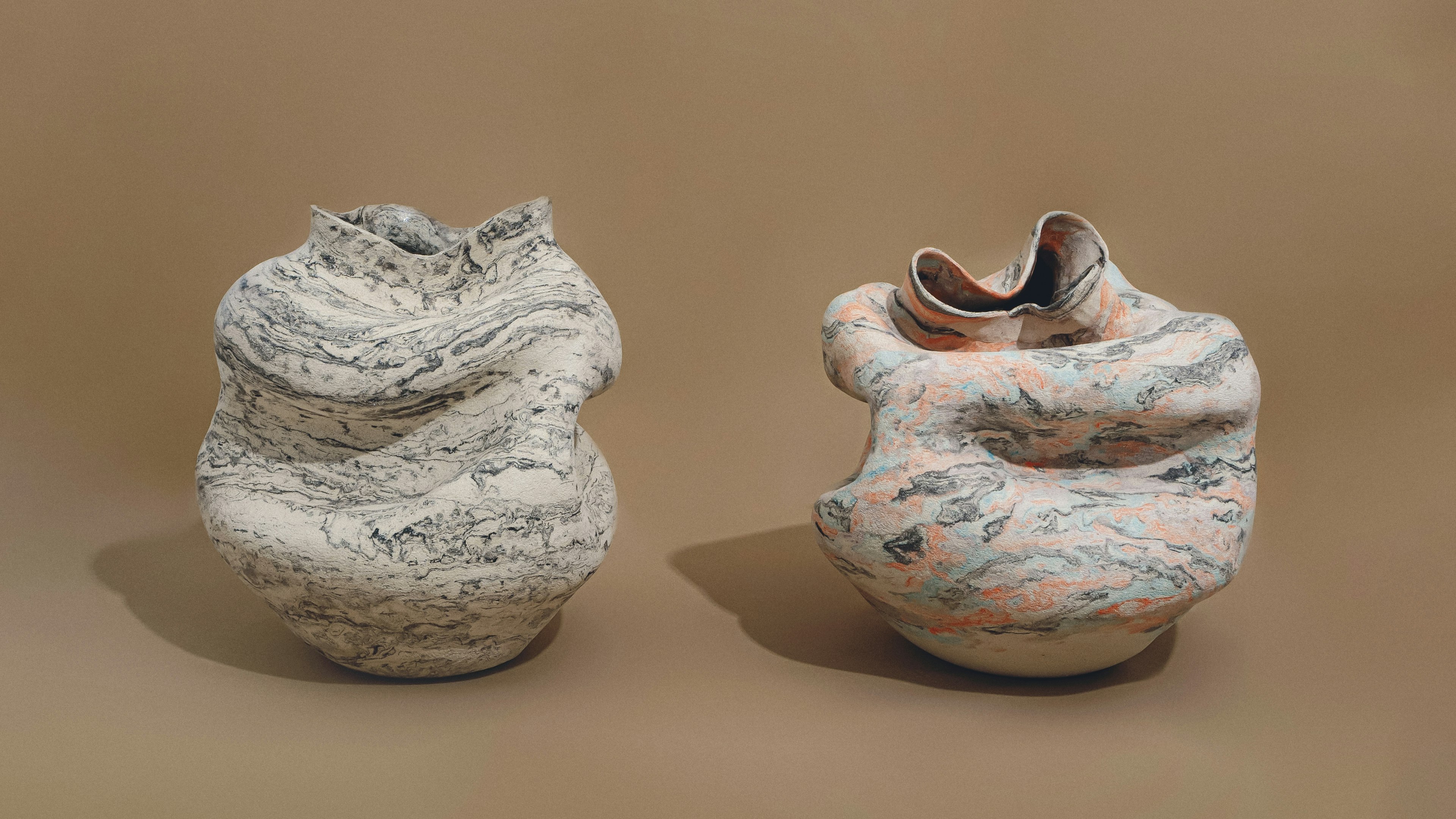 Her practice is grounded in slow, intentional methods: pinching, coiling, and slab building using minimal tools. She mixes her own clays and colors them with ceramic stains to create subtle marbled surfaces and wave-like patterns. Finishes often include terra sigillata slips, fired at stoneware temperatures and enriched with cobalt, iron, and chromium oxides, resulting in luminous, textured surfaces.