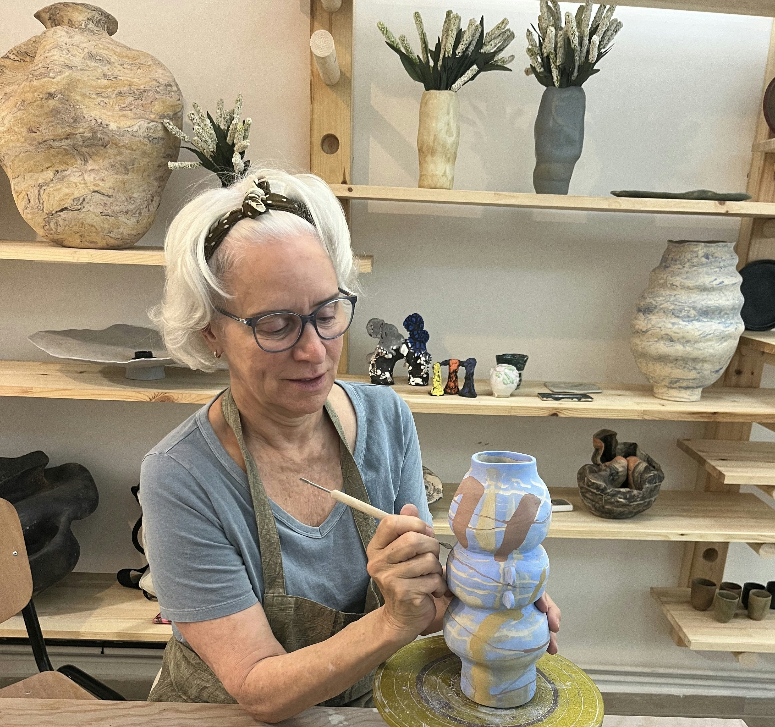 My work as an abstract painter left me yearning to explore three-dimensional space. Hand-building with clay felt like a natural fit—a more organic way to create. The gods (of Athens) led me to Maria, who proved to be a master of her craft. When I presented her with my grand decorative concepts, she gently reminded me that we must first begin with form. It was the most crucial, foundational lesson, Read more