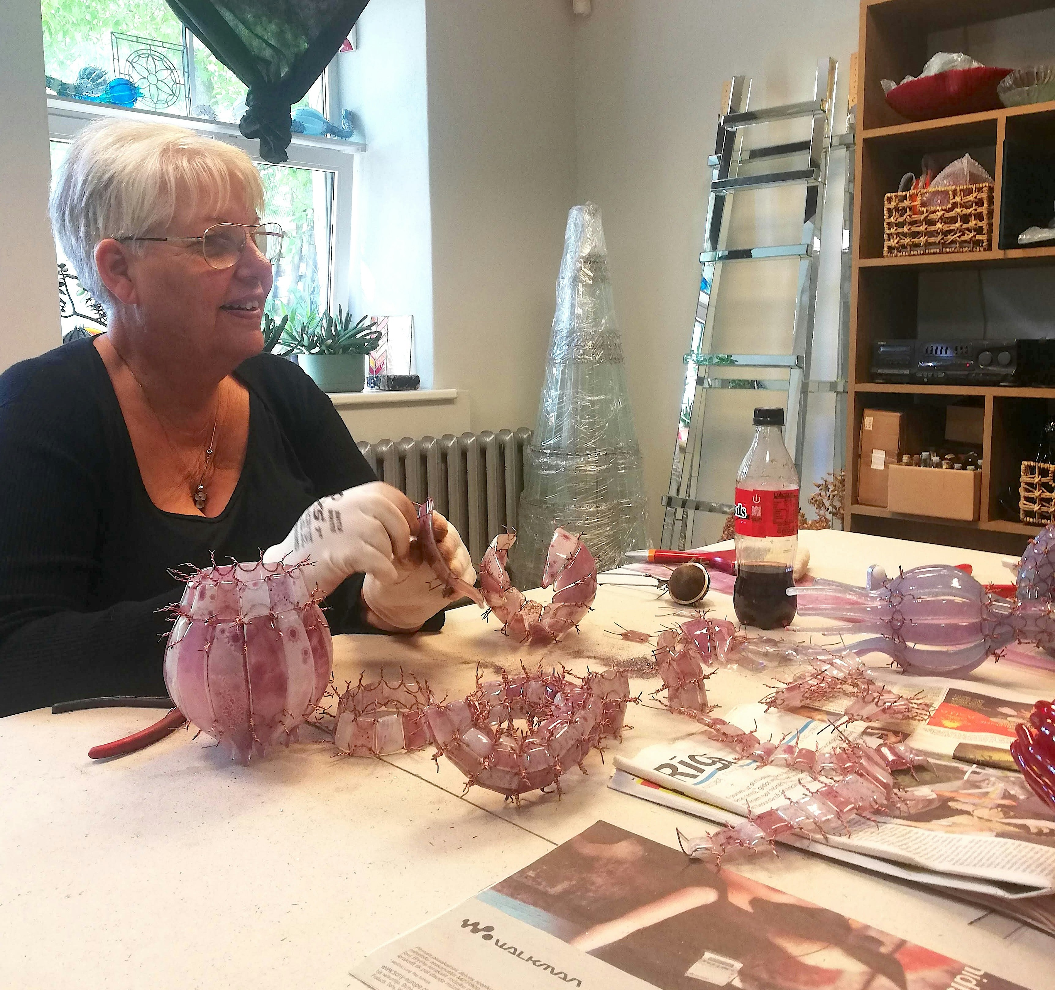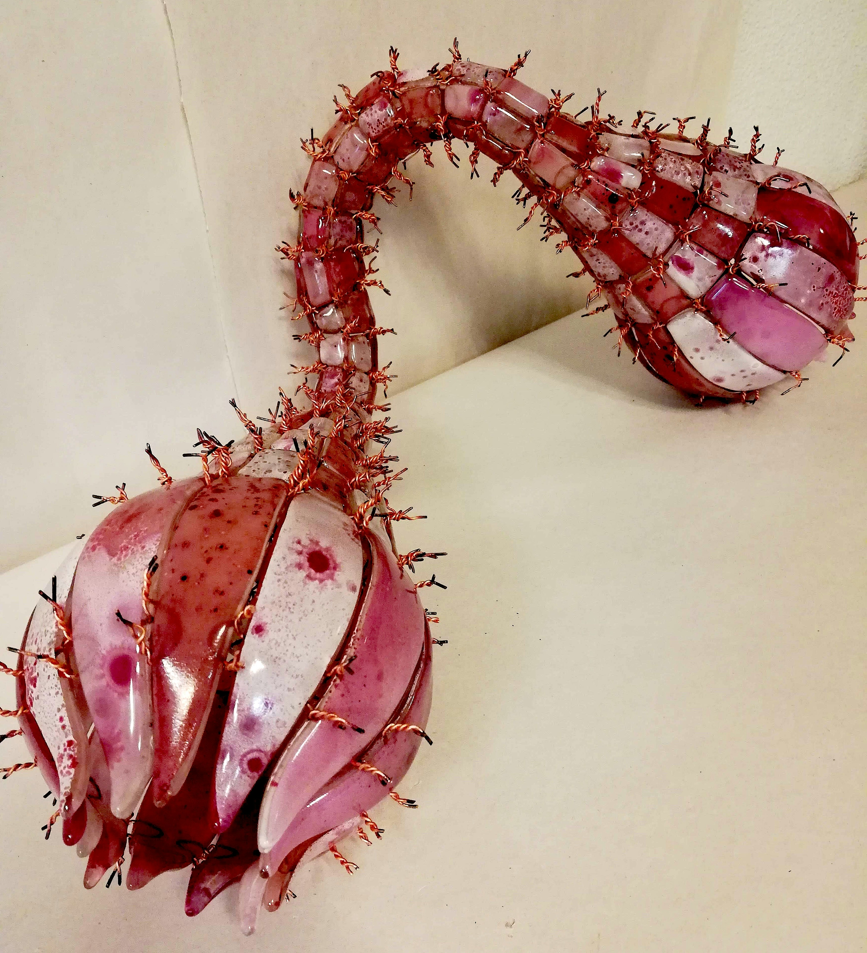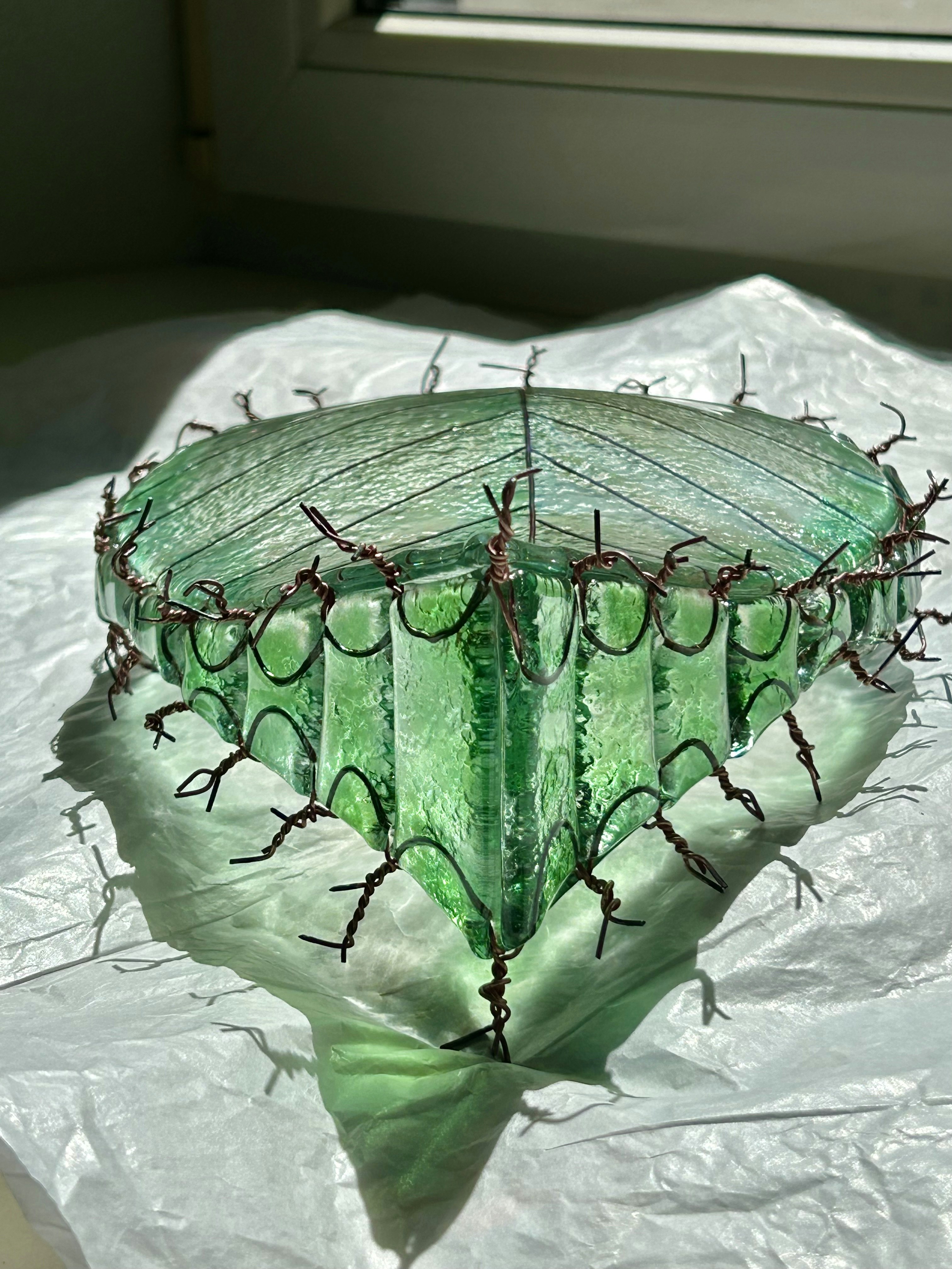 Her sculptures are geometric and simultaneously poetic. Like a miniature creative deity, she sculpts glass bodies and breathes souls into them, inviting viewers to engage with these alien life forms and contemplate the essence of consciousness and personhood. The meticulous process involves Marta dividing her designs into smaller parts, cutting and fusing them, and connecting the pieces with copper wire to achieve the desired shape.