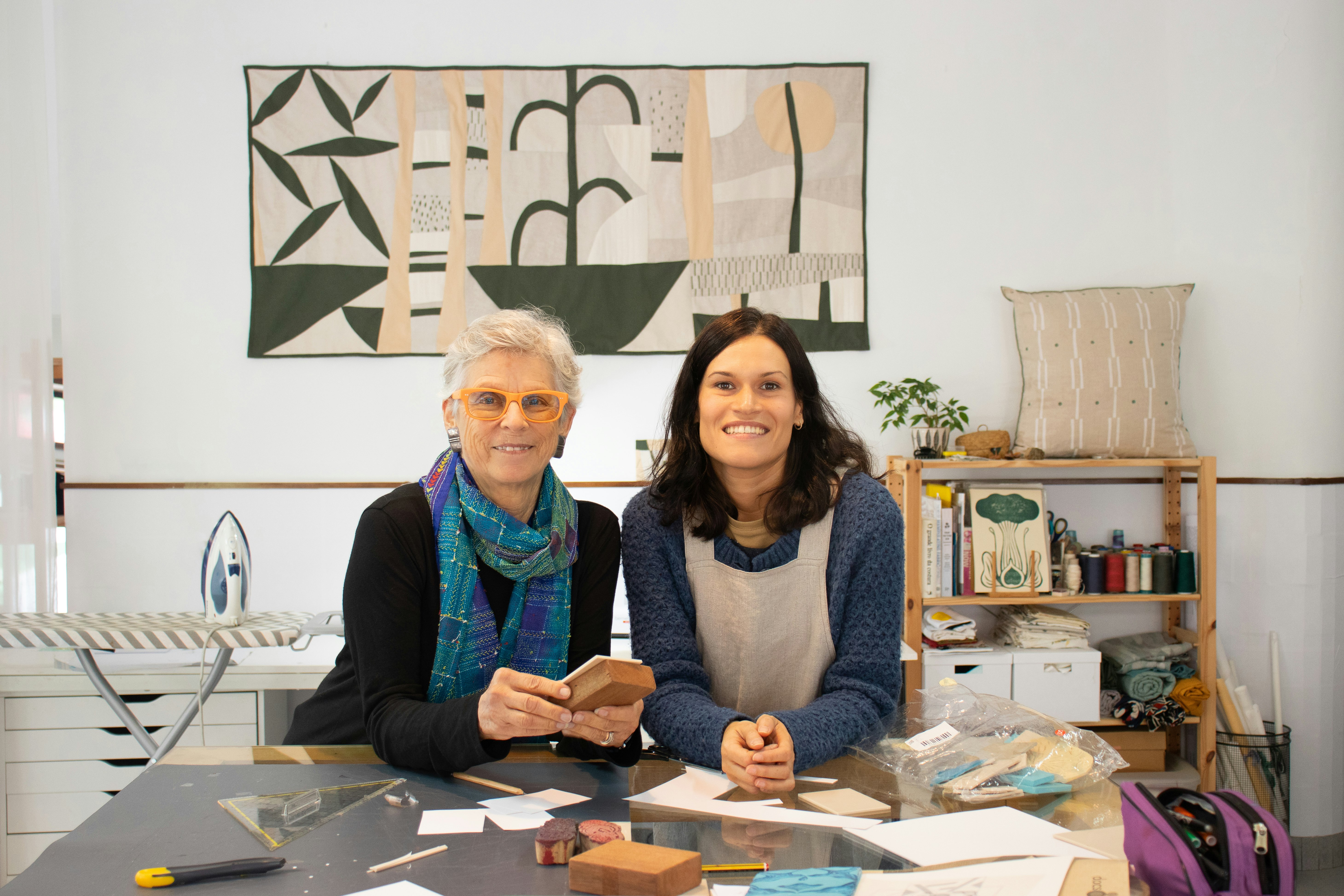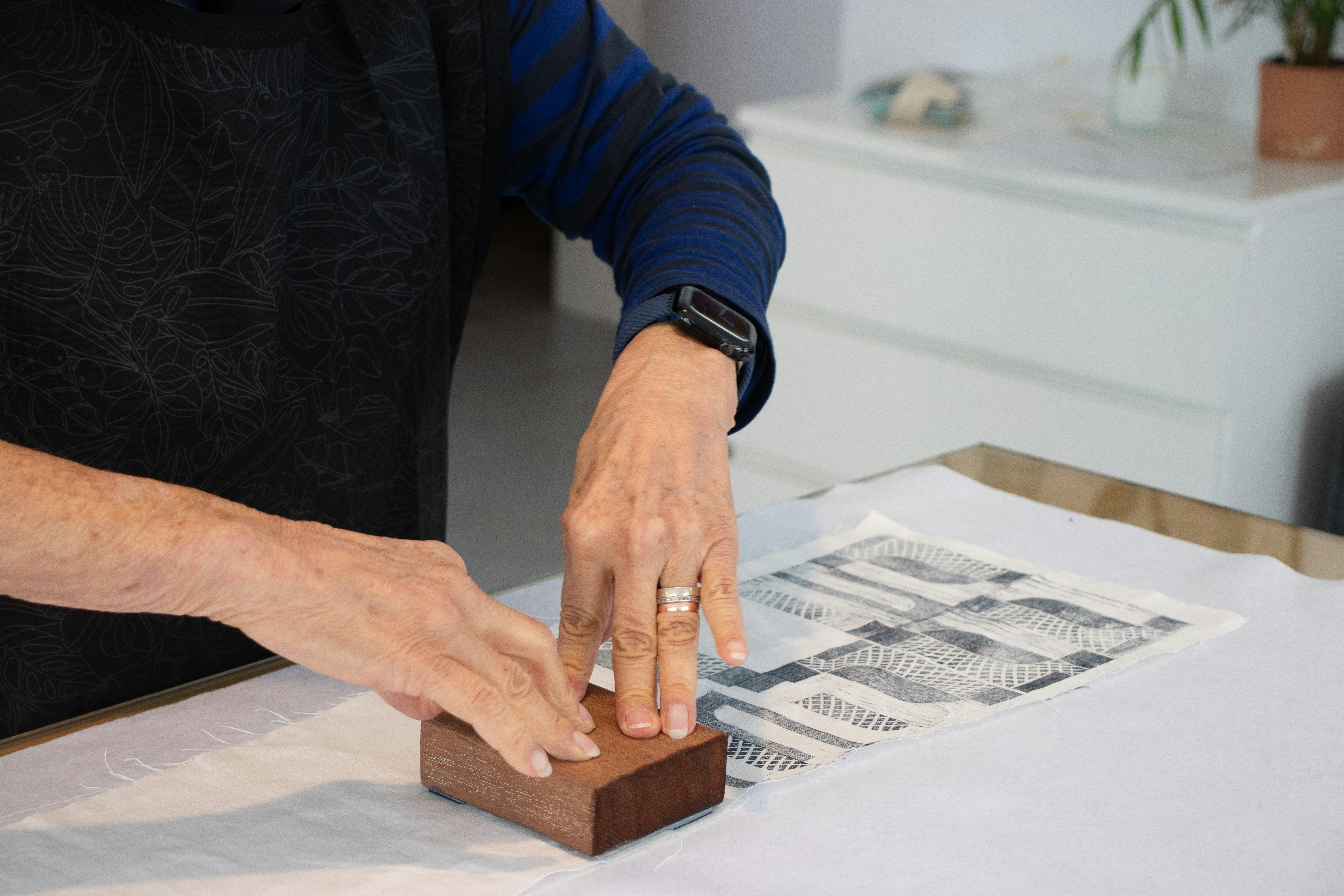 Describing her work as existing “between project and unpredictability,” Marta embraces that hand-printing allows no undo—each mark carries intention but also invites happy accidents. Over time, her practice has expanded to include quilting, patchwork, embroidery, and natural dyeing, adding a more sculptural and artistic dimension to her work.