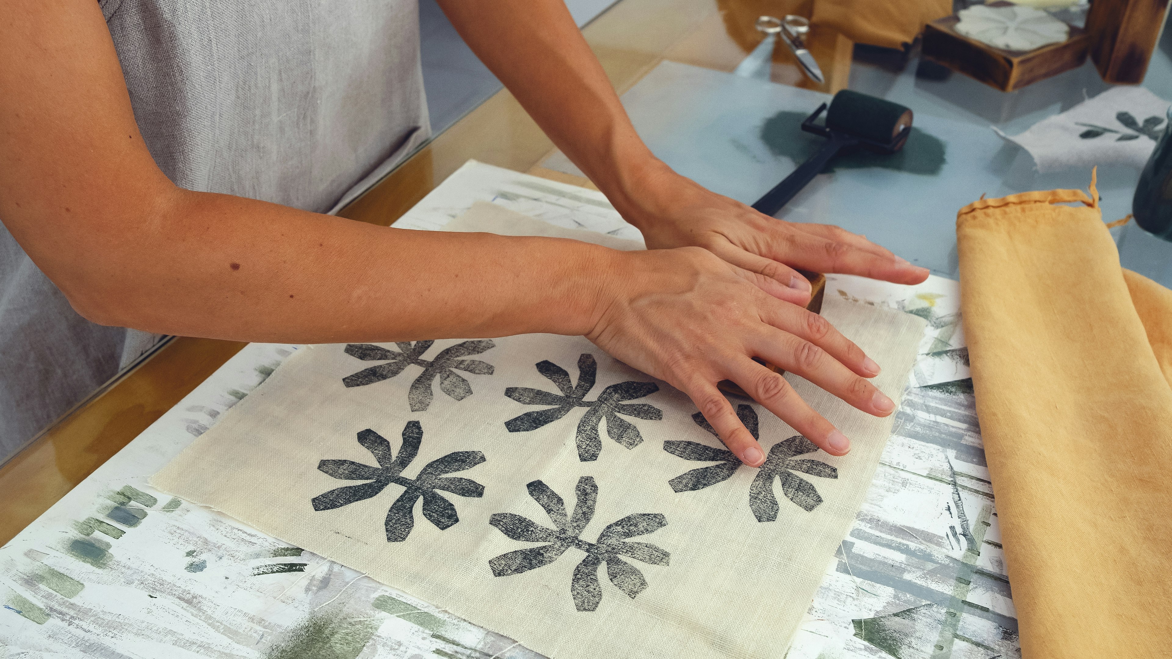 Marta’s process is rooted in slow, manual techniques. Using hand-carved wooden blocks, she prints illustrative botanical motifs onto natural fabrics. She also layers color and texture through hand-cut stencils and freehand brush painting. This handcrafted approach ensures every piece is unique, shaped by the natural variation and spontaneity of the process. Marta often enriches her textiles with earthy tones derived from botanical dyes, such as onion skins.