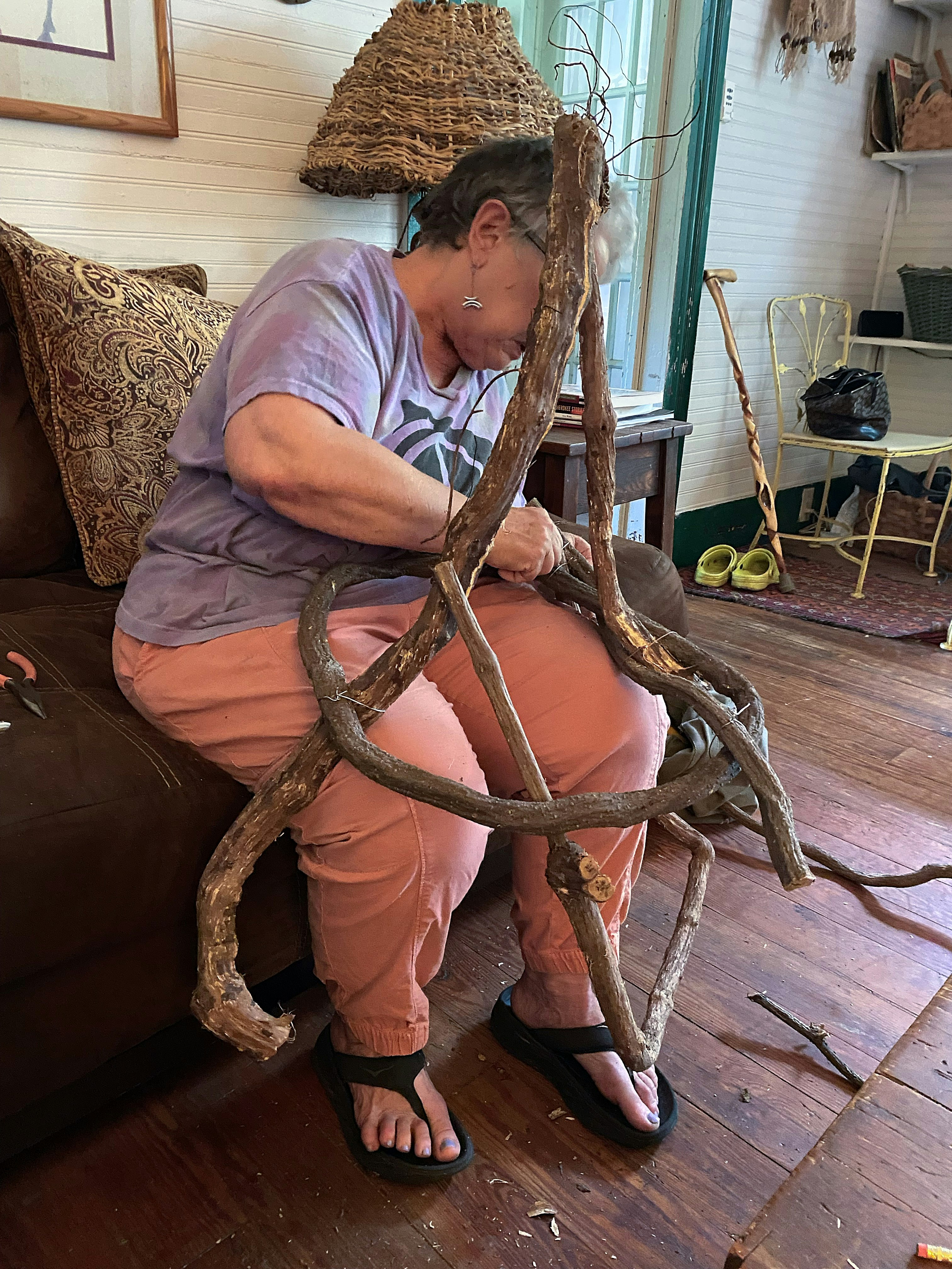 She is known for her work with Kudzu, an imported vine growing 12 inches a day before frost, to make paper and coiled baskets, sculptures, and lampshades. In addition, she weaves cloth from the green vines, a technique she learned from a Japanese couple who have been making fabric from Kudzu for over 70 years.