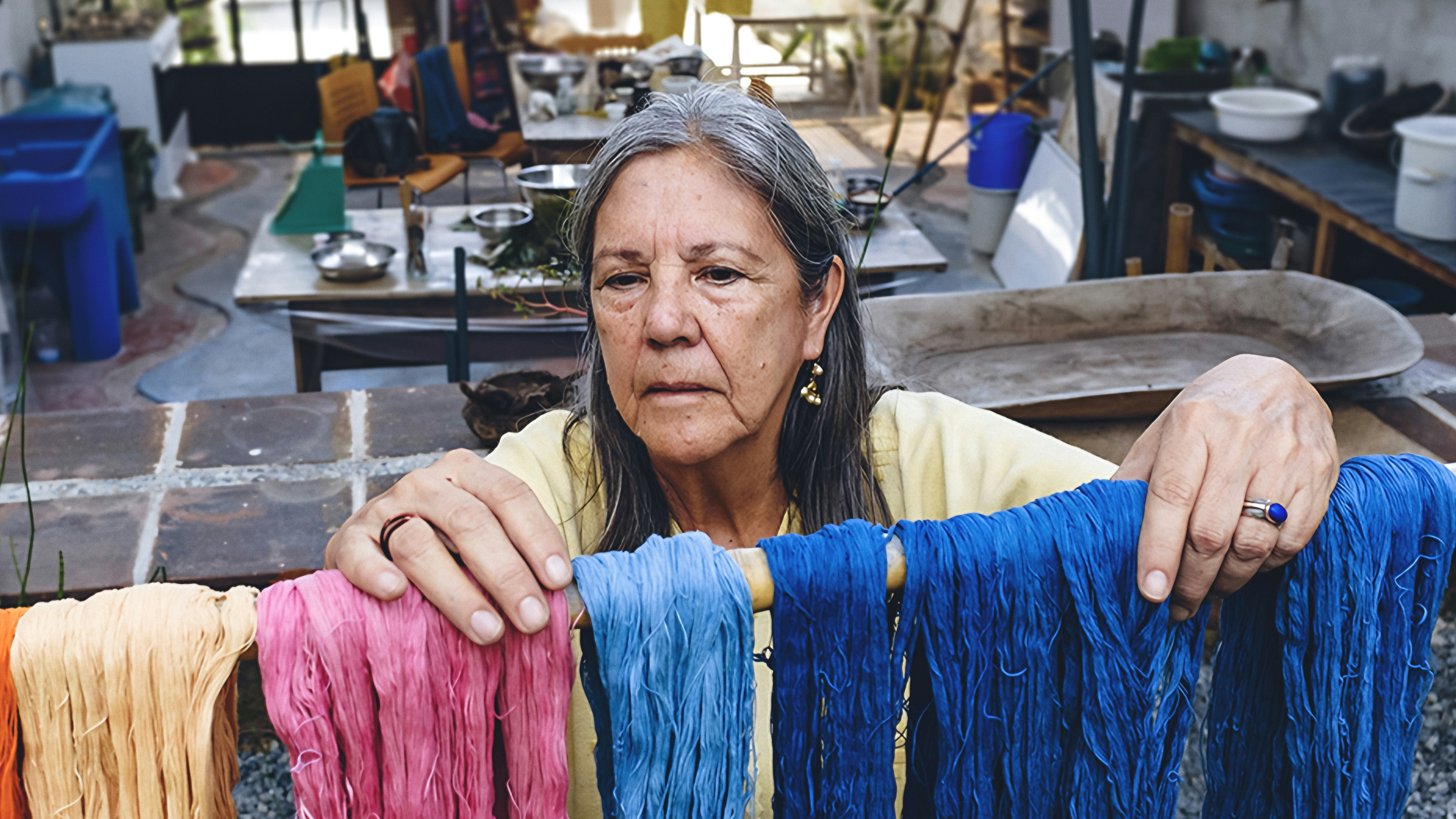 At the core of Olga’s practice is her mastery of natural plant dyes and pigments, particularly indigo, and plants like bananas and tannins. She works closely with indigenous weavers, many of whom craft from their homes, using natural fibers like linen, hemp, cotton, and jute. Olga oversees every step of the process—from foraging local plants for dyes to mordanting fibers to creating color combinations and motifs that reflect Mayan heritage.