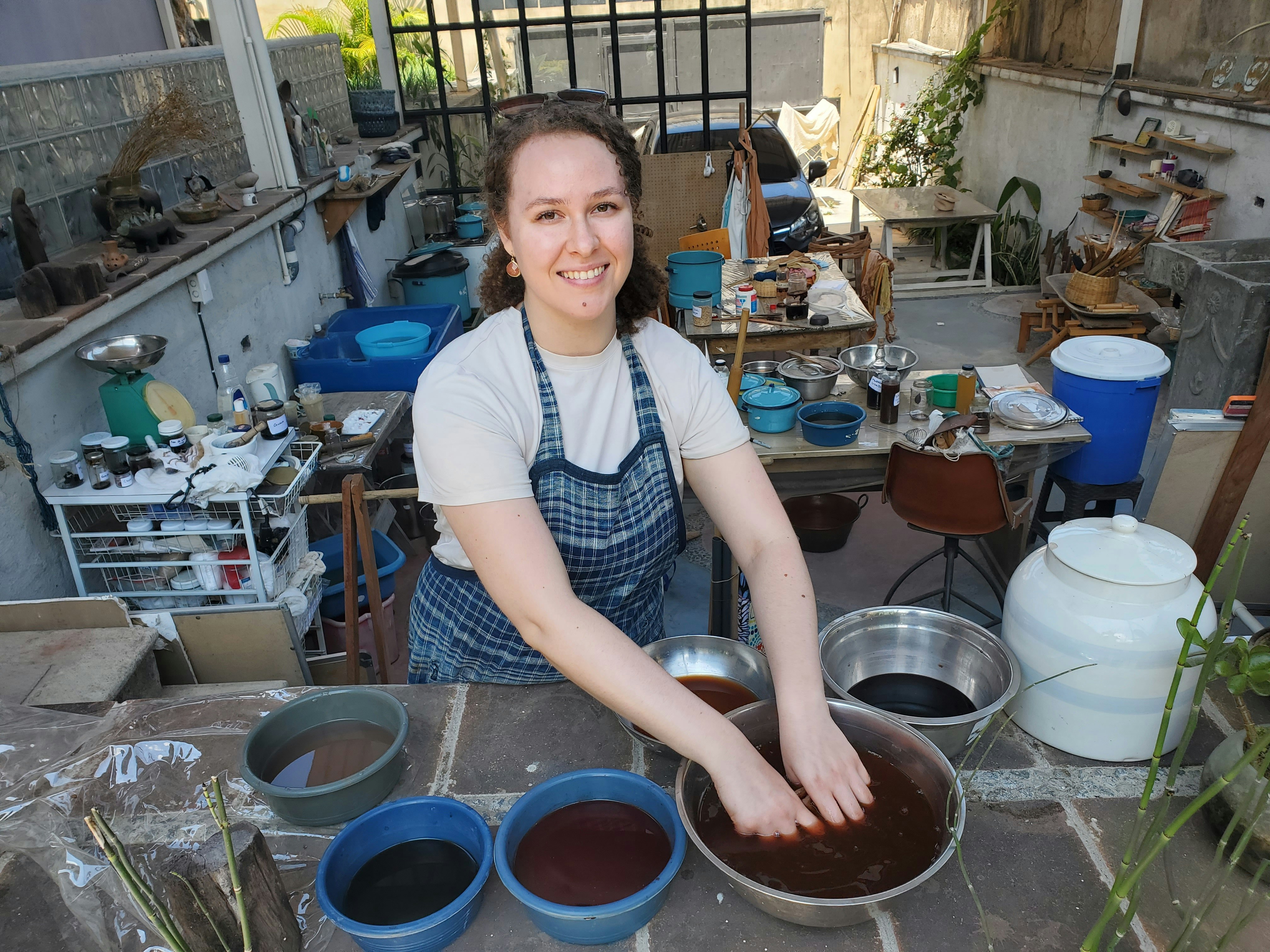 - Work with indigo as a vat dye and create the mystical Maya Blue, experimenting with tanning dyes as mordants and observing color changes under sunlight.