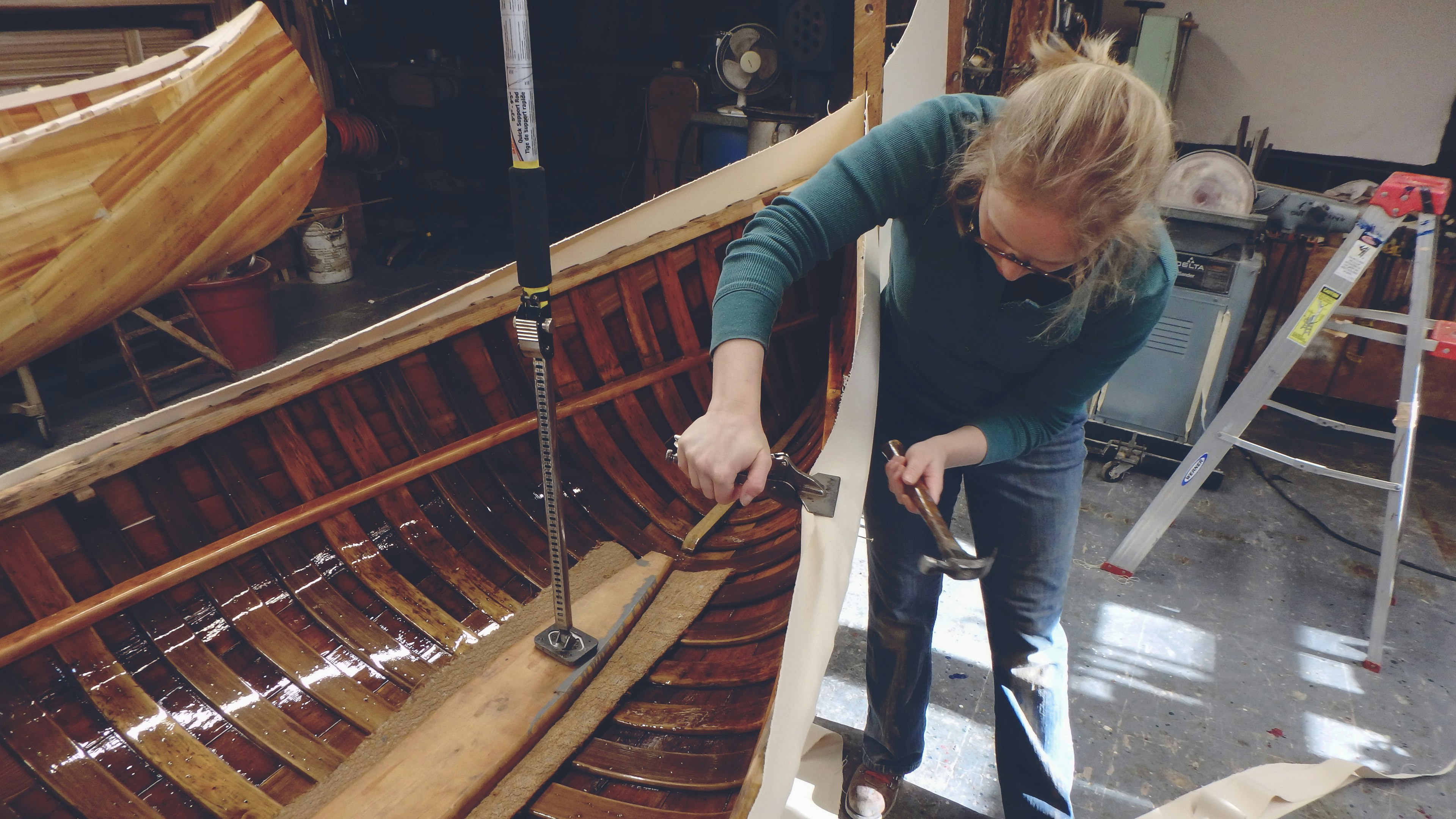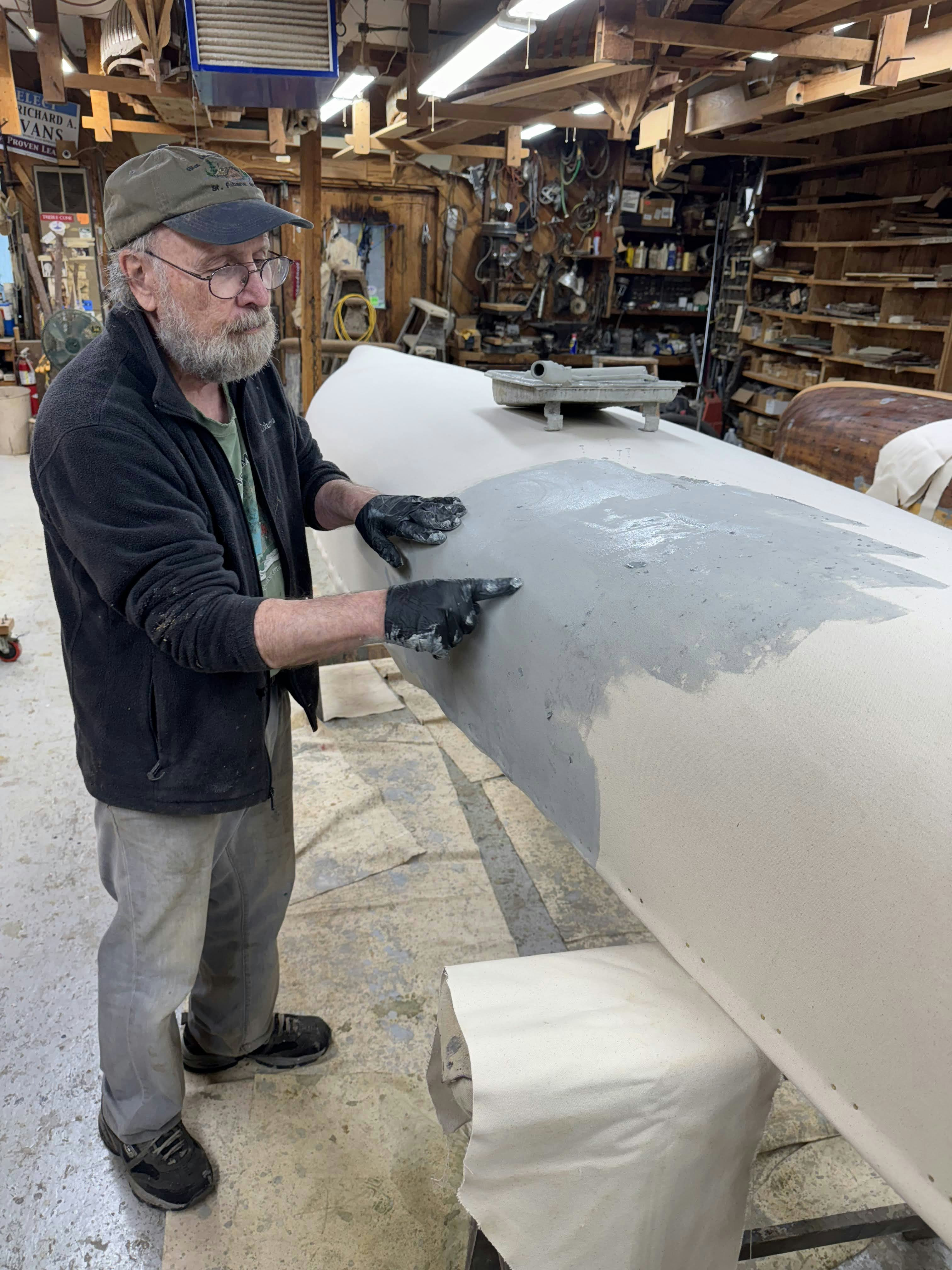 - Treating the hull with linseed oil and covering with #10-weight canvas before filling with the shop’s canvas filler.