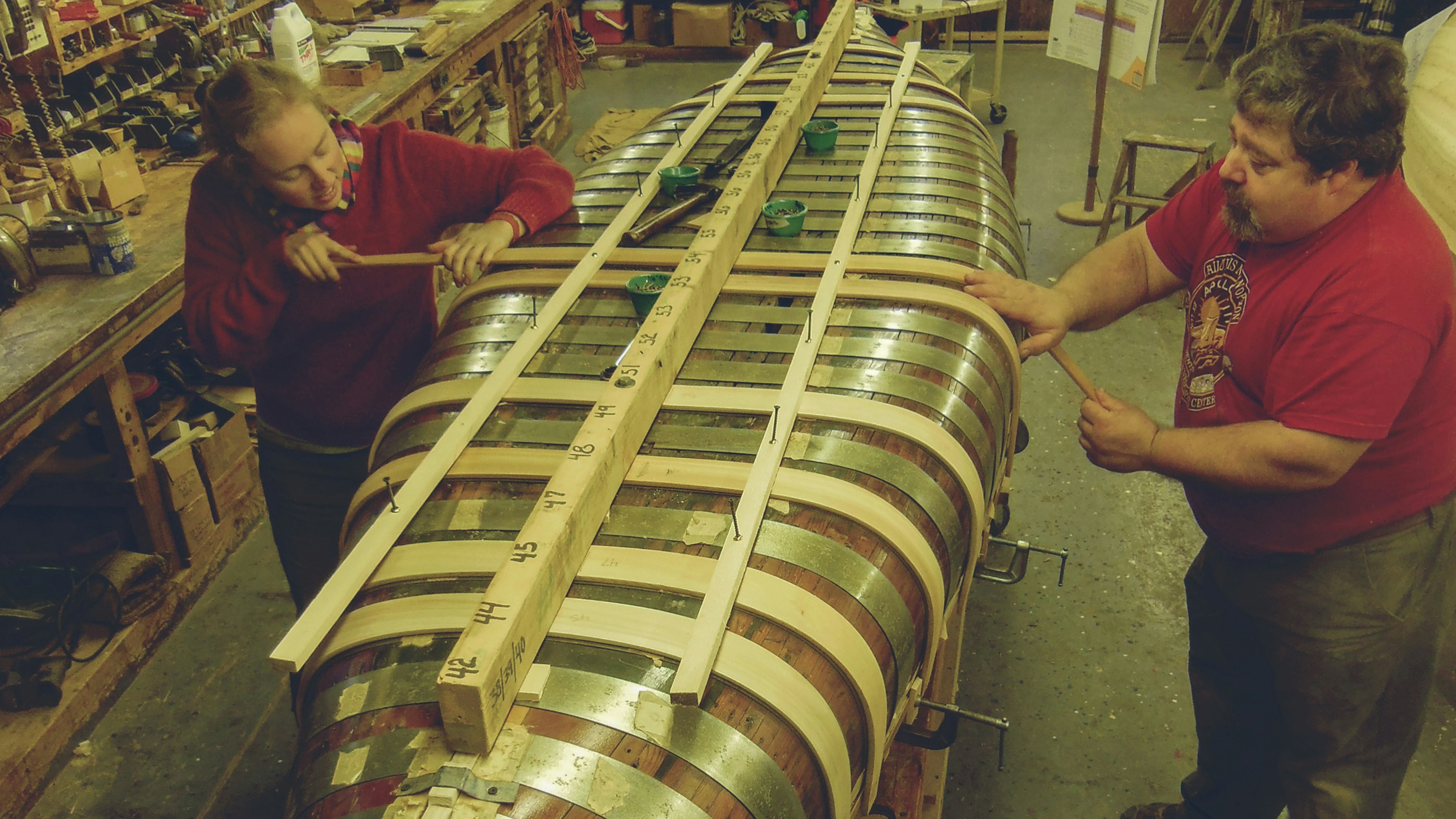 - Fitting the thin planking across the ribs to create the hull and removing the hull from the mold.