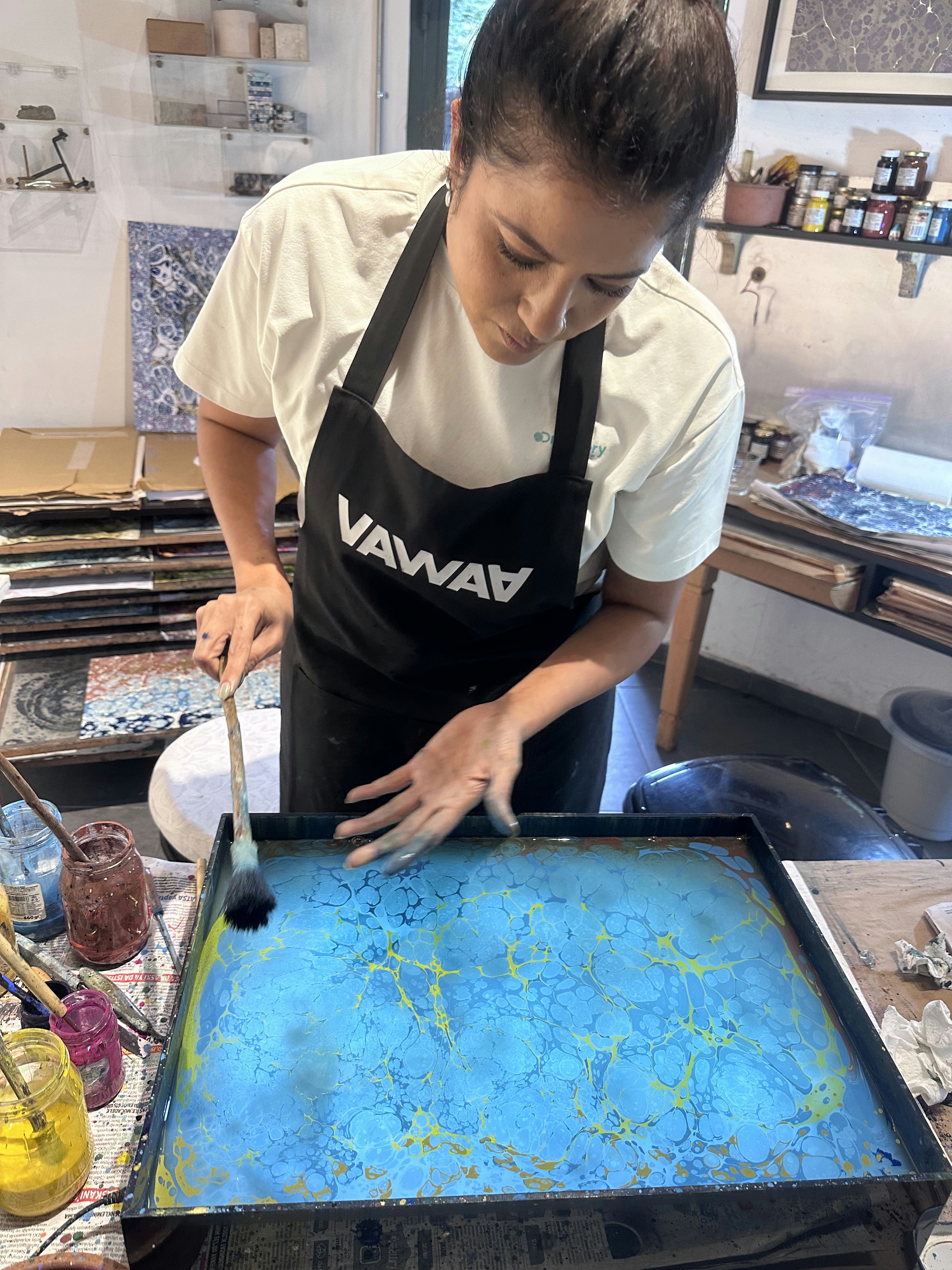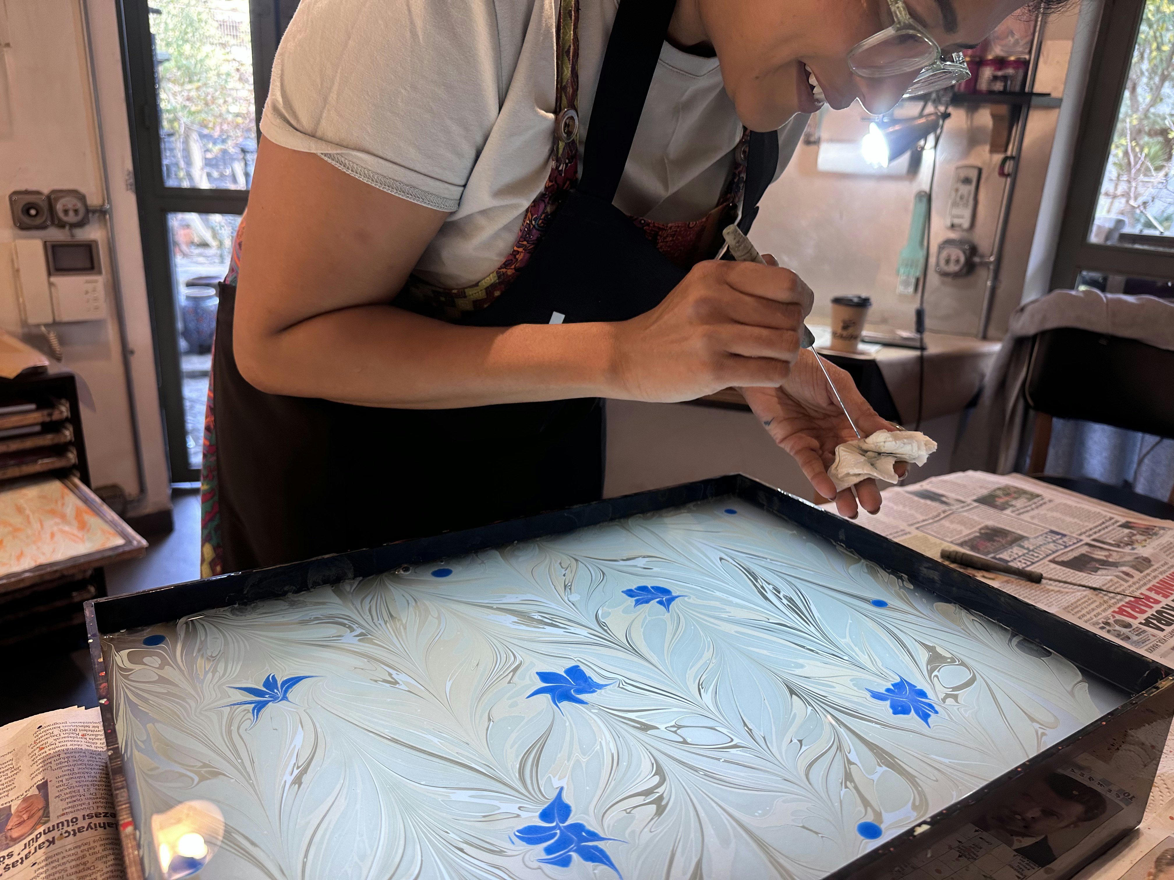 I travelled to Istanbul to learn the art of Ebru and spent five deeply enriching days being tutored by her. From the very beginning, Silvia embodied warmth, kindness, and an extraordinary depth of technical experience, both in Ebru and in teaching. Despite her mastery, she remained profoundly humble and down to earth.