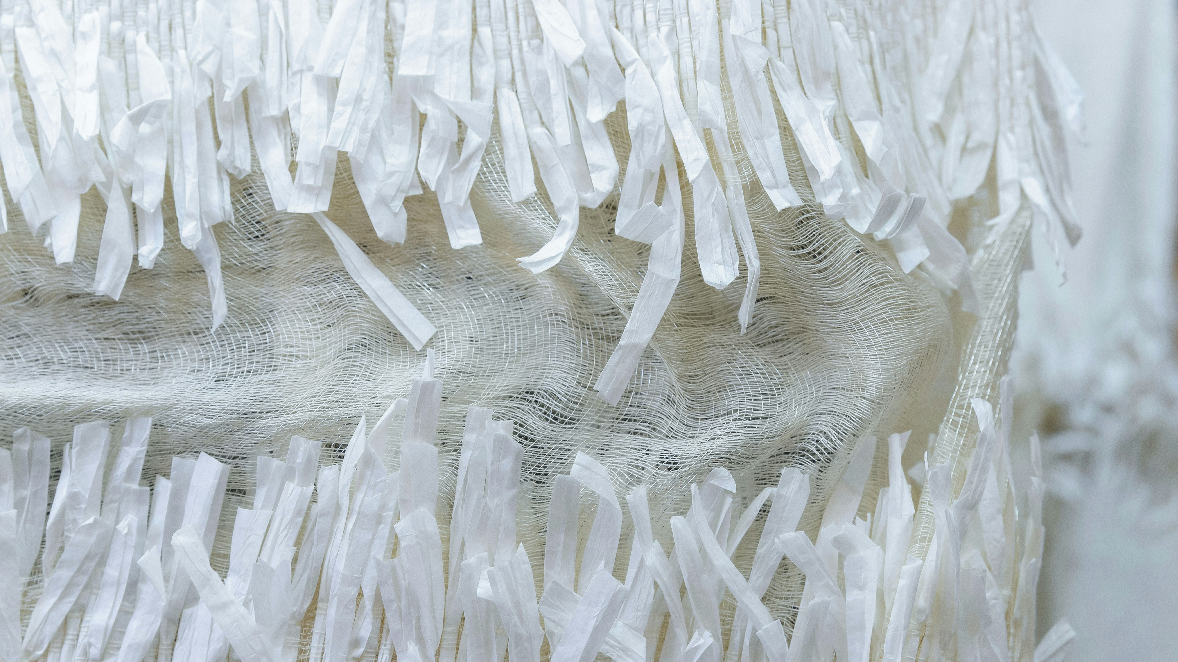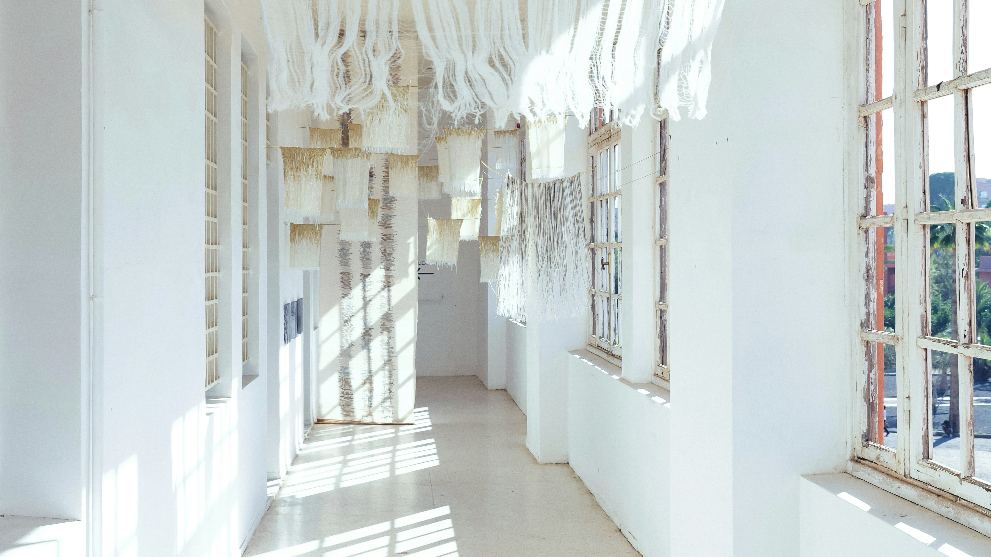 Drawing inspiration from North African nomadic heritage, she works with natural, recycled, and unexpected materials like wool, raffia, hemp, plastic tape, leather, copper wire, feathers, and stones. She sources these from Marrakech’s medina and surrounding nature, then experiments on her eight looms to create new textures and visual languages. Her work draws on ancestral Moroccan techniques such as loom embroidery, lace, and complex stripe weaving, which she restores and reinterprets in a modern context. Incorporating photography and sculptural elements, her textiles act like soft architecture—defining space, filtering light, and inviting sensory connection.