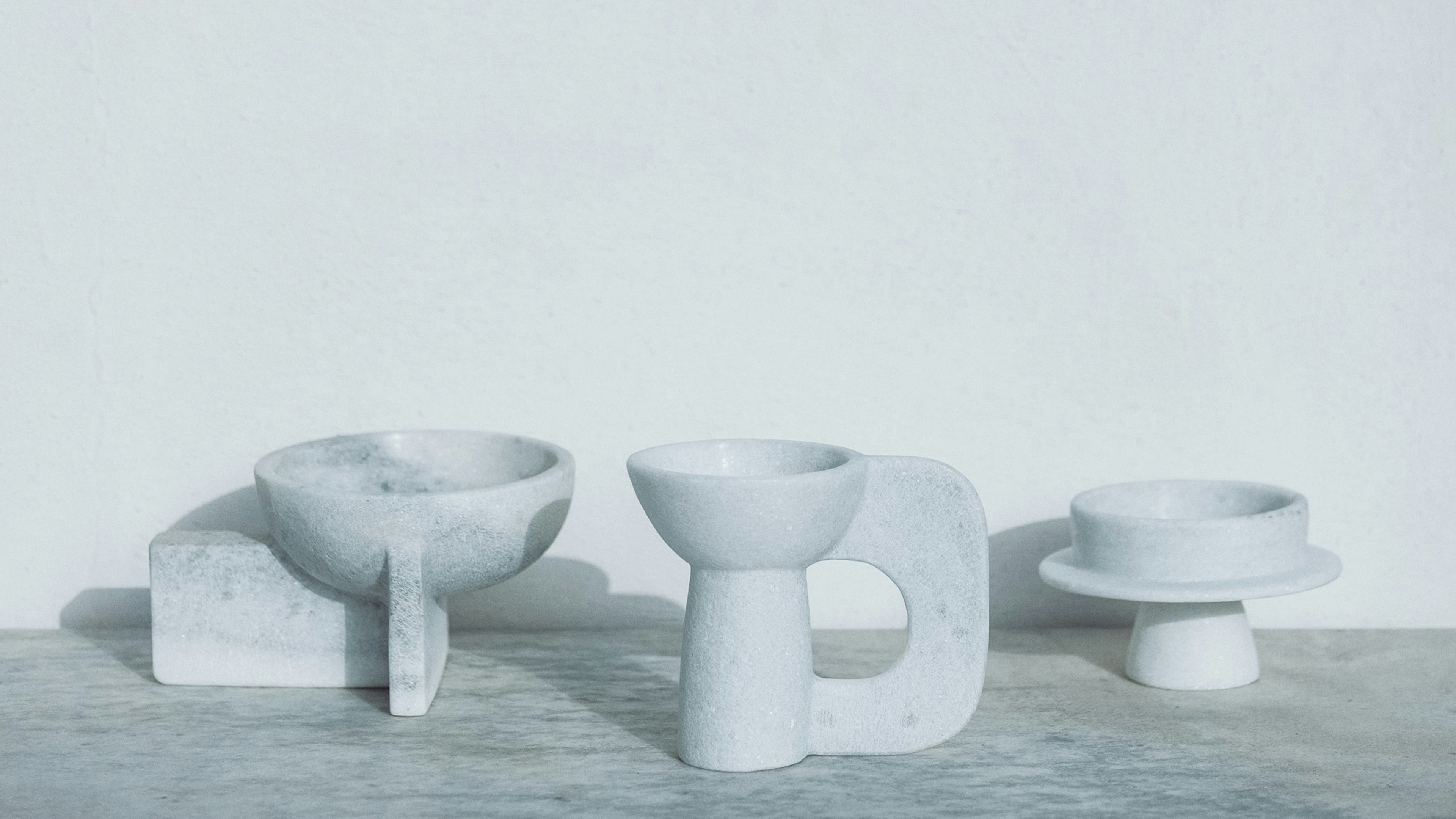 Working exclusively with local Naxian marble, a luminous, coarse-grained stone quarried nearby, Tom selects each block by hand. He shapes them using diamond discs, flex tools, hand files, and sandpaper, deliberately avoiding CNC machines, acid treatments, or polish. Instead, he honors the raw vitality of the stone, leaving tool marks visible and surfaces subtly textured, allowing light to shimmer across their facets.