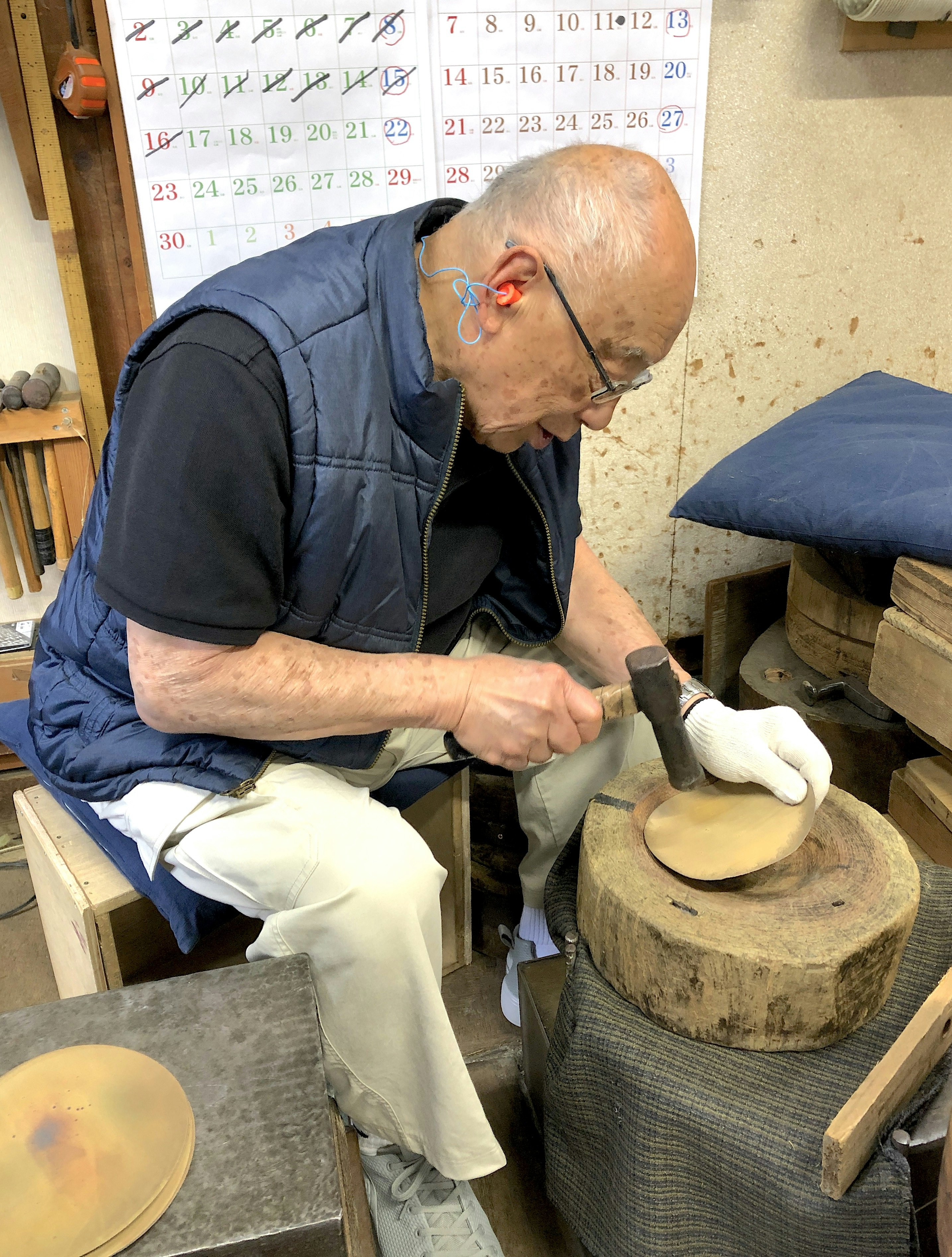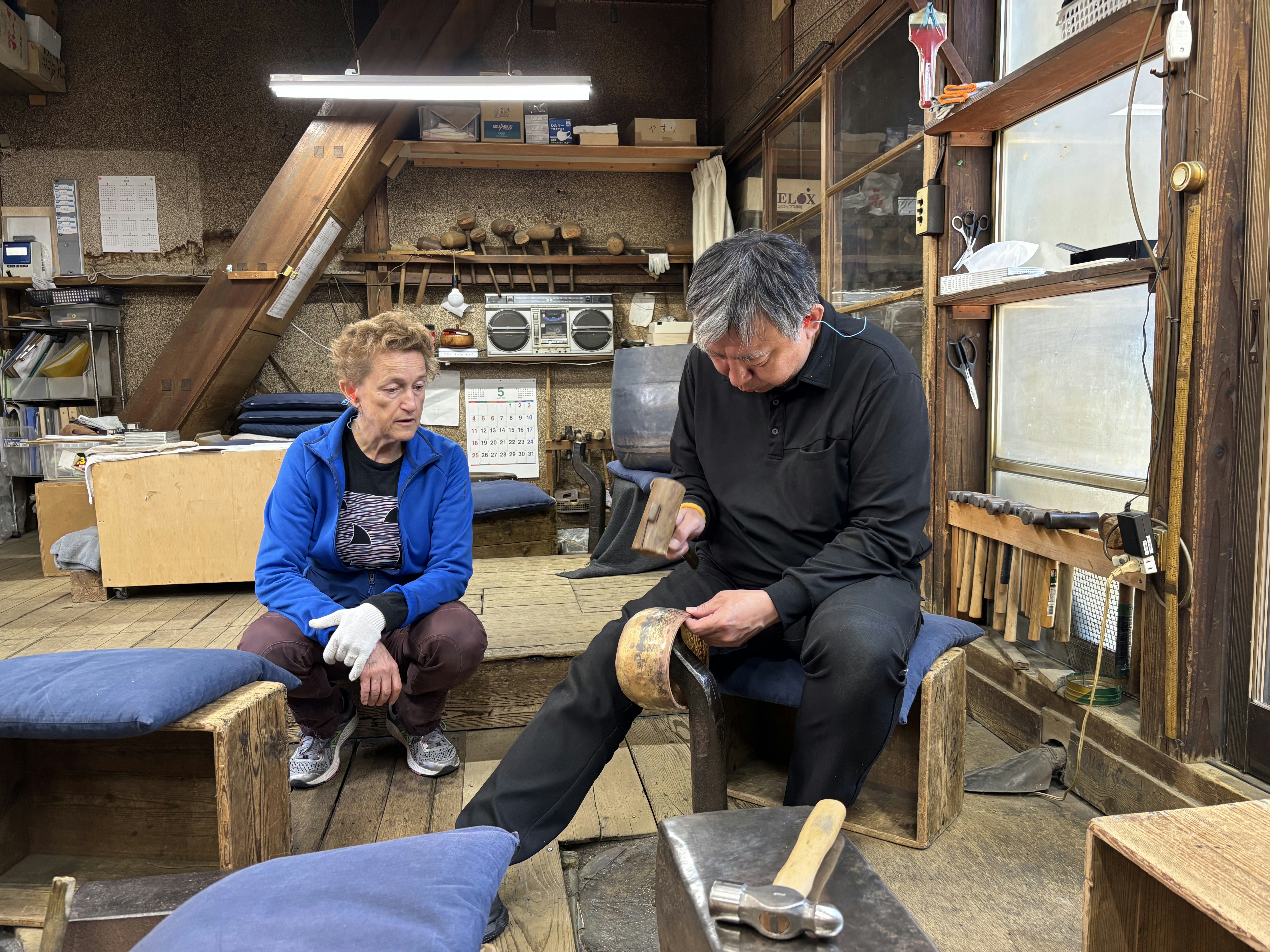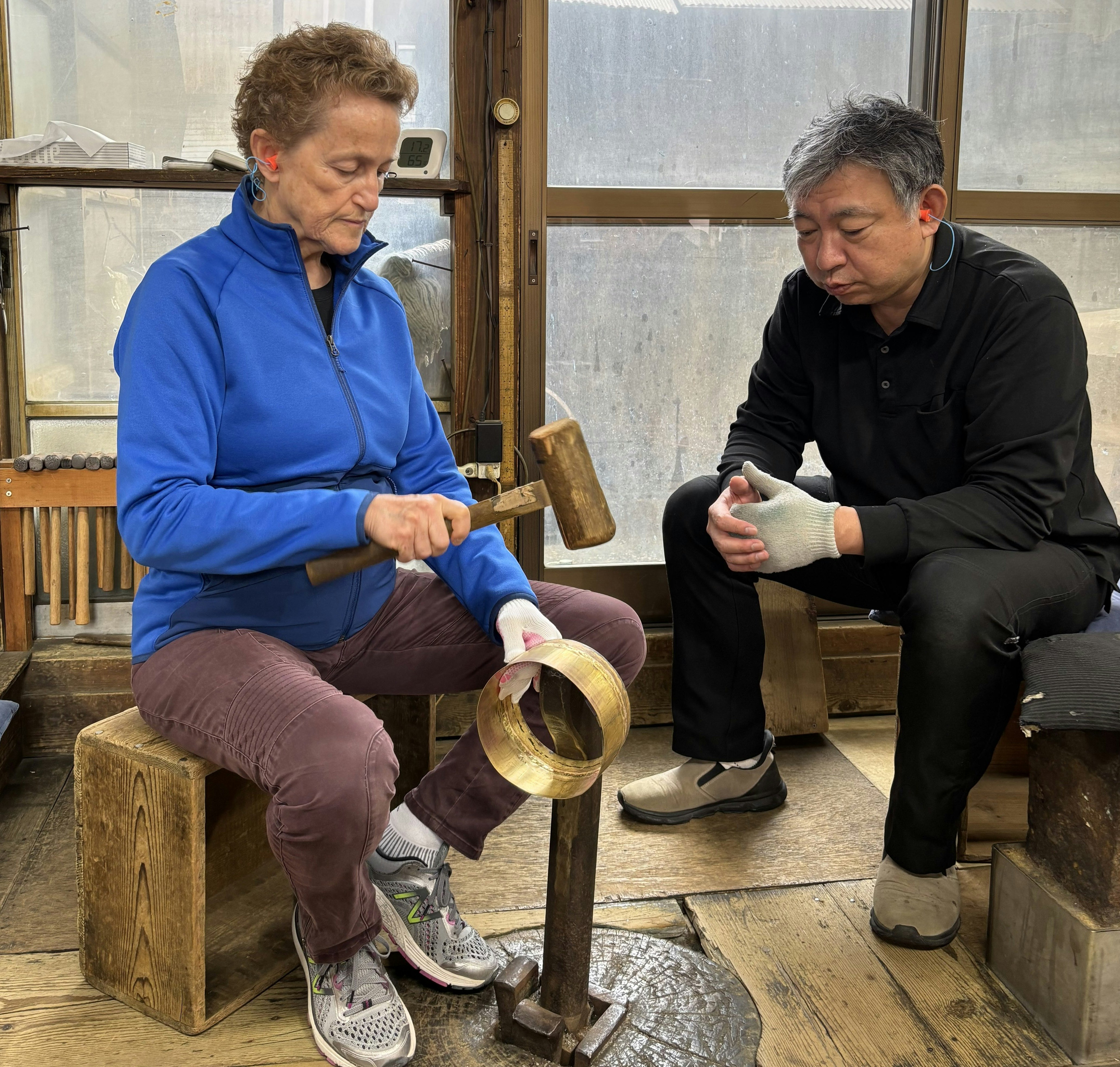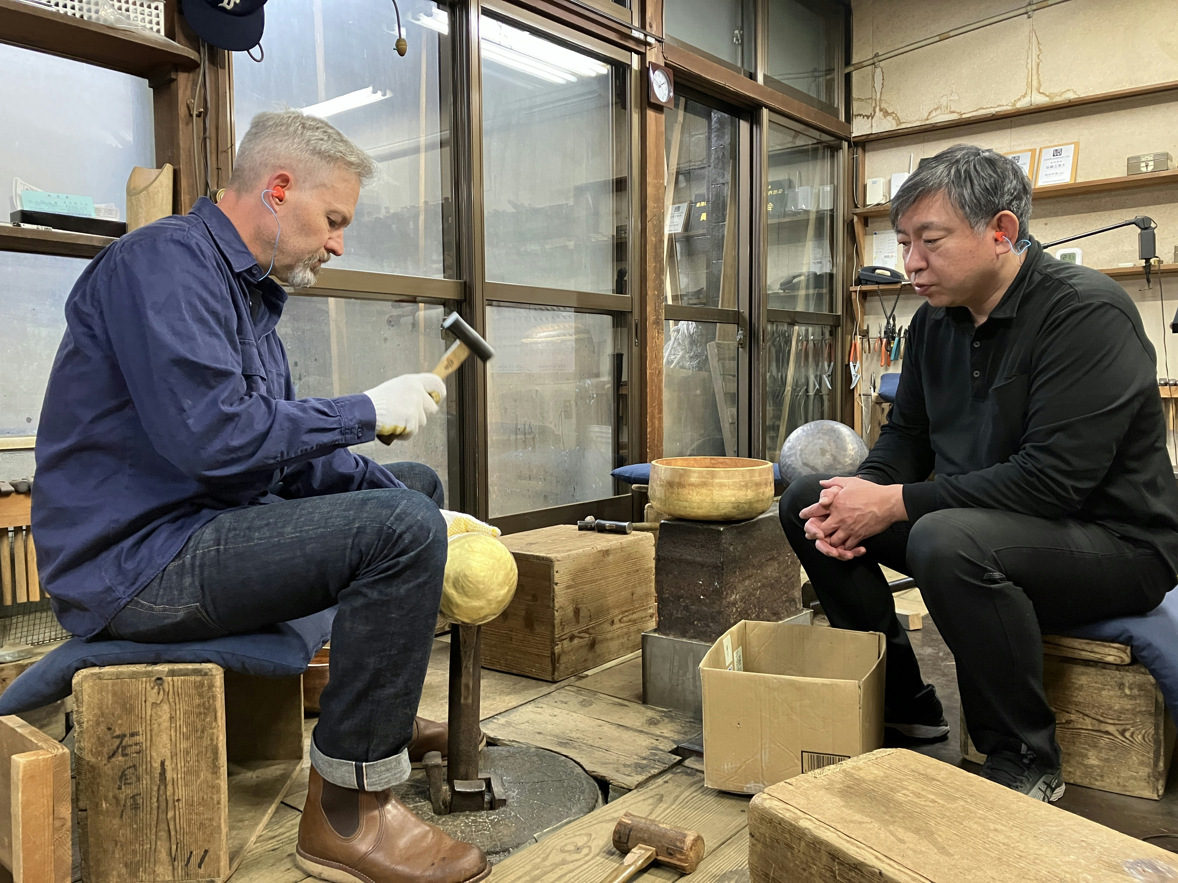 - Fine-tuning the sound of the bell (with assistance by Yoshinori and his practiced ear).
