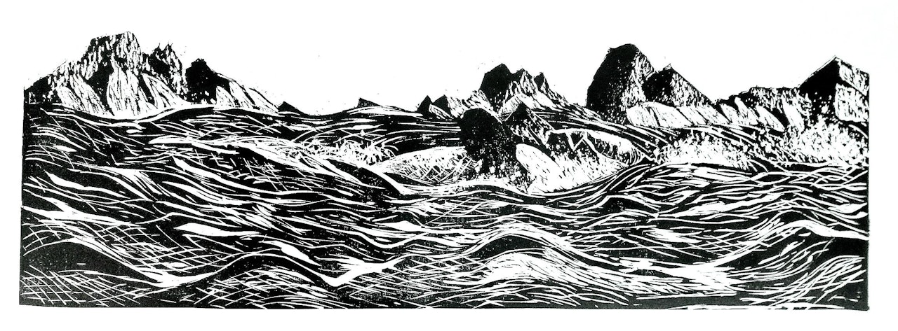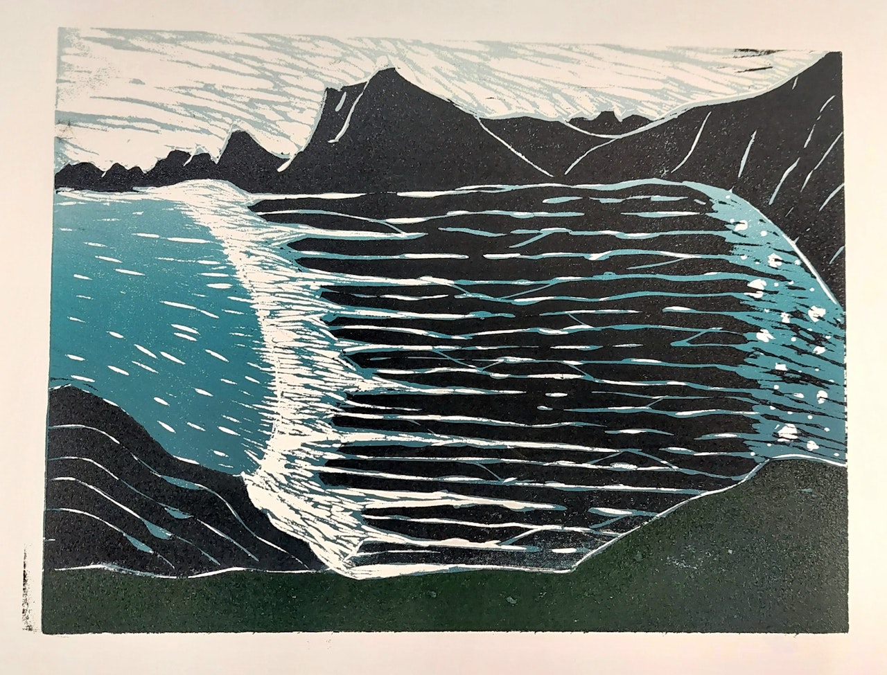 This was our 5th VAWAA. Woodblock printing was high on our list especially after our printmaking workshop with Roser in Barcelona. The combination of ocean, cliffs and woodblock was one we could not resist. We wanted to learn the basics of how to carve, how to represent scenes using one or several blocks, and how to ink these to obtain different outcomes. We were not disappointed as we learned a lot, succeeded in producing some nice artwork after only a few days, and decided to get the necessary tools to continue carving once back home.
